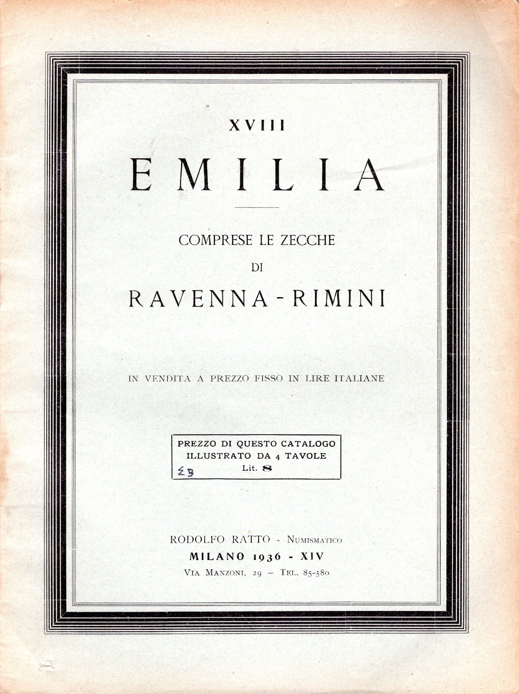 RATTO R. - Listino a prezzi fissi N. XVIII. Milano, 1936. Emilia comprese le zecche di Ravenna – Rimini. pp. 19, nn. 749, tavv. 4. Ril. editoriale, raro Rossi, 2912