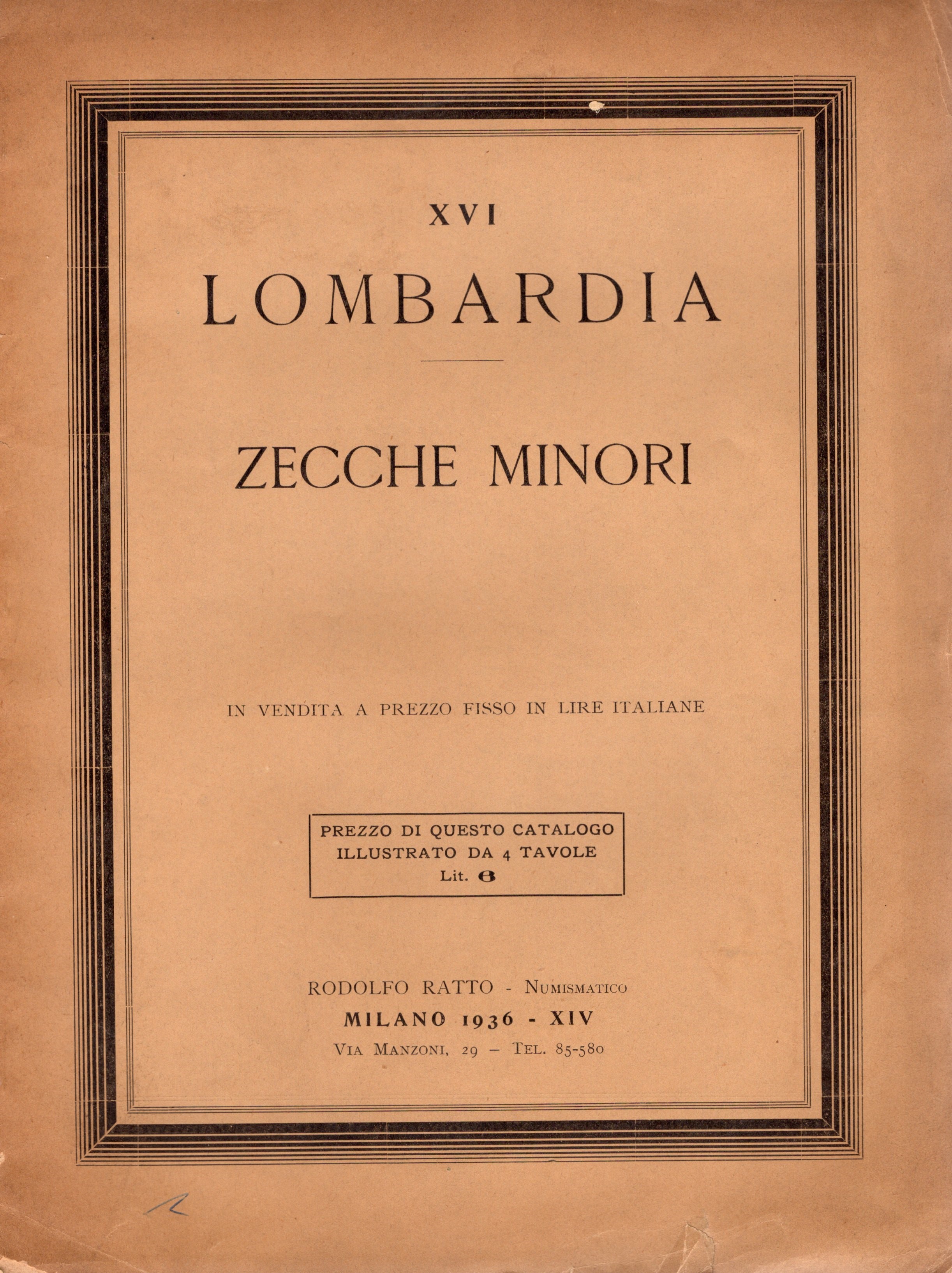RATTO R. – Milano, 1936. Fascicolo XVI. A prezzi fissi Lombardia – Zecche minori. Pp. 12, nn. 460, tavv. 4. Ril. ed buono stato, raro.Rossi,2912
