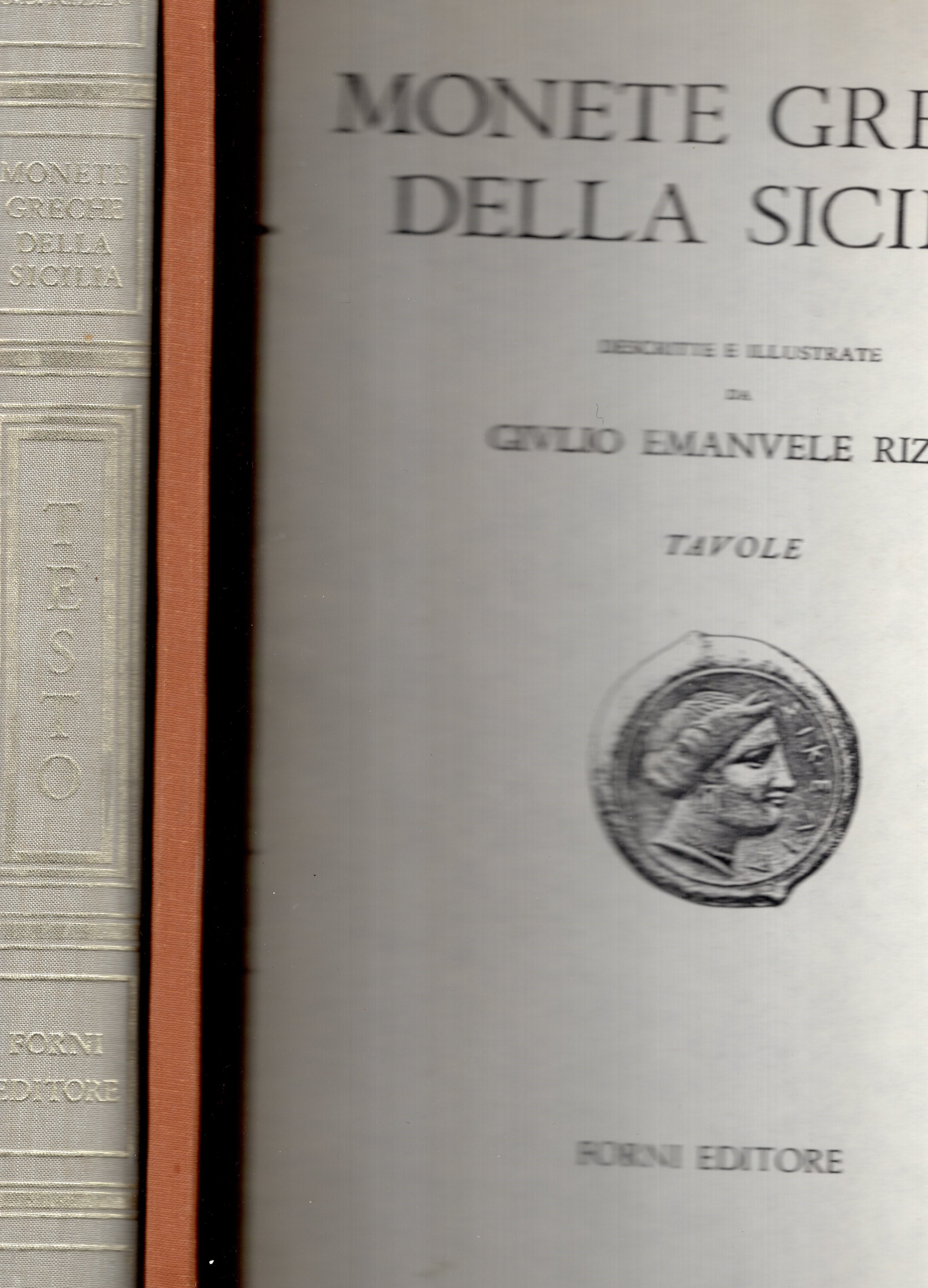RIZZO Givlio Emanvele - Monete greche della Sicilia. Bologna, s.d, ma anni 70. tavole in FOTOCOPIA. Ppvii - 318, con illustrazioni nel testo, volume tavole pp xi- 66. legatura ed. volume testo, interno ottimo stato, vol. tavole buono stato. raro