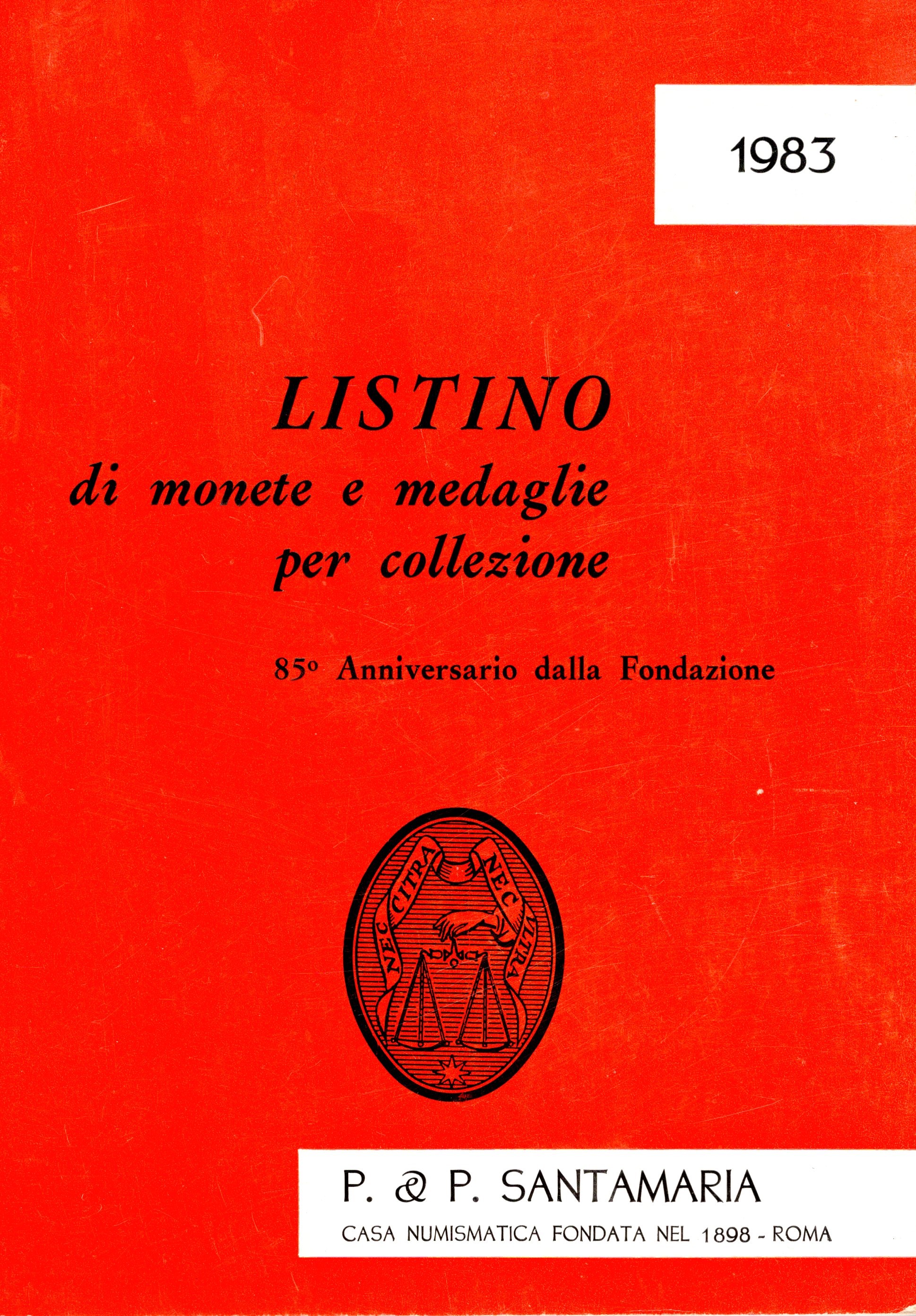 SANTAMARIA P&P. - Listino a prezzi fissi, Roma,1983. Monete d'oro, greche, romane, medioevali italiane e papali, Oselle di Venezia e Murano, monete moderne e medaglie papali. pp 42, lots 628, tavole 26. Brossura ed. ottimo stato.