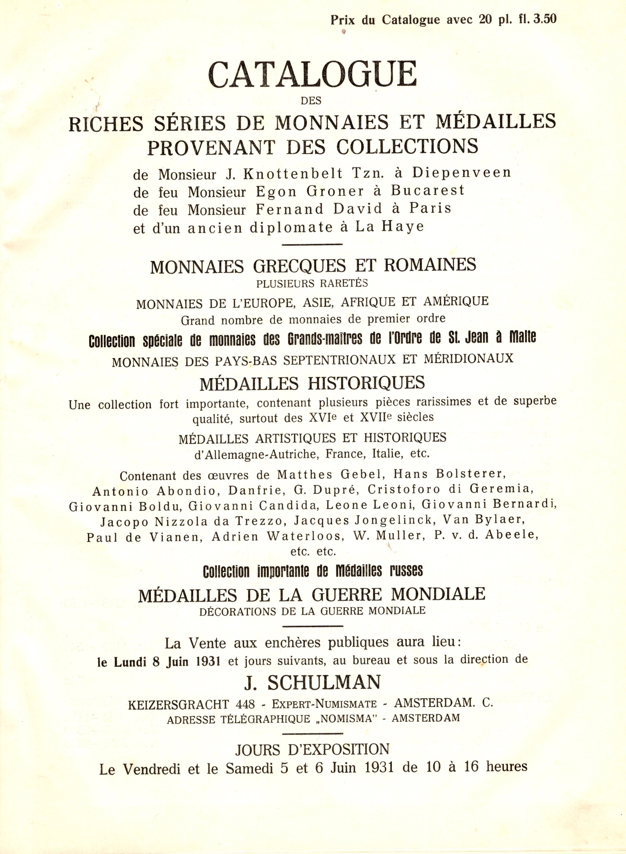 SCHULMAN J. - Amsterdam, 8 - Juin, 1931.Collection J. Knottenbelt, - Collection Groner E. - David F. - diplomate de l'Haie. Monnaies et medailles. Pp. 134, nn. 2636, tavv. 20. ril tutta similpelle rigida, interno buono stato, raro, Spring, 693 - Rossi 3235.