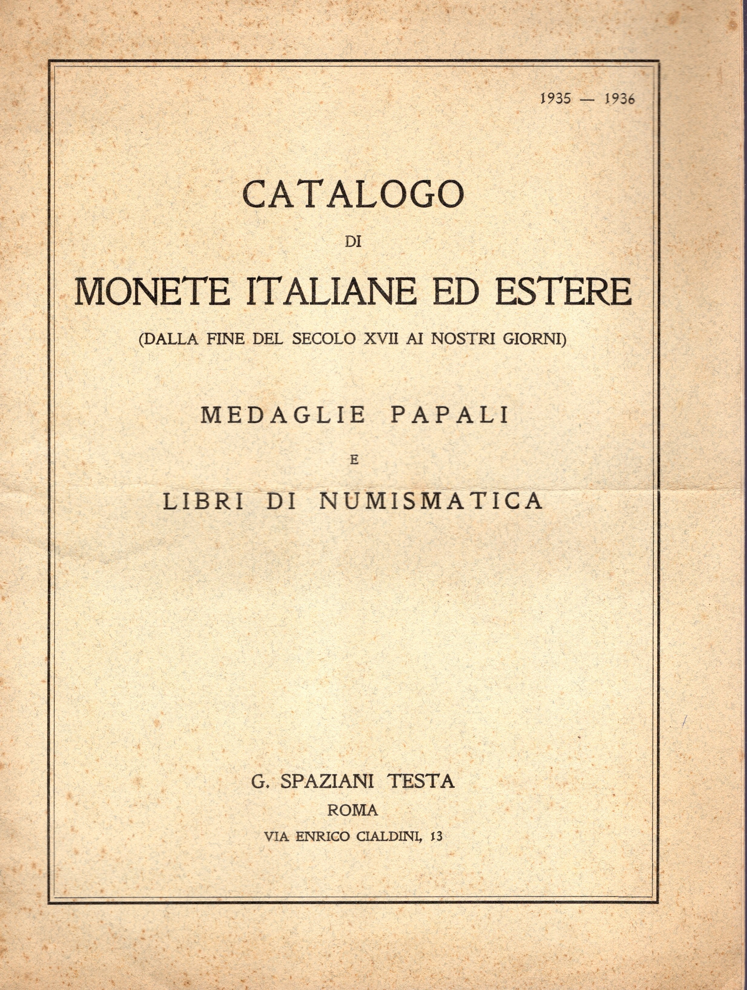 SPAZIANI TESTA G. -Roma, listino a prezzi fissi 1935-1936. Catalogo di Monete italiane ed estere, medaglie papali e libri di numismatica. pp 23, nn 640. Brossura ed. buono stato, raro.