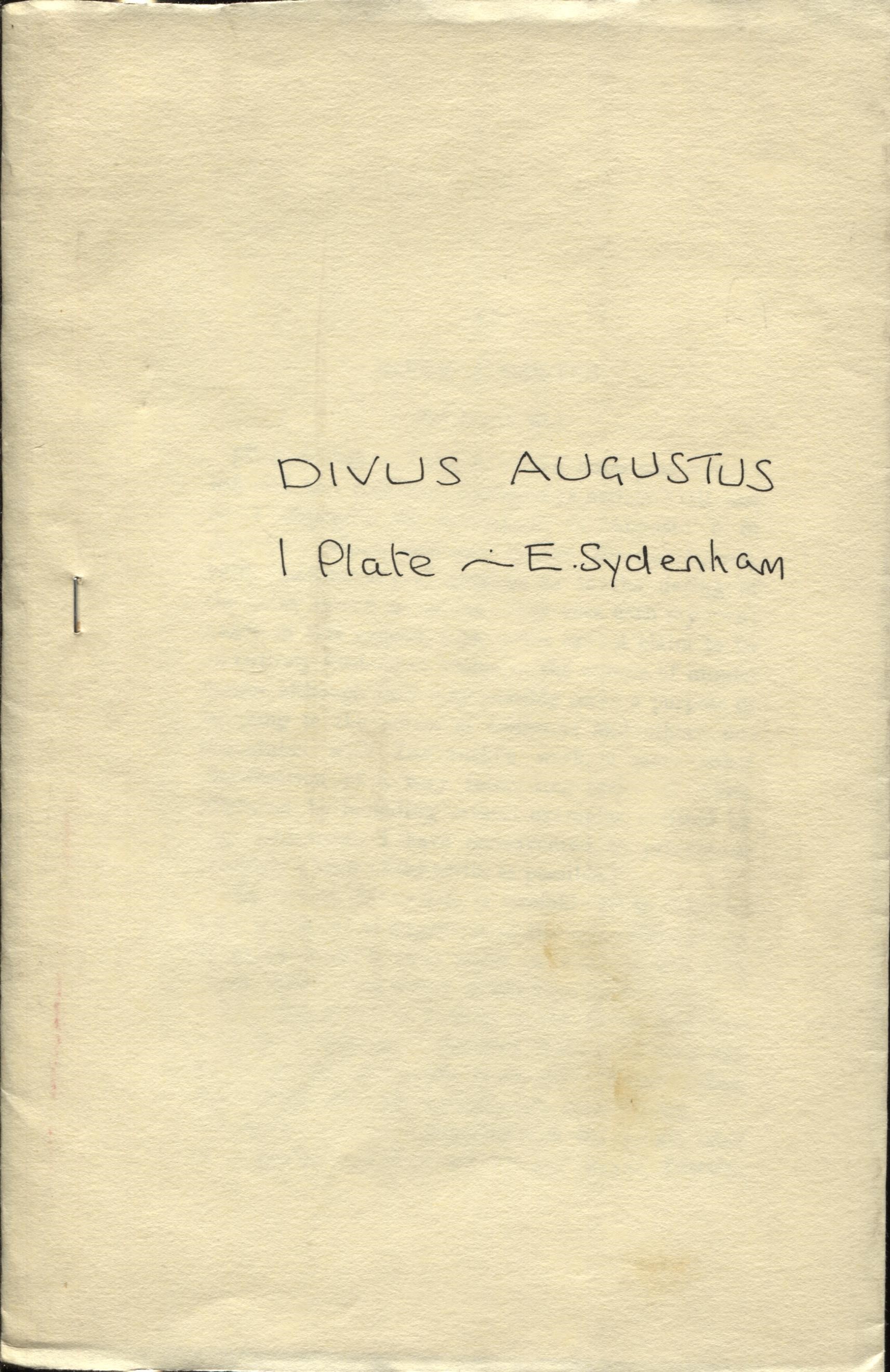 SYDENHAM E. A. – Divus Augustus. London, s.d. pp. 257 – 278, tavv. 1. Ril. Muta, buono stato.