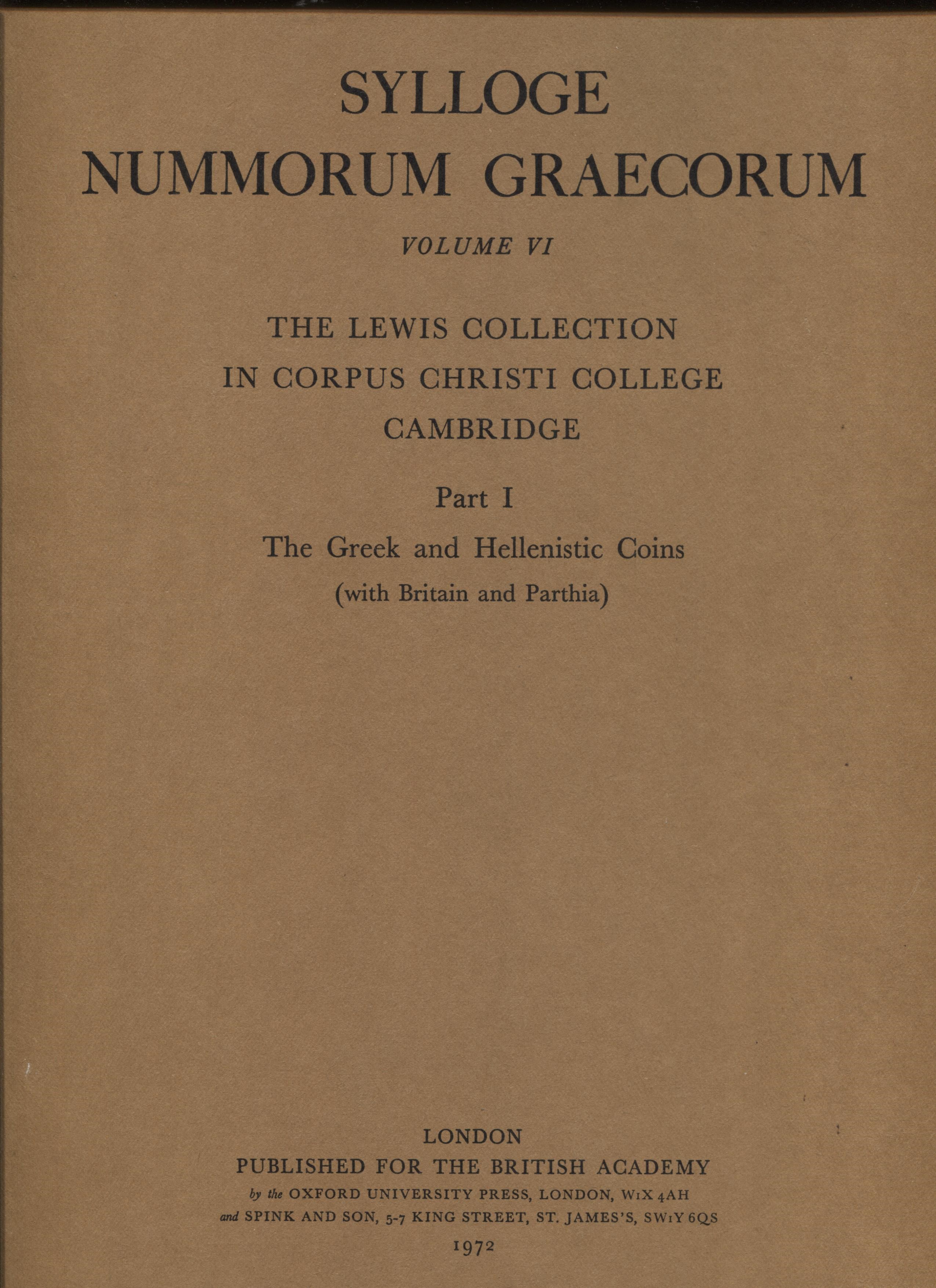 SYLLOGE NUMM. GRAECORUM. Vol. VI. the Lewis collection in Corpus Christi College Cambridge. London, 1972. Part I. The Greek and Hellenistic coins ( with Britain and Parthia). Pp. 6 + 9, tavv. 24. Ril. ed. raro.