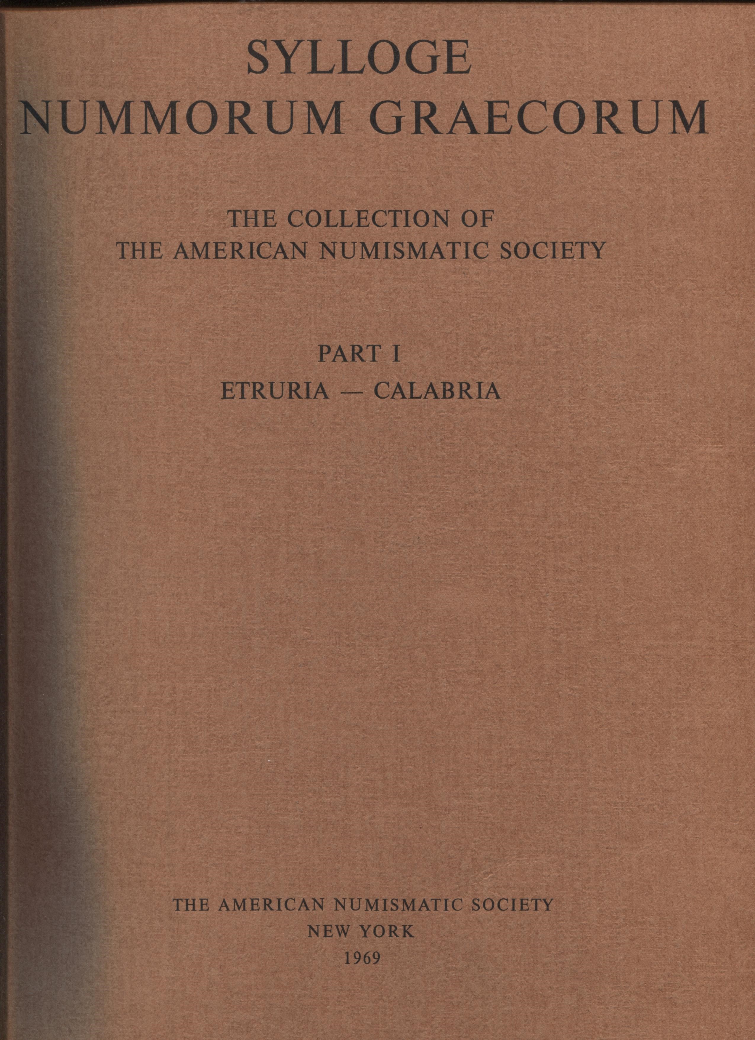 SYLLOGE NUMMORUM GRAECORUM. The collection of the American Numismatic Society. Part I. Etruria - Calabria. New York, 1969. Pp. 2, tavv. 39. Ril. Ed. Ottimo stato, importante e molto raro.