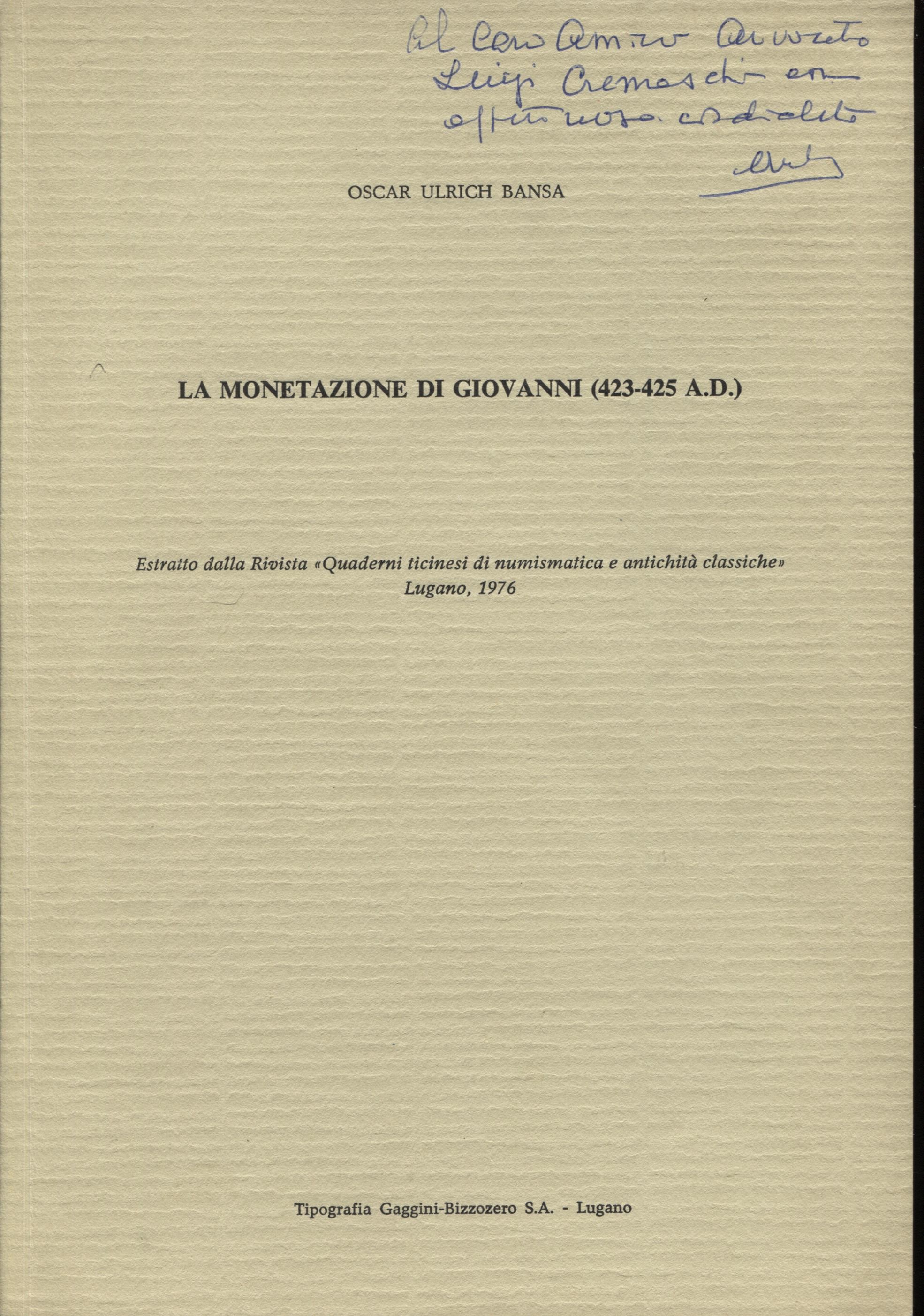 ULRICH –BANSA O. - La monetazione di Giovanni ( 423 – 425 A.D.) Lugano, 1976. Pp. 277 – 290, ill. nel testo. ril. ed. buono stato, raro.
