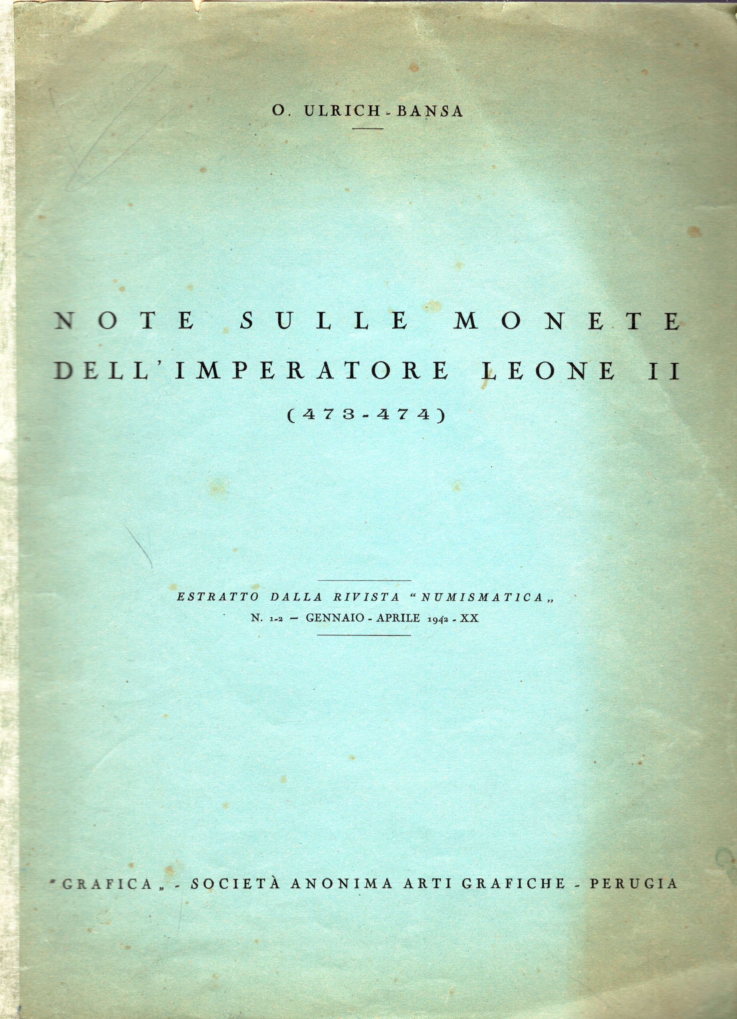ULRICH-BANSA O. - Note sulle monete dell’imperatore Leone II 473 – 474. Roma, 1942. Pp. 15, tavv. 2. Ril. ed. sciupata, buono stato, raro.