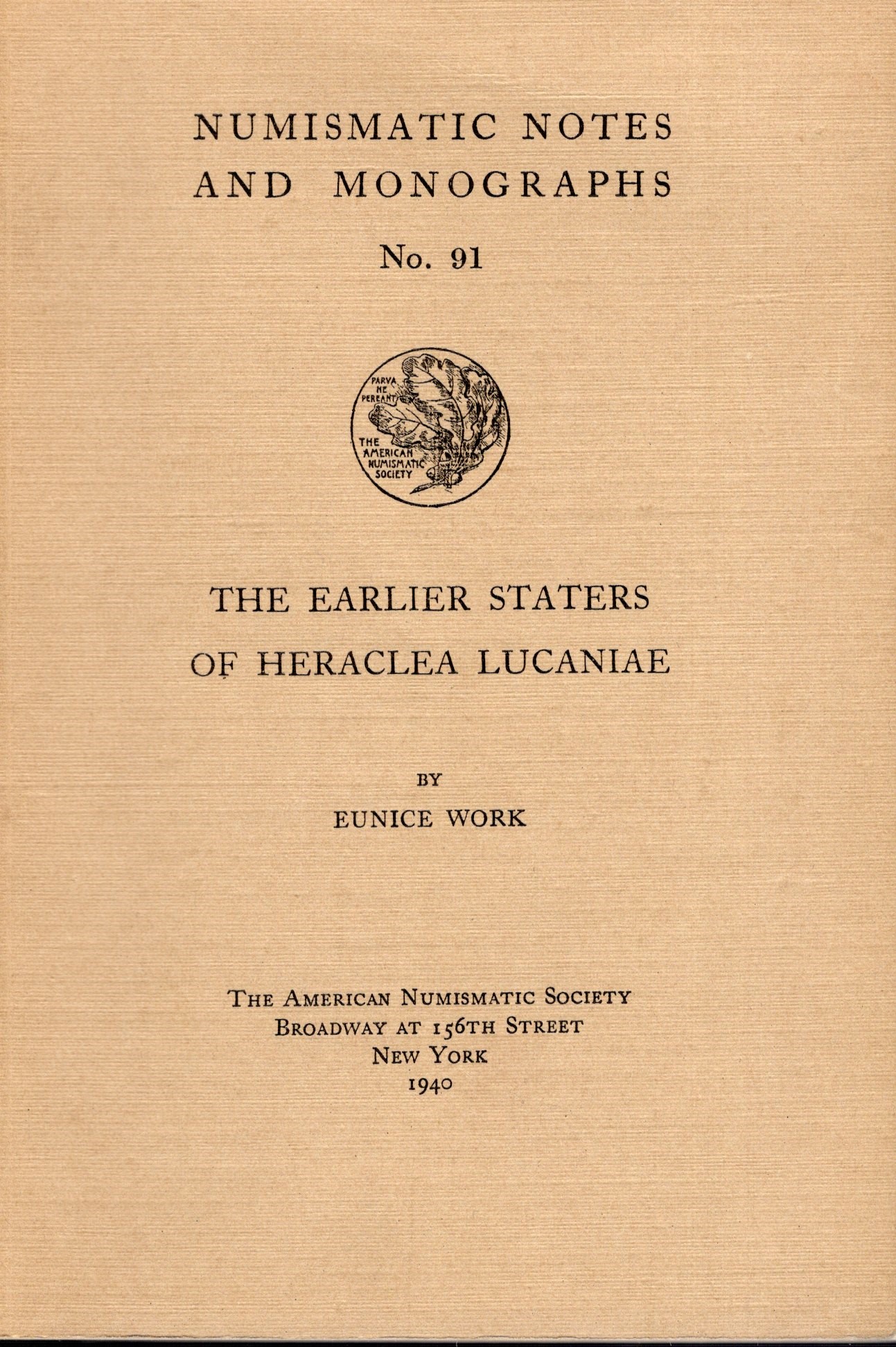 WORK Eunice. - The earlier staters of Heraclea Lucaniae. N.N.A.M. n.91. New York, 1940. pp 40, tavv. 8 doppie. Rilegatura ed. ottimo stato, molto raro.