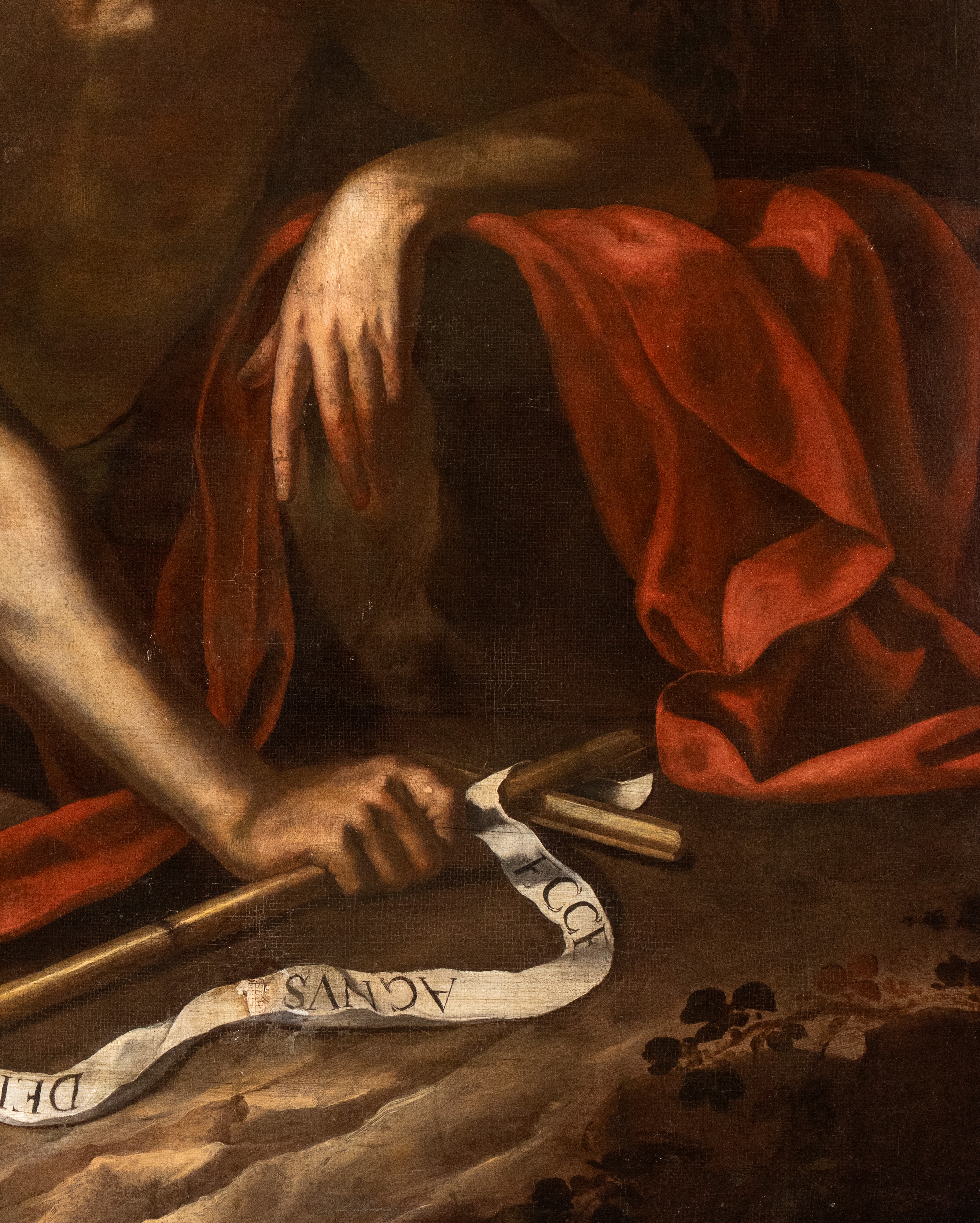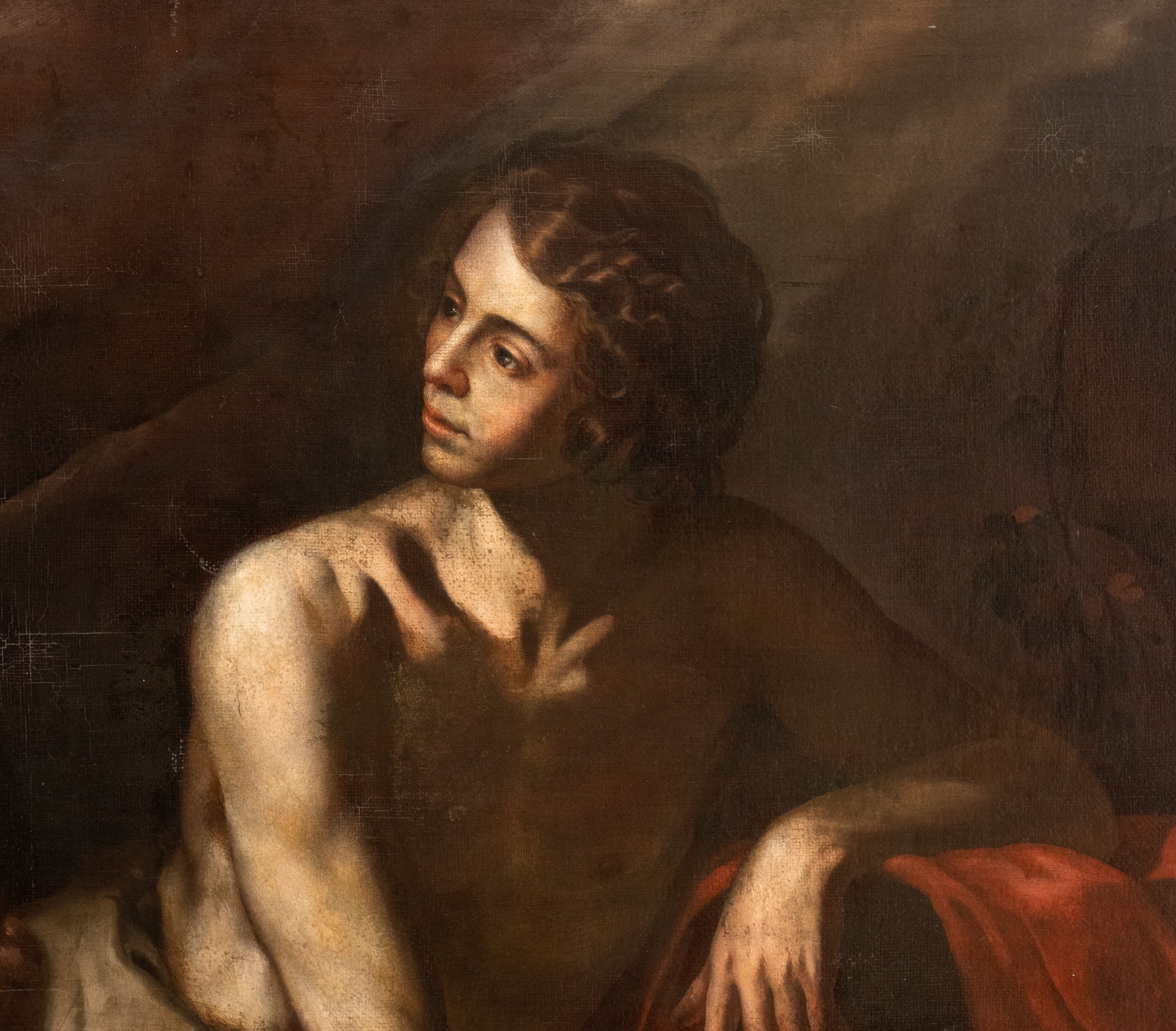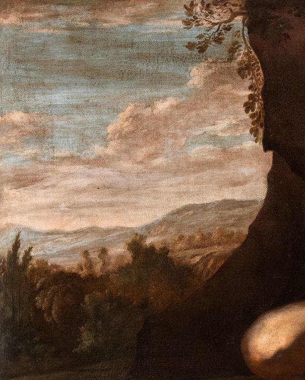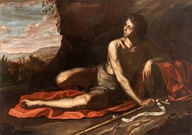 In questa raffigurazione di giovane seminudo si riconosce agevolmente San Giovanni Battista nel deserto. Il santo, d'accordo con la tradizione iconografica, è infatti vestito di pelli di cammello e sdraiato all'interno di una grotta su un mantello rosso, con i suoi attributi principali della croce e del cartiglio con la scritta "Ecce Agnus Dei". La tela presenta una figura maschile vigorosa resa con accuratezza anatomica in una postura particolarmente elaborata: la gamba destra flessa, il braccio sinistro piegato e poggiato su una pietra, il busto in lieve rotazione e il braccio destro disteso che regge la croce di canne incrociate. L'autore del dipinto esibisce una notevole padronanza del disegno e dei contrasti chiaroscurali, sfruttati in profondità per dare il massimo risalto alla plasticità scultorea del corpo. Merita, inoltre, di essere specificamente sottolineata la notevole qualità del brano di paesaggio, realizzato con una pennellata sciolta e sintetica. E' evidente nella tela un retroterra caravaggesco, arricchito però dall'influsso della pittura romana (Orazio Gentileschi, Baglione, Reni) e principalmente napoletana (Battistello, Stanzione, Ribera). Vanno infatti sottolineate le strette tangenze che quest'immagine potente rivela con la produzione di Antonio De Bellis, Onofrio Palumbo, ma soprattutto Artemisia Gentileschi, protagonista della pittura napoletana nel corso del suo lungo soggiorno partenopeo, tra il 1630 e il 1656: tangenze che traggono conforto dal confronto con opere di Artemisia come la Maddalena penitente e Corisca e il satiro, entrambi in collezione privata, Susanna e i vecchioni della PInocateca Nazionale di Bologna o il Trionfo di Galatea della National Gallery di Washington.