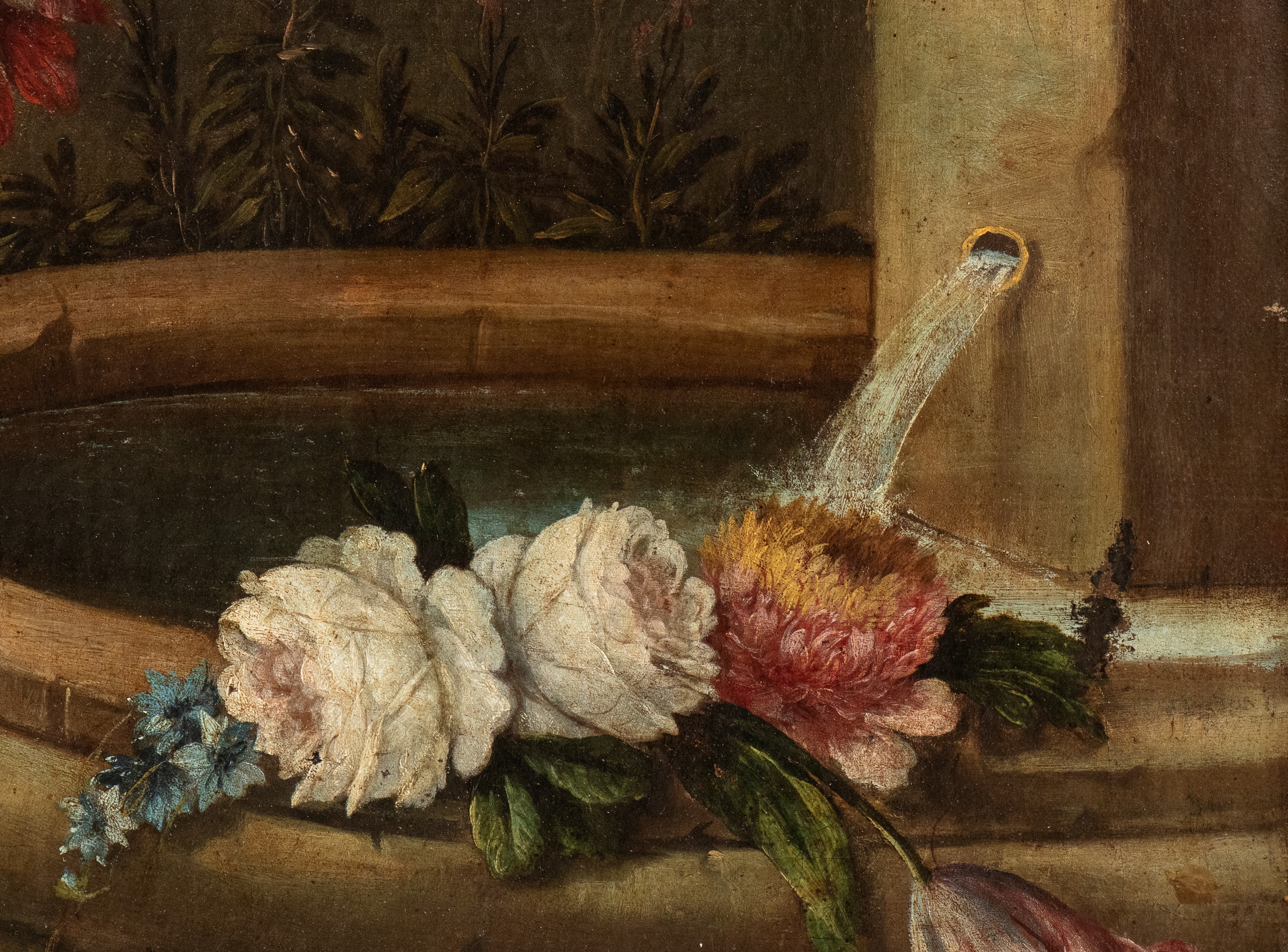 In questa sontuosa natura morta floreale en plein air, così come nell'esemplare proposto al lotto successivo, si rinvengono i caratteri dell'arte raffinata di Andrea Belvedere. Protagonista assoluto nei decenni finali del Seicento a Napoli nell'ambito della natura morta, per rivolgersi in seguito principalmente alla sua passione per il teatro e la letteratura, Belvedere ebbe una particolare predilezione per gli ampi bouquet di fiori, spesso collocati entro ricchi vasi metallici istoriati e non di rado, come nei due casi che qui si illustrano, in spazi aperti naturali, come radure, boschetti o giardini di ville. Com'è tipico di Belvedere, i fiori sono qui vibranti di colori e rimandano a molti altri esemplari del suo corpus: si pensi ai Fiori in braciere di rame del Museo Correale di Sorrento, ai Fiori con anatre davanti a un erma del Museo Stibbert di Firenze o ad Anatre e fiori della Galleria Palatina di Firenze.