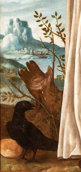 Questo grande dipinto di San Benedetto da Norcia a figura intera, isolato in un ampio paesaggio, con il libro della Regola e il pastorale abbaziale nella mano sinistra, raffigura il santo secondo un’iconografia tradizionale arricchita da simboli allusivi alla penitenza e alla vita monastica, quali il terreno aspro e il corvo con il pane.