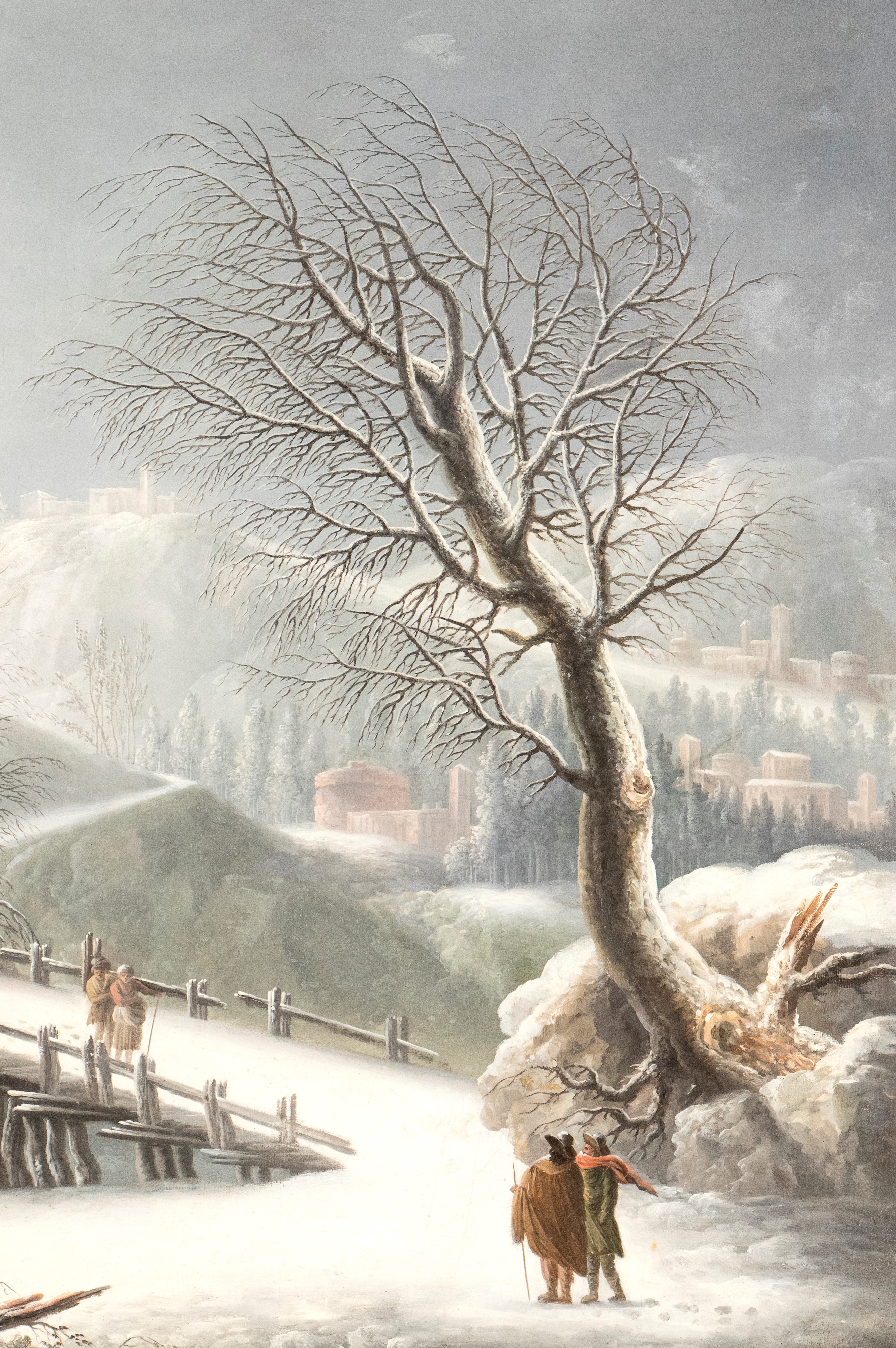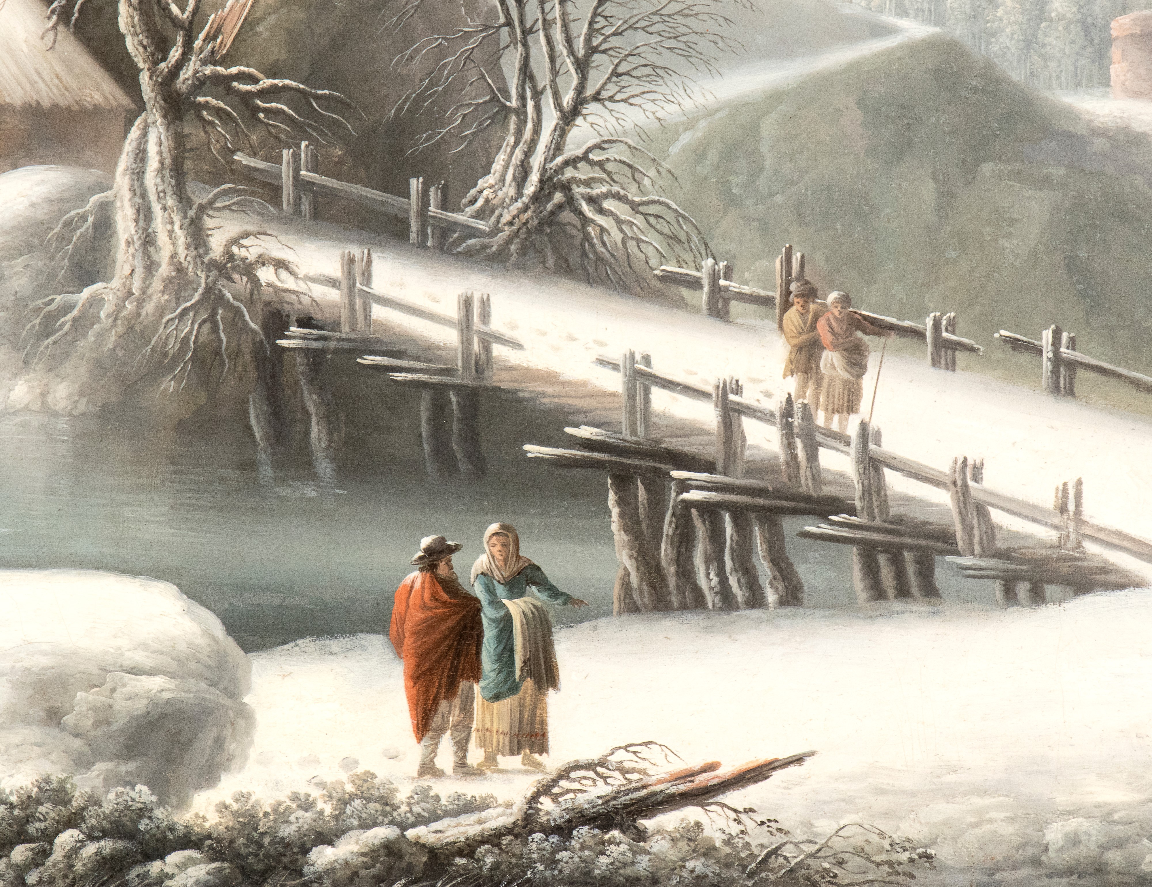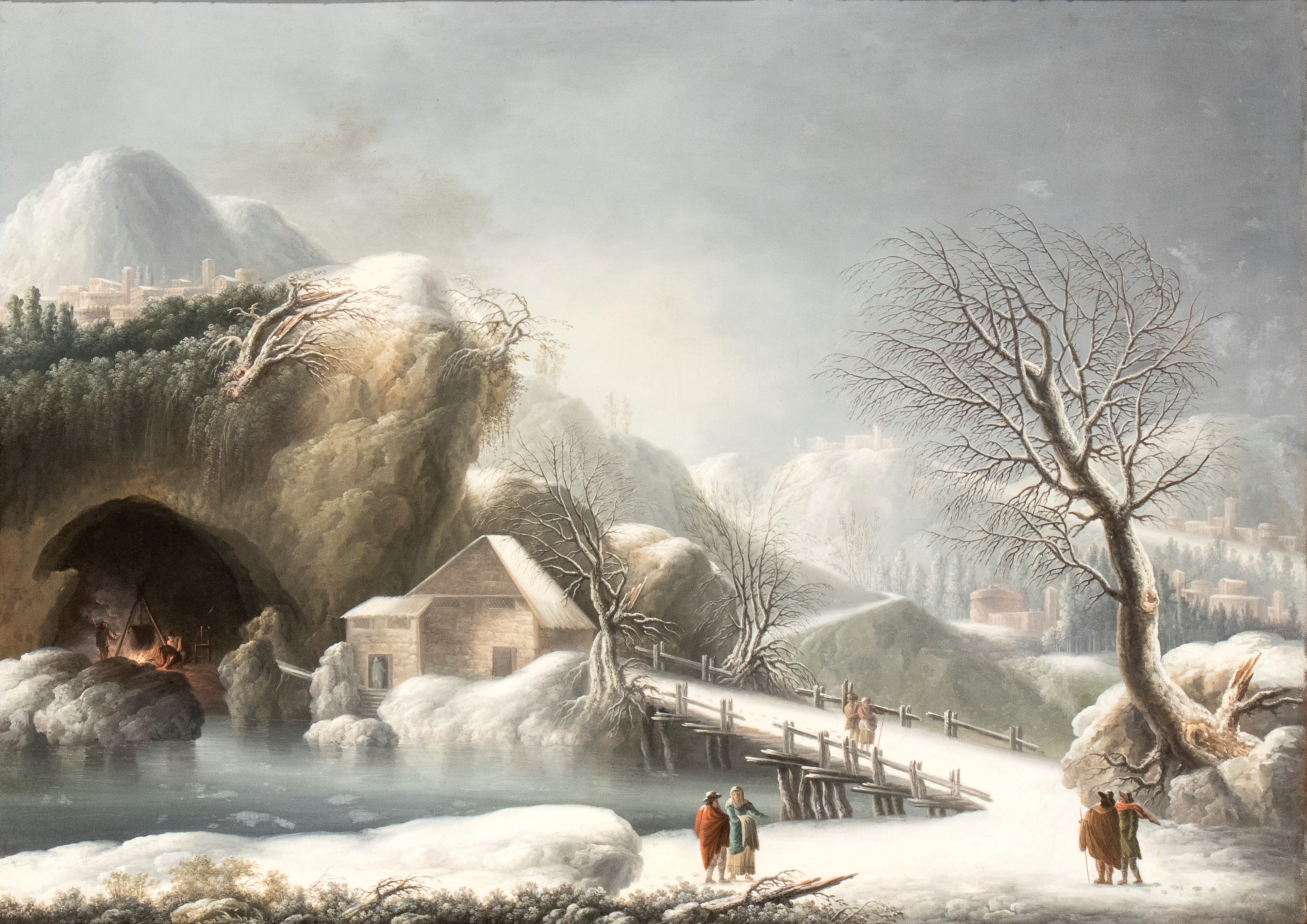 Paesaggio innevato con ponte, casa, grotta e viandanti