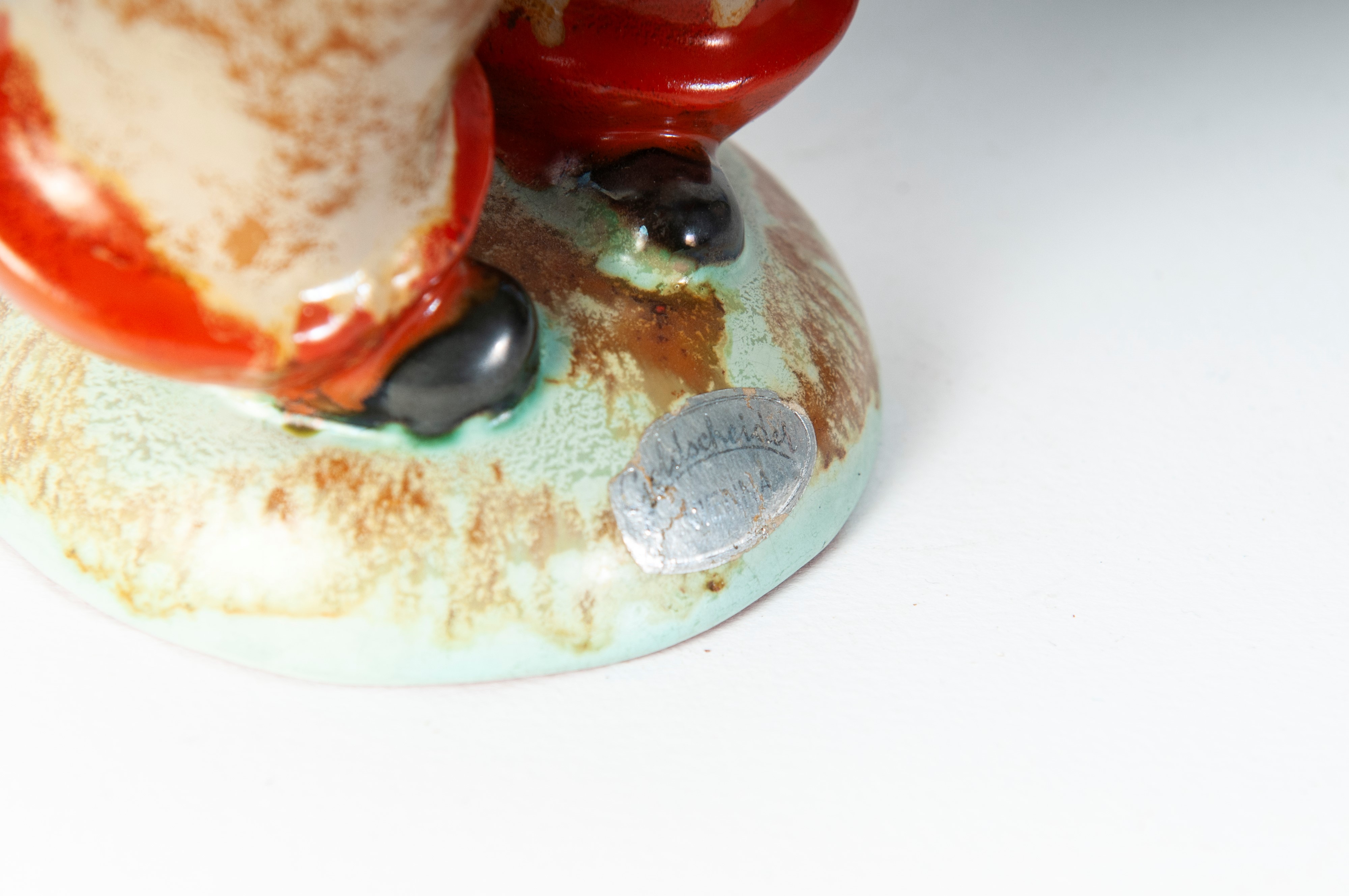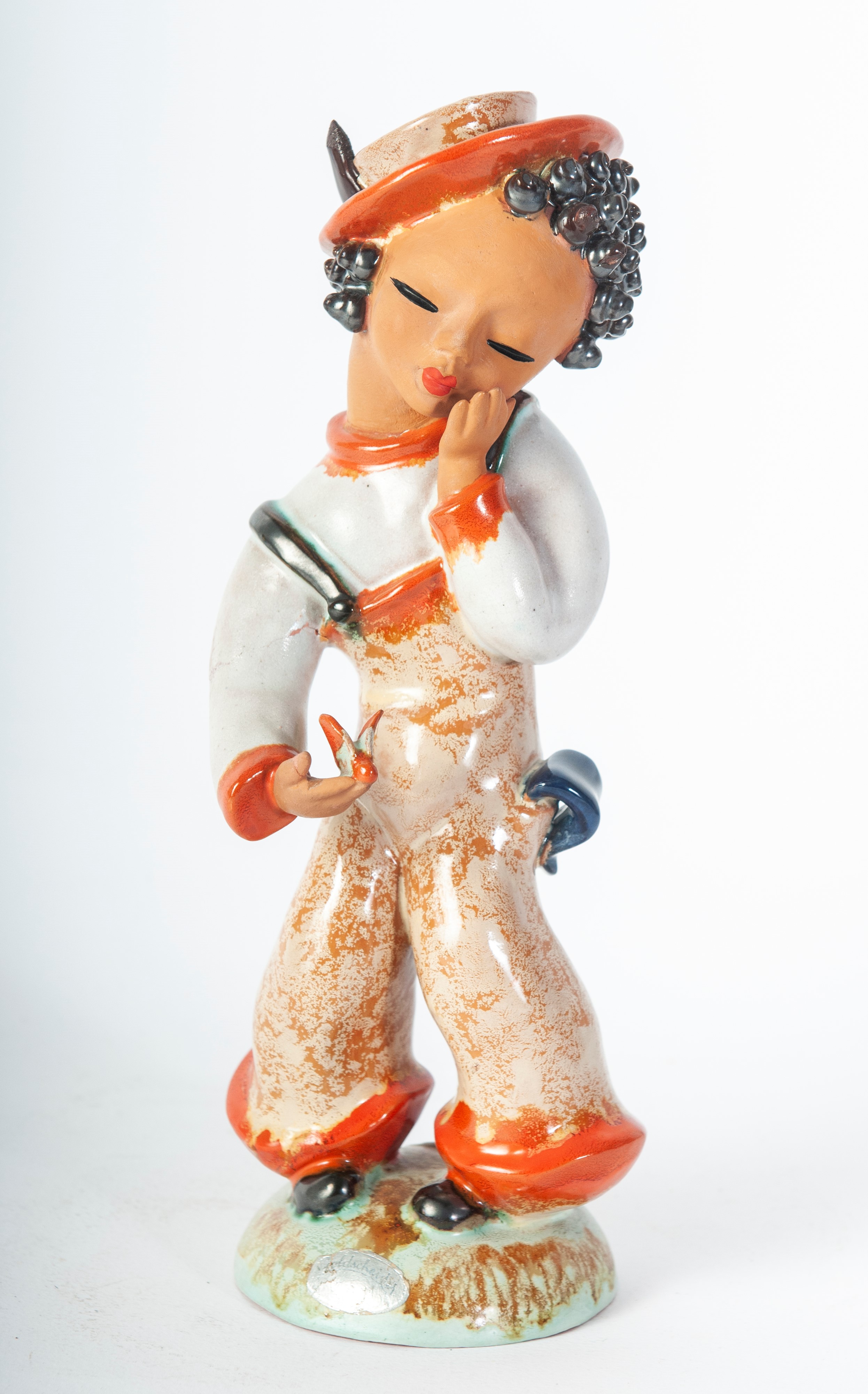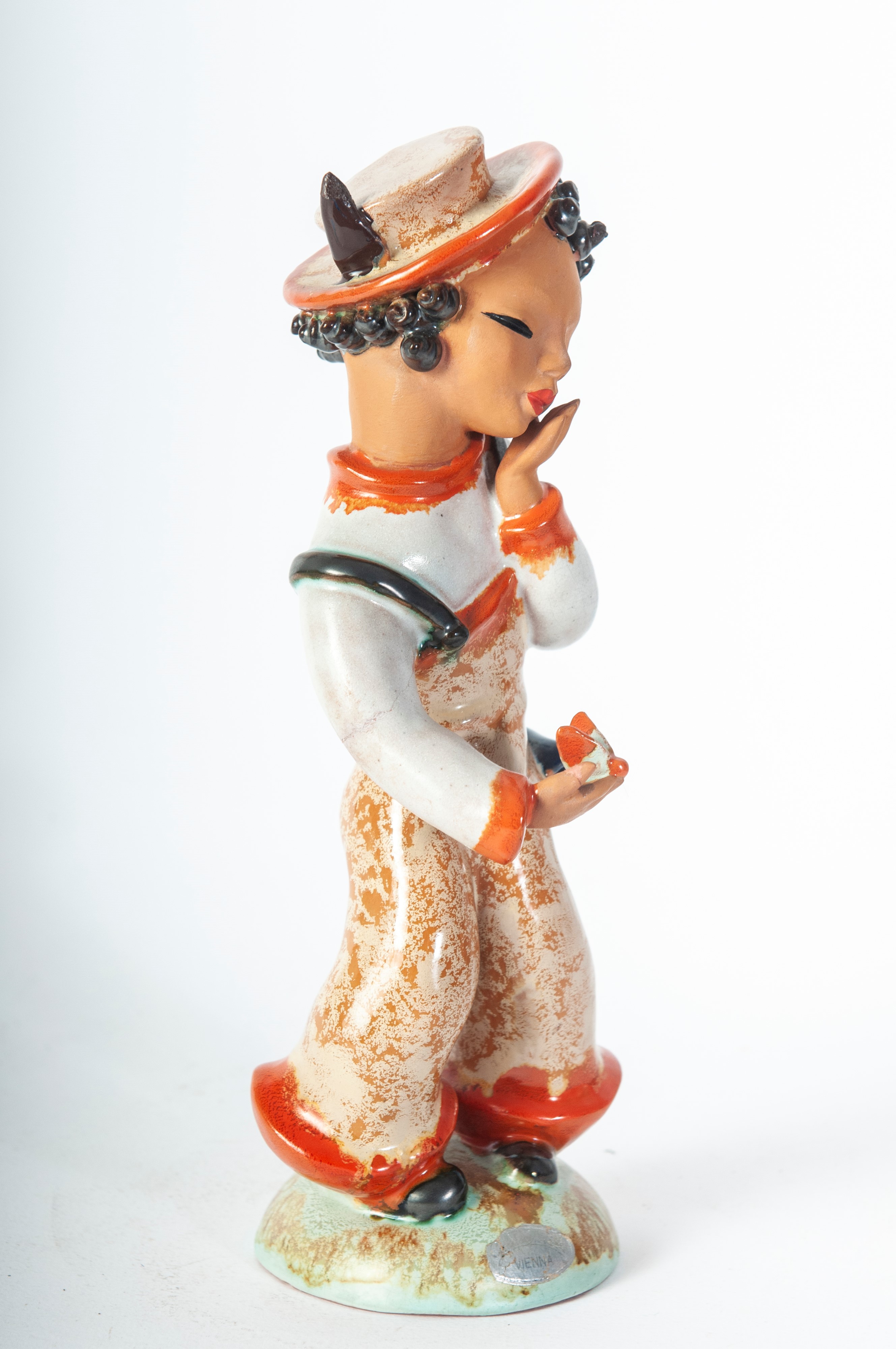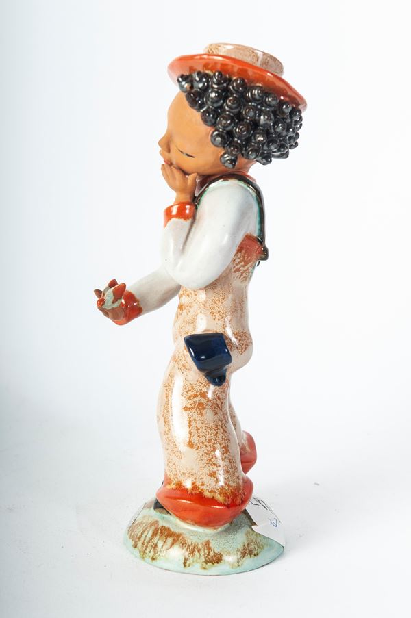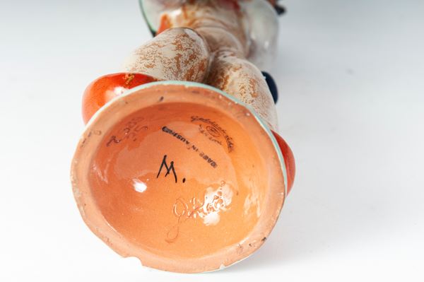 scultura a tutto tondo in ceramica policroma con formatura a colaggio. Firma in nero alla base sotto smalto. Manifattura Gold Schaider Vienna.
