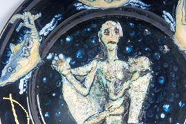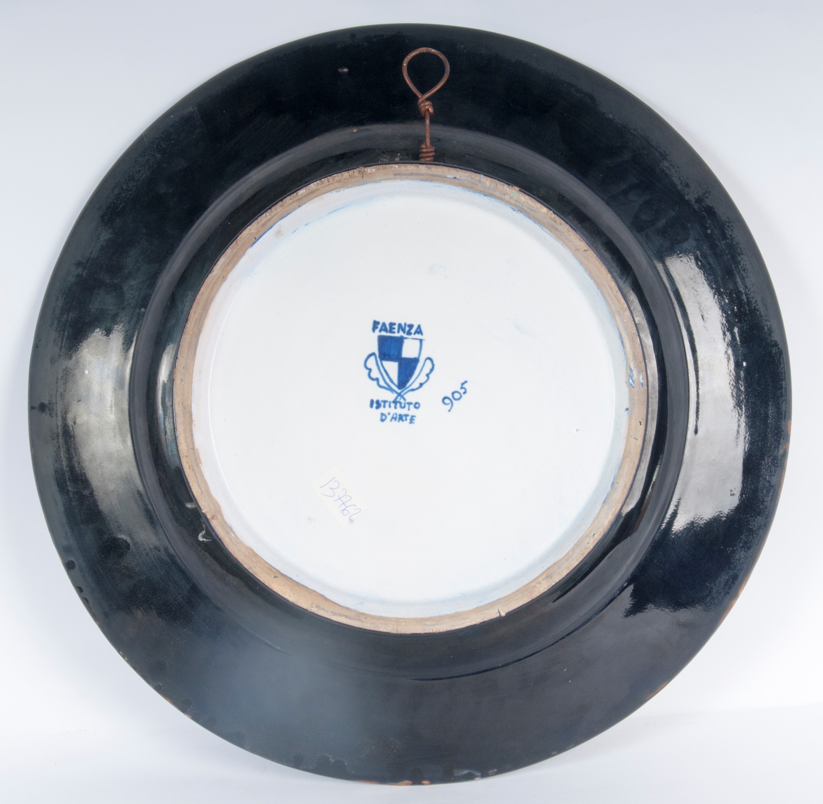 dall'ampia tesa, corta balza e vasto fondo. Orlo del piatto con labbro leggermente rialzato, retro con appoggio ad anello e fondo ribassato. Decoro su fondo blu notte con smalto a rilievo. Figure di balene stilizzate nella tesa e Vergine con il Bambino nel fondo. Al retro in blu sotto smalto Istituto d'Arte Faenza e numero di matricola 905 corrispondente all'autore e agli anni 1954/55.