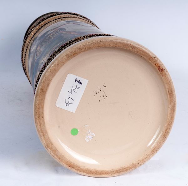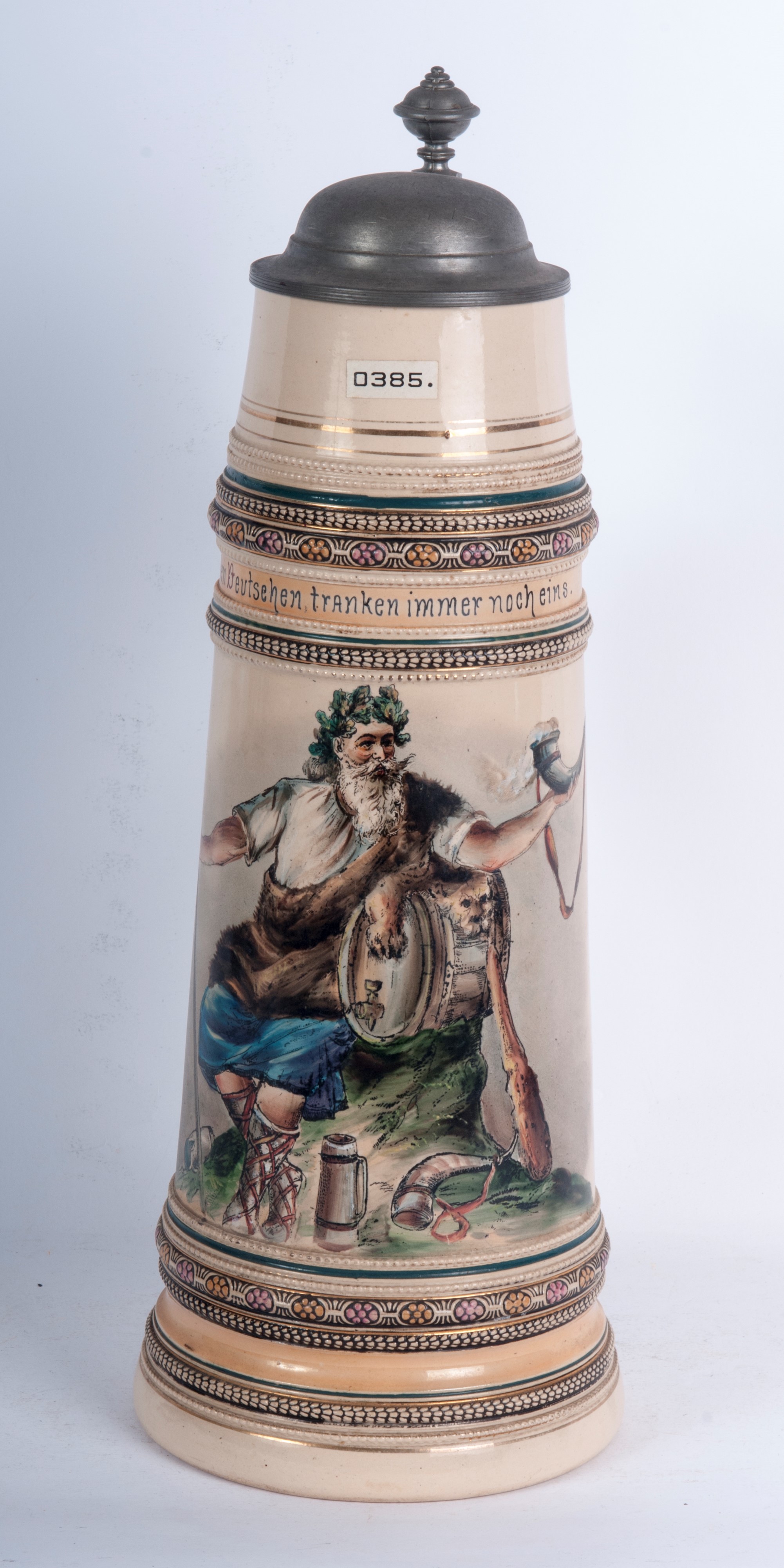 in ceramica policroma con coperchio in peltro e scena con bacco nella parte frontale su fondo crema. Manifattura tedesca con marchio incusso sotto la base di difficile lettura.