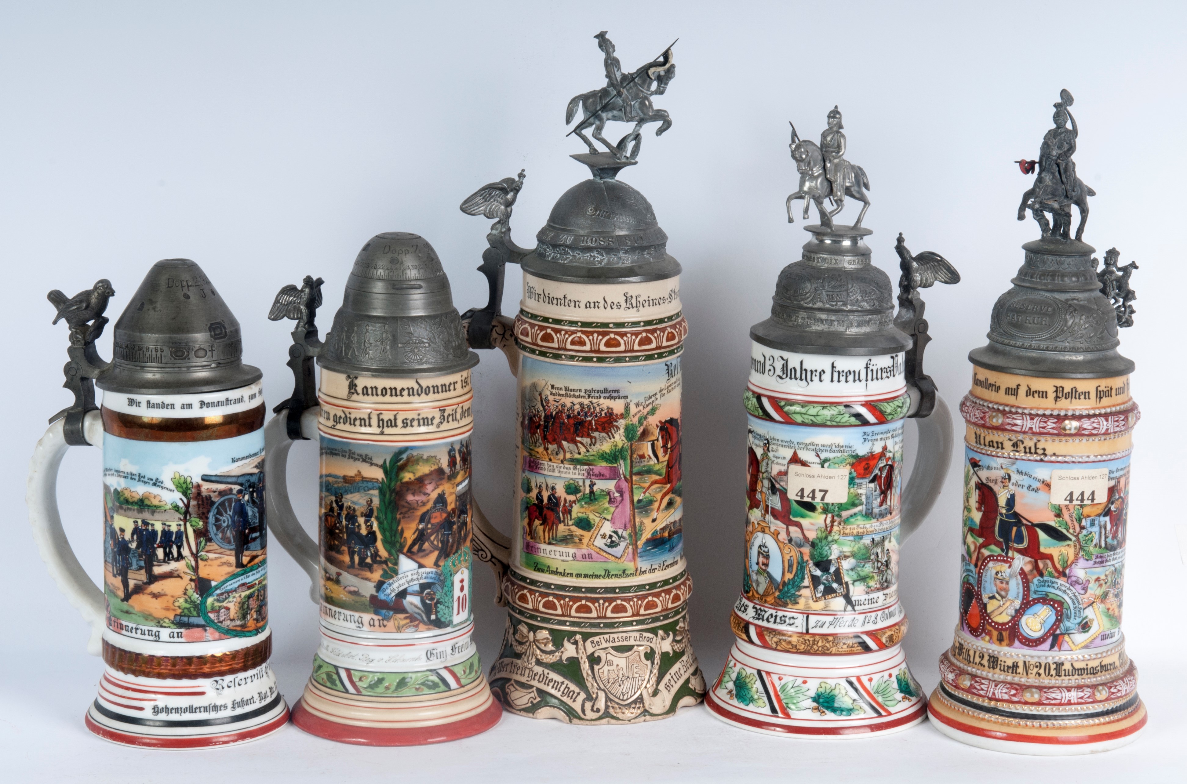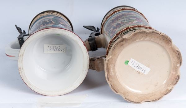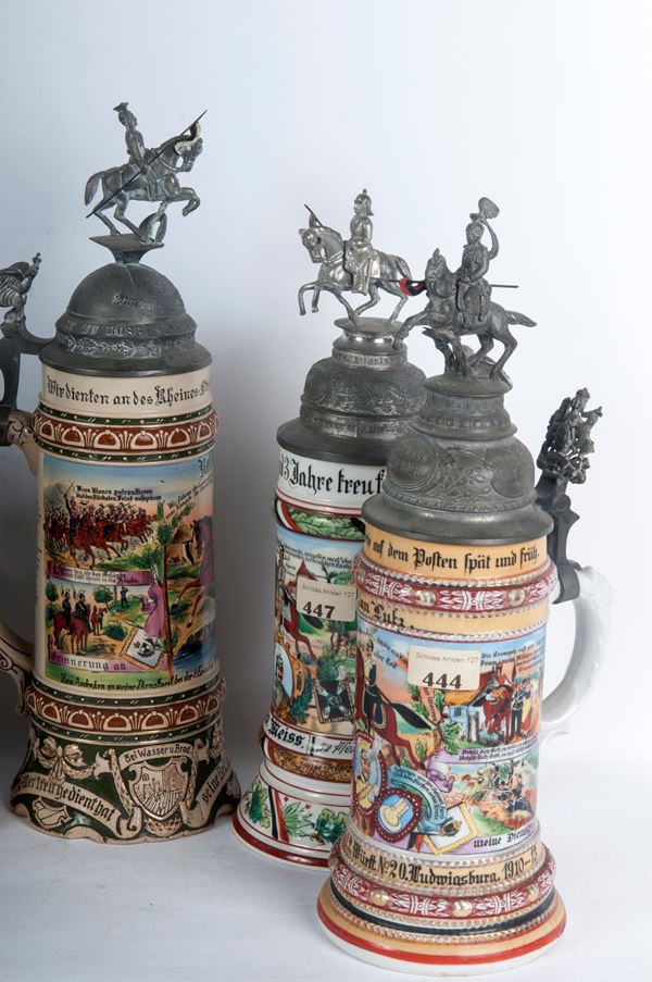 in ceramica policroma con coperchio in peltro dei quali tre sormontati da cavalieri e due da ogive di proiettili. Decoro con iscrizione del reparto di appartenenza e scene militari.