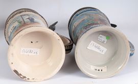 in ceramica policroma con coperchio in peltro dei quali due con figure militari, due con corona ed uno con locomotiva.