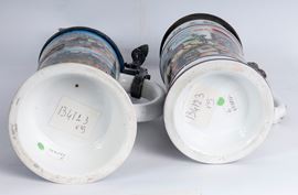 in ceramica policroma con coperchio in peltro dei quali tre sormontati da cavalieri, uno a cupola ed uno con coperchio in vetro sfaccettato.
