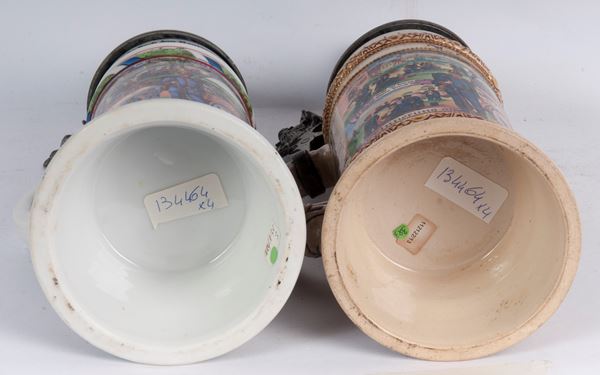 in ceramica policroma con coperchio in peltro sormontati da figure militari.