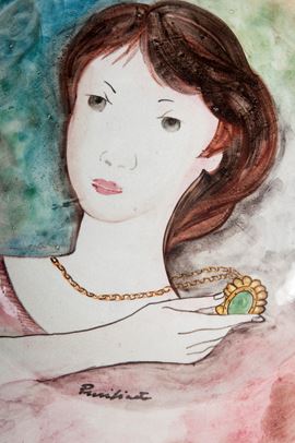 Decoro con volto di donna su fondo nuances grigio, verde e rosa. Firmato e numerato 61/99 Manifattura G. Rossicone Milano