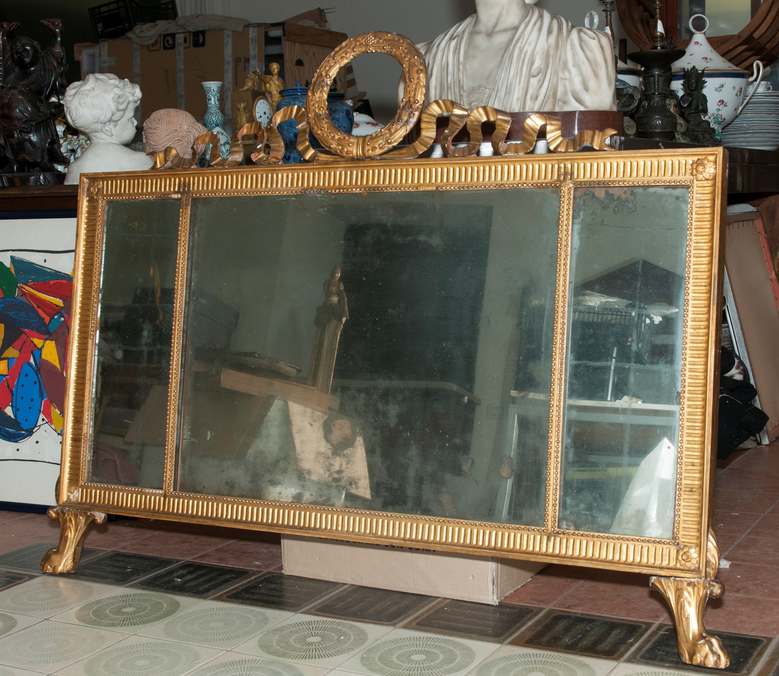 Caminiera in legno dorato a tre pannelli a specchio, fine XVIII inizio XIX secolo