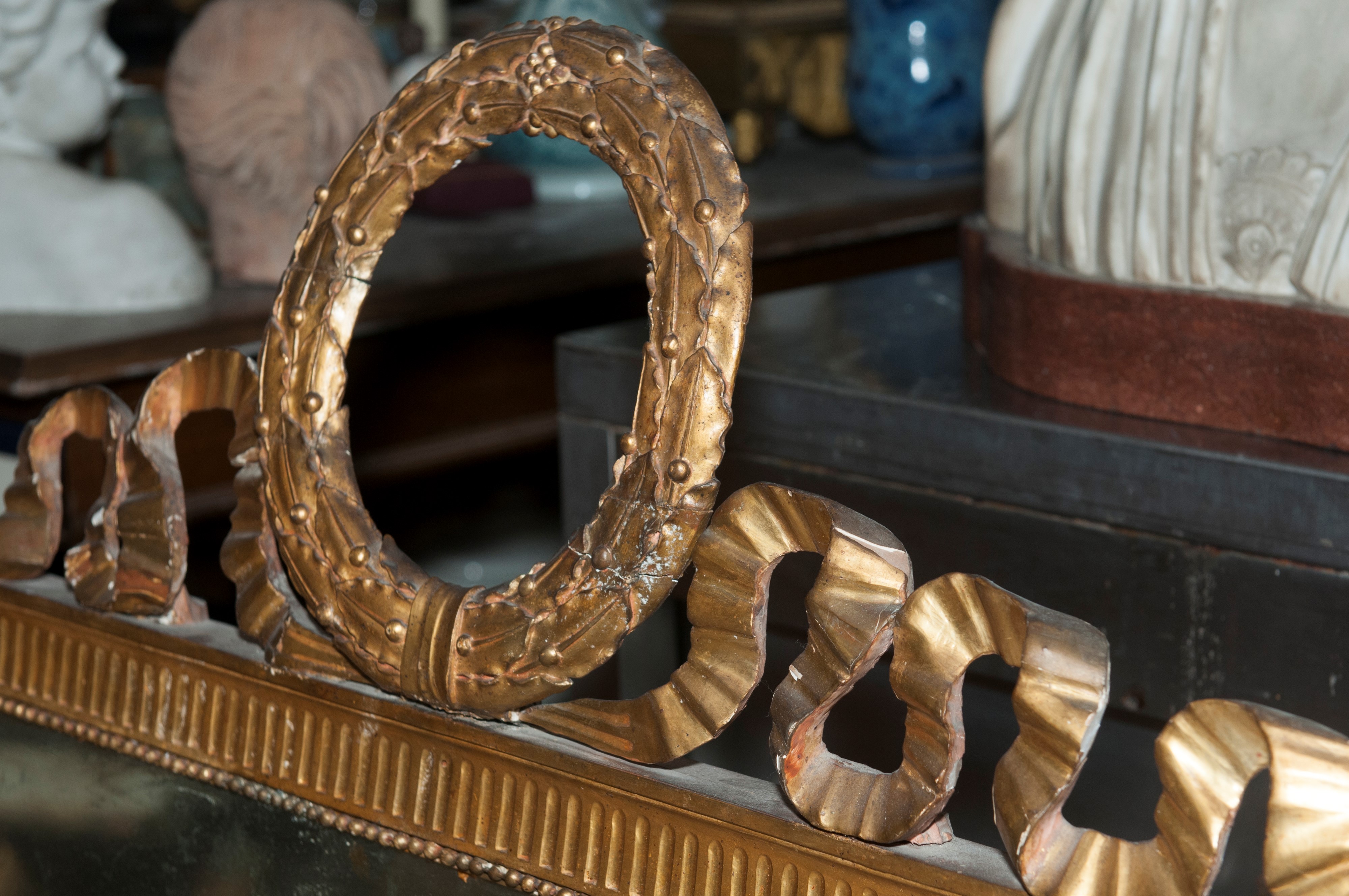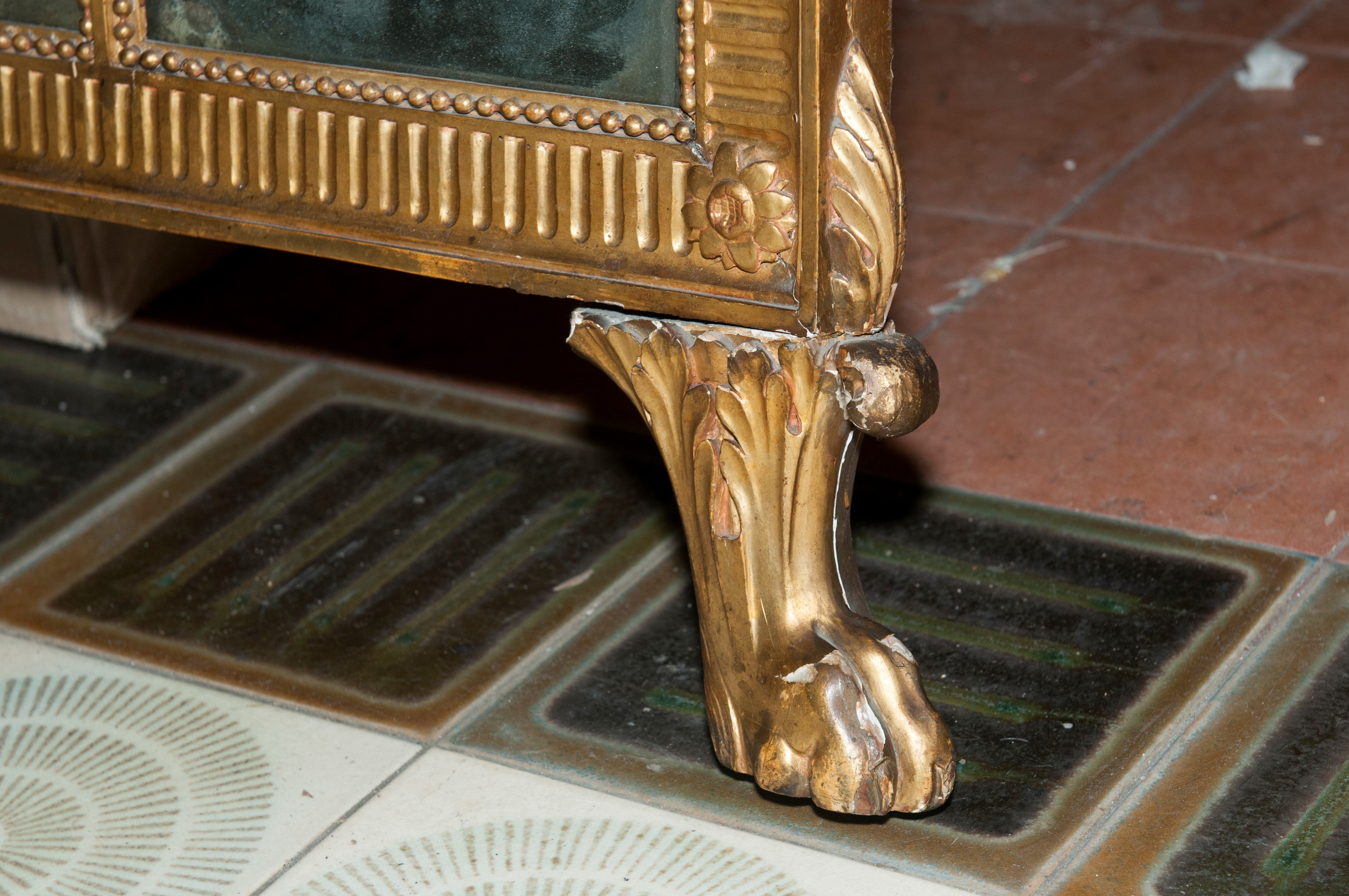 cornice incisa con scanalature e decoro a perlinature. Cimasa con ghirlanda di foglie, bacche e nastri. Piedi zoomorfi