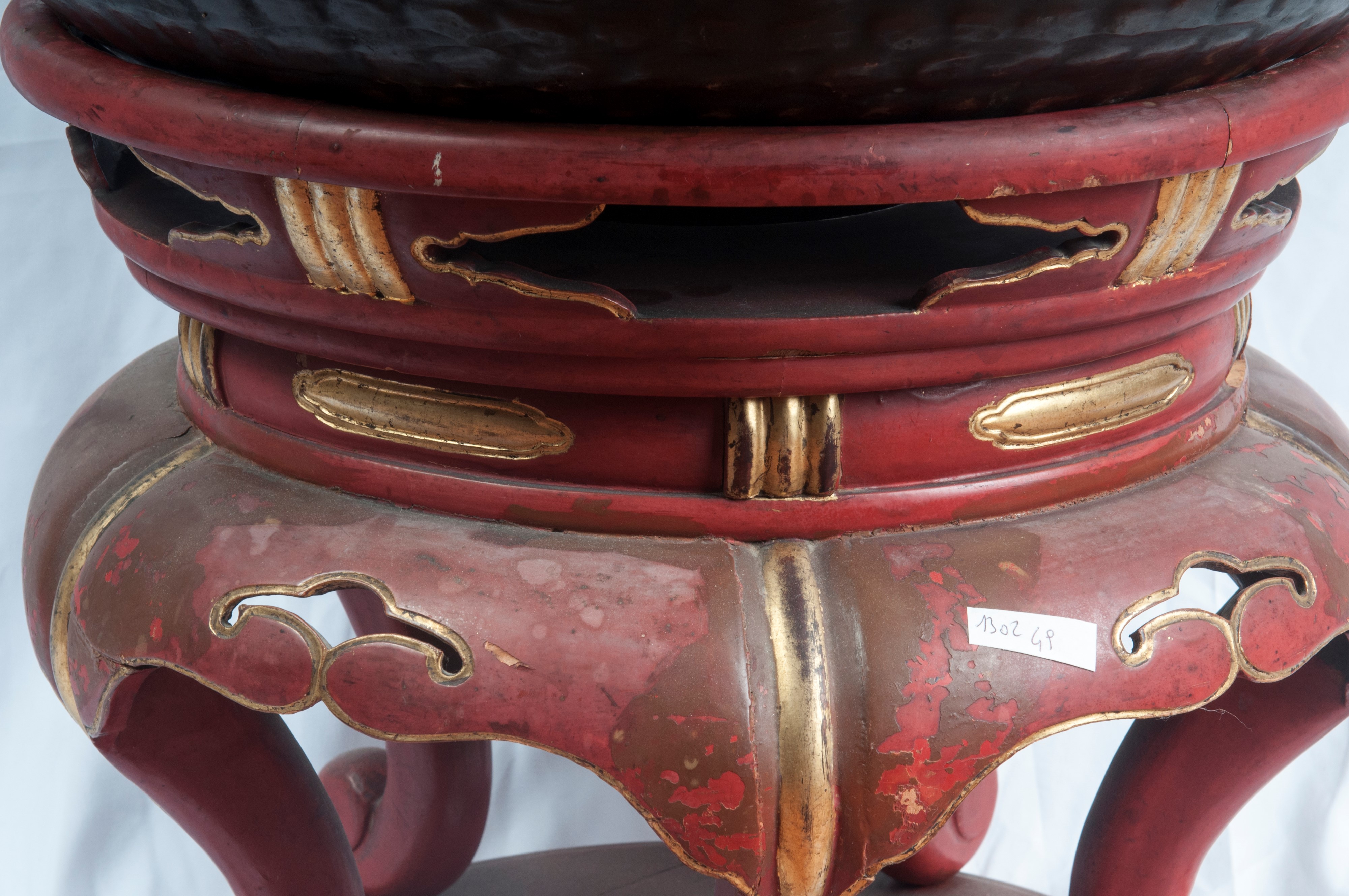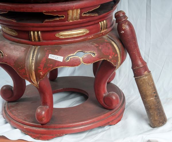 in bronzo con base in legno laccato, rosso e oro con mortaio.