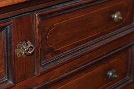 guarniti ognuno di doppia cornice. Decorazione con filettature in legno di frutto formanti pannelli ovoidali. Piano rettangolare con bordo a becco di civetta, fiancate lisce , base a cornice su piedi a mensola. Ferramenta coeva.