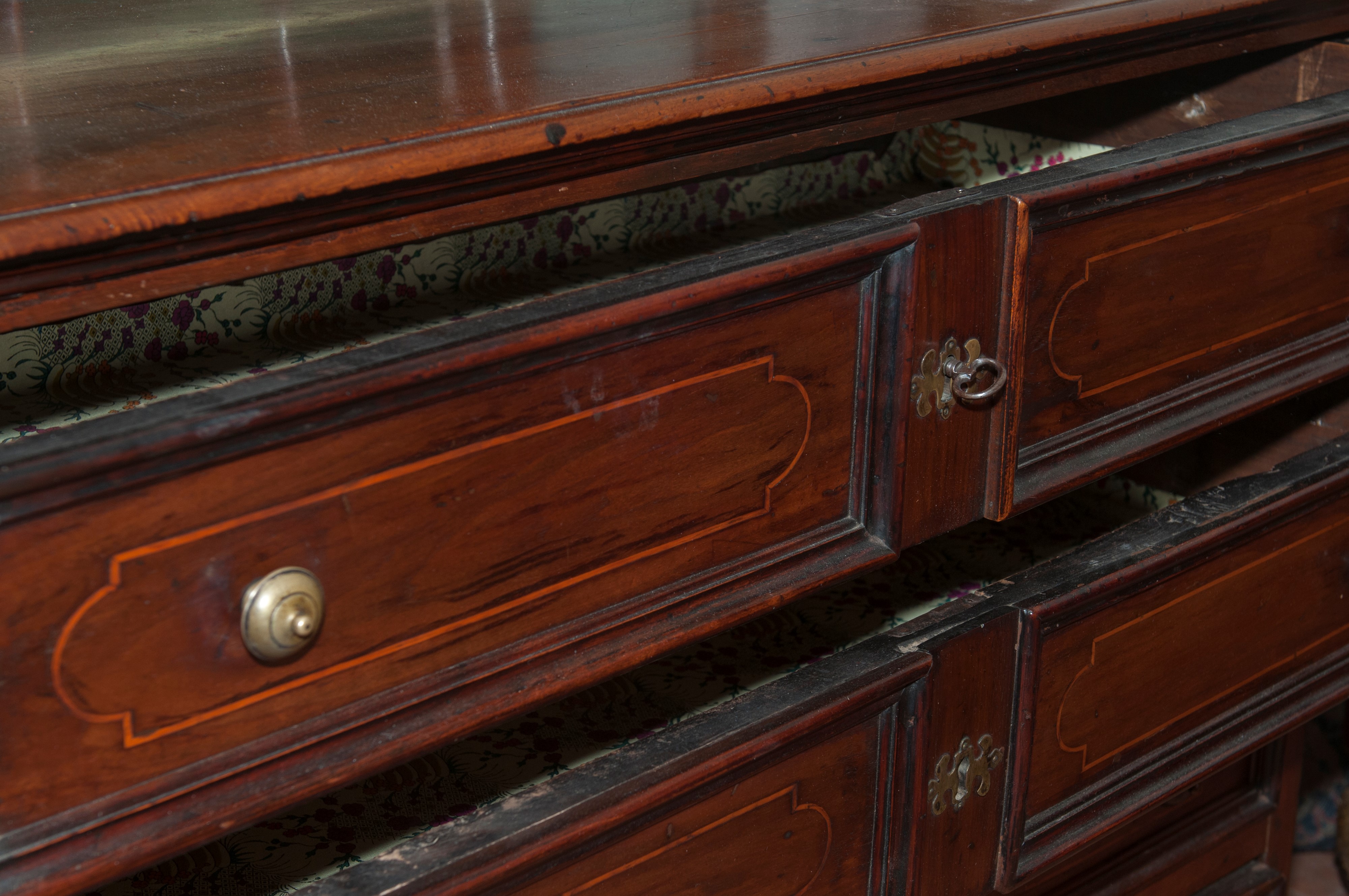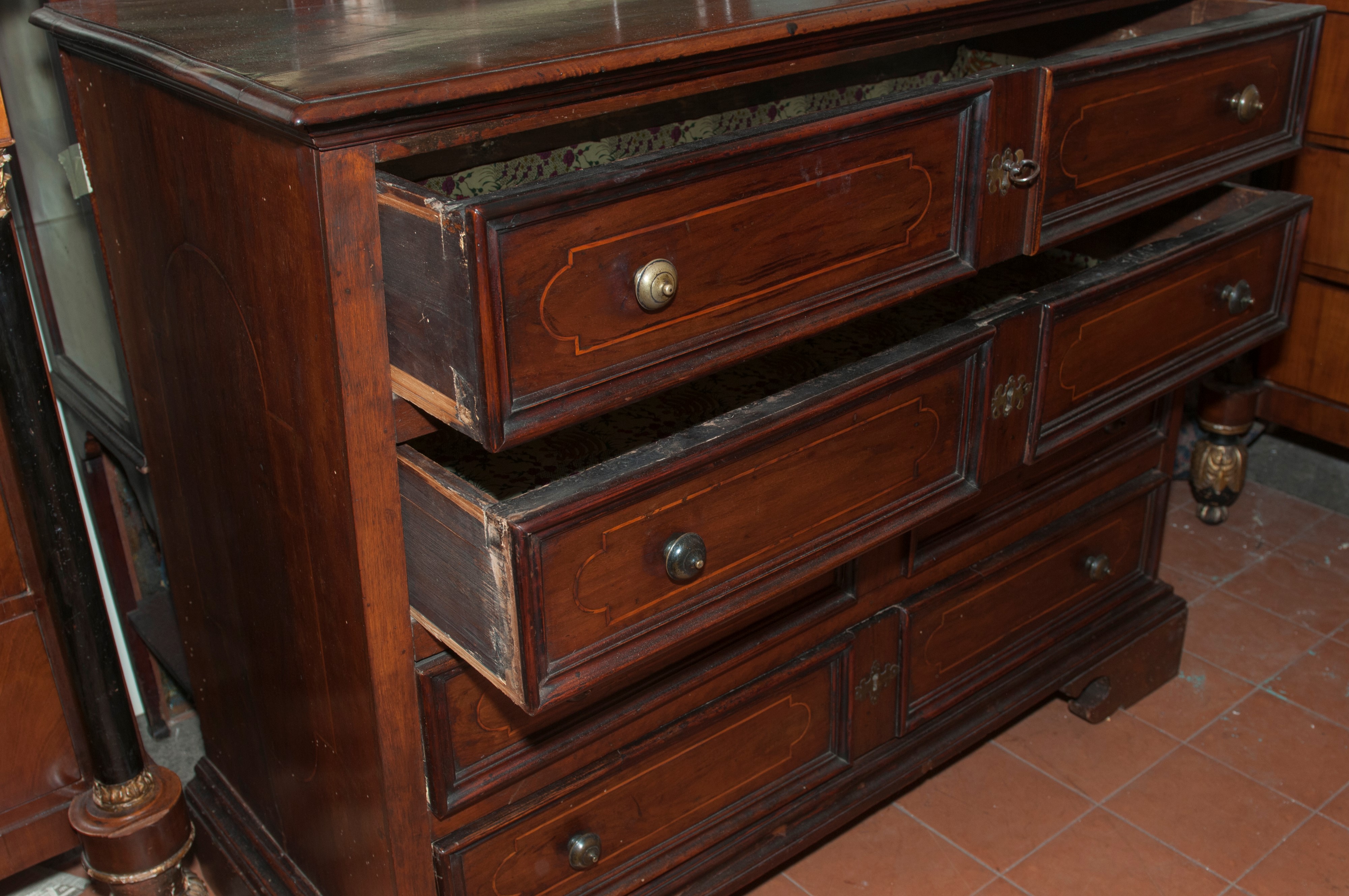 Cassettone di forma rettangolare in legno di noce a quattro cassetti, Italia centrale , fine XVII secolo