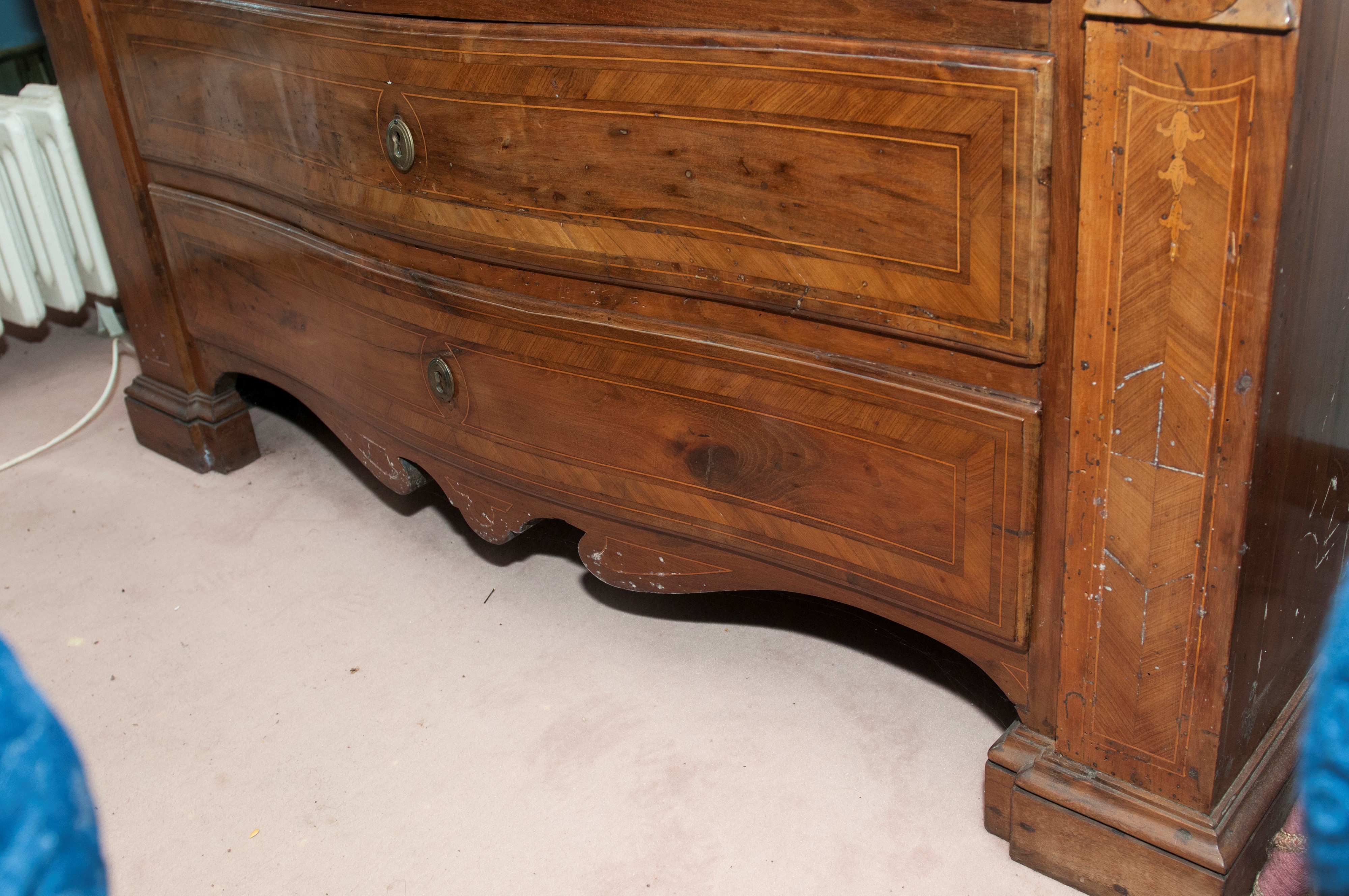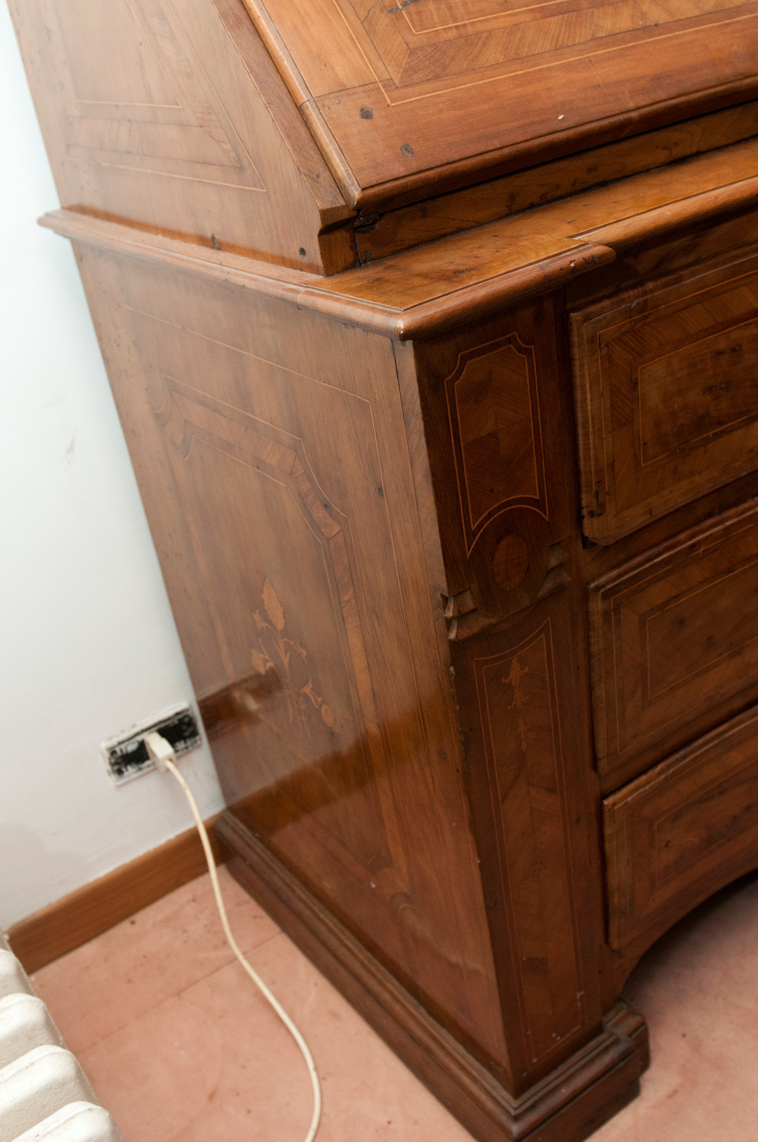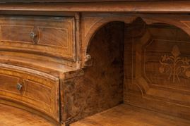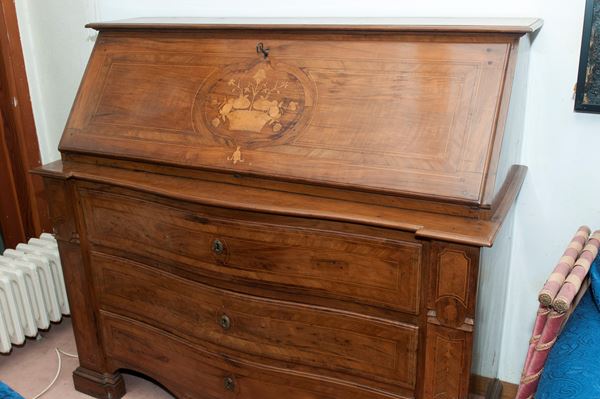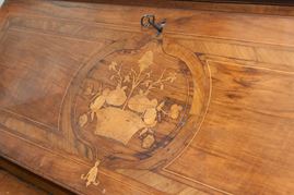 e tre cassetti. Corpo con fronte a balestra e fianchi rettangolari, ribalta con all'interno quattro cassetti con scomparto. Piedi con appoggio rettangolare. Sul fronte della ribalta tarsie con cesto e frutti e riquadrature geometriche sul fronte e sui fianchi. Ferramenta in bronzo.