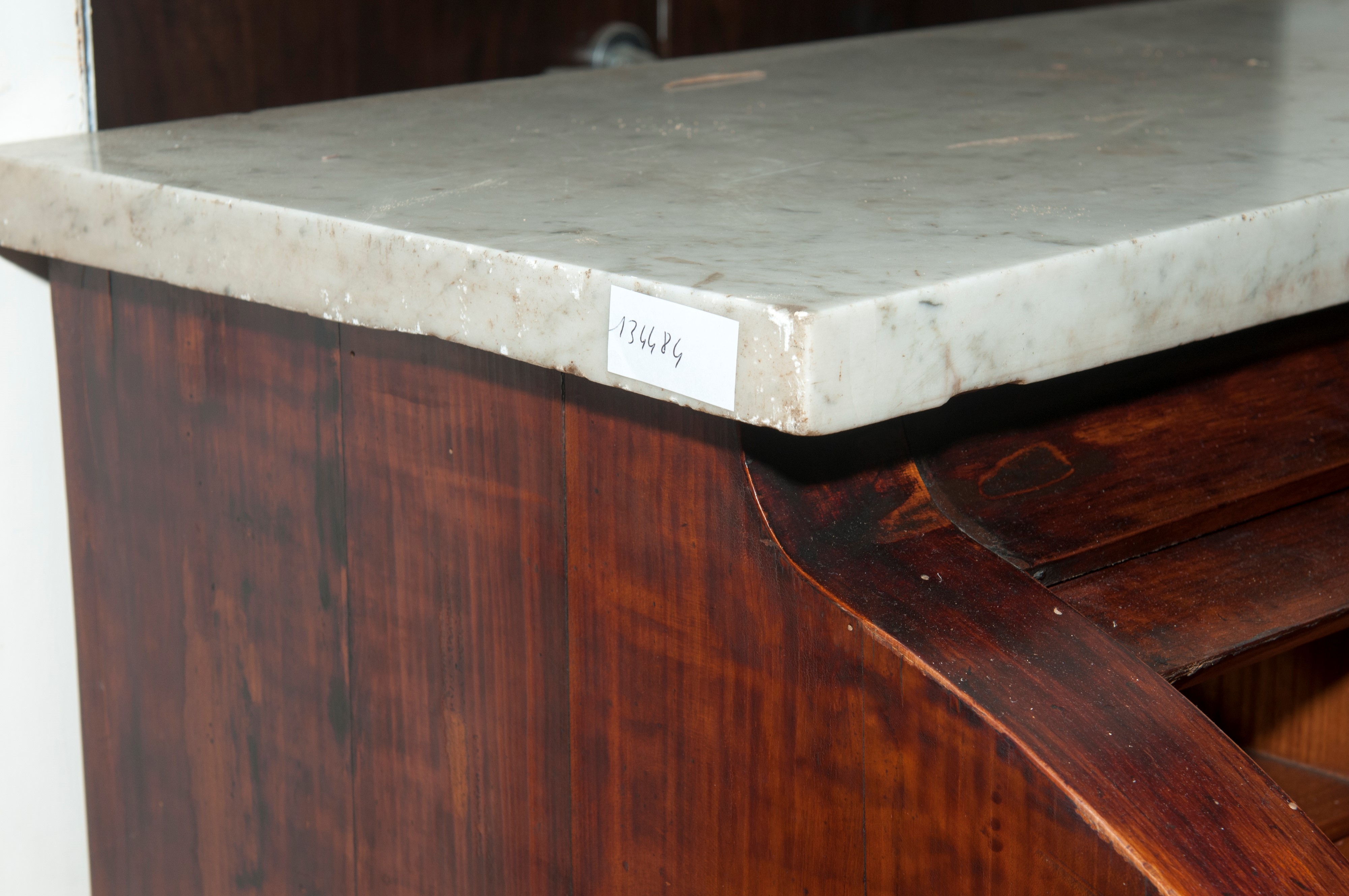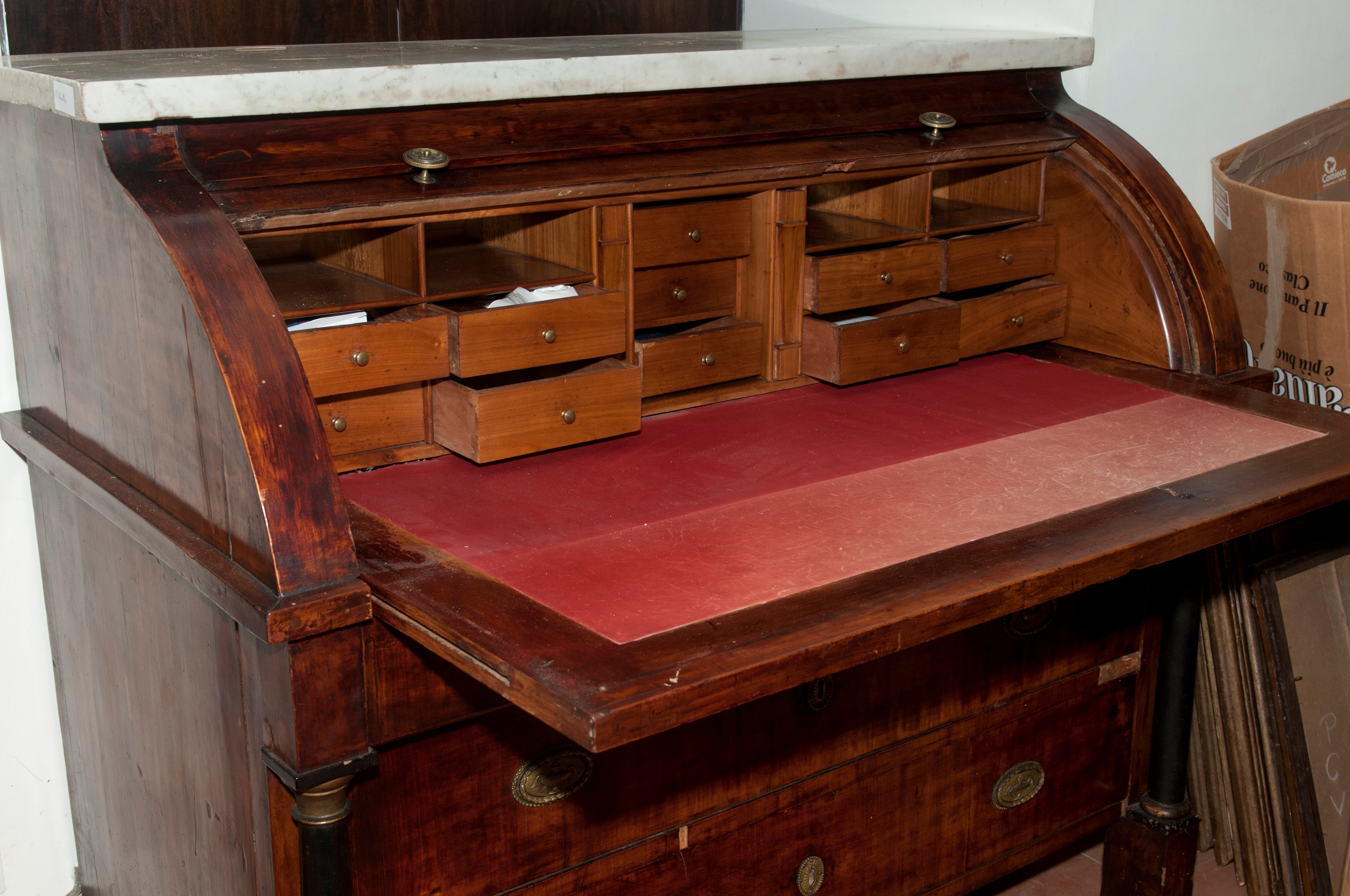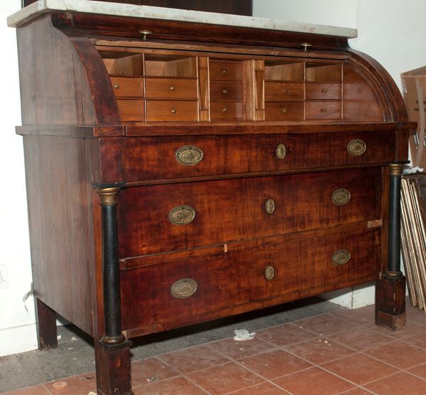 a tre cassetti dei quali  il più sottile aggettante nella fascia sotto il piano della alzata a cilindro con carabattola e cassettini. Di forma rettangolare desinente con piano in marmo bianco di Carrara, fianchi lisci , fronte con coppia di colonne ebanizzati con capitelli dorati. Piede a plinto anteriormente e posteriori dritti.