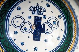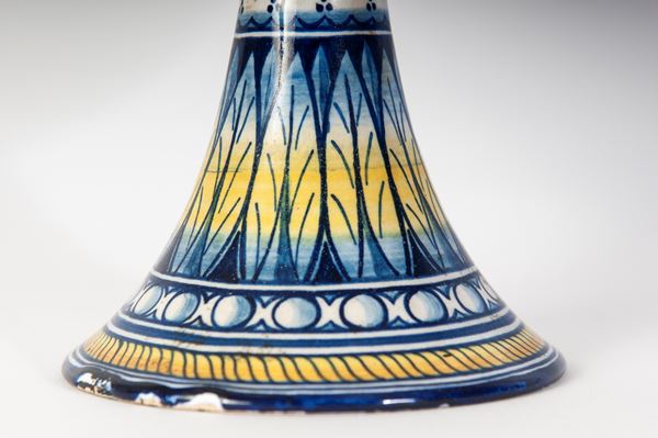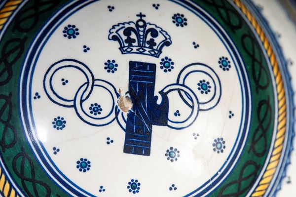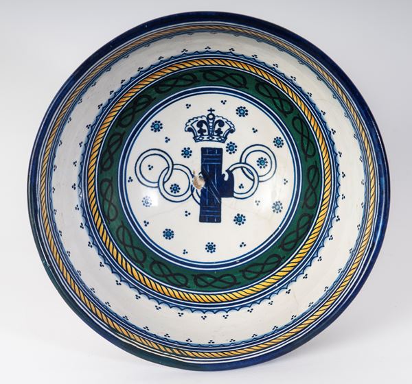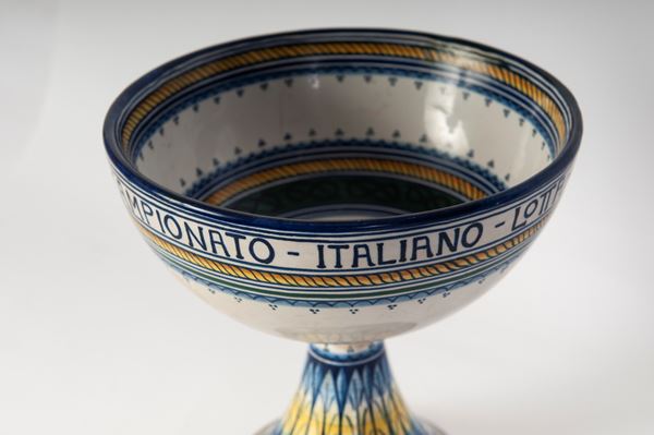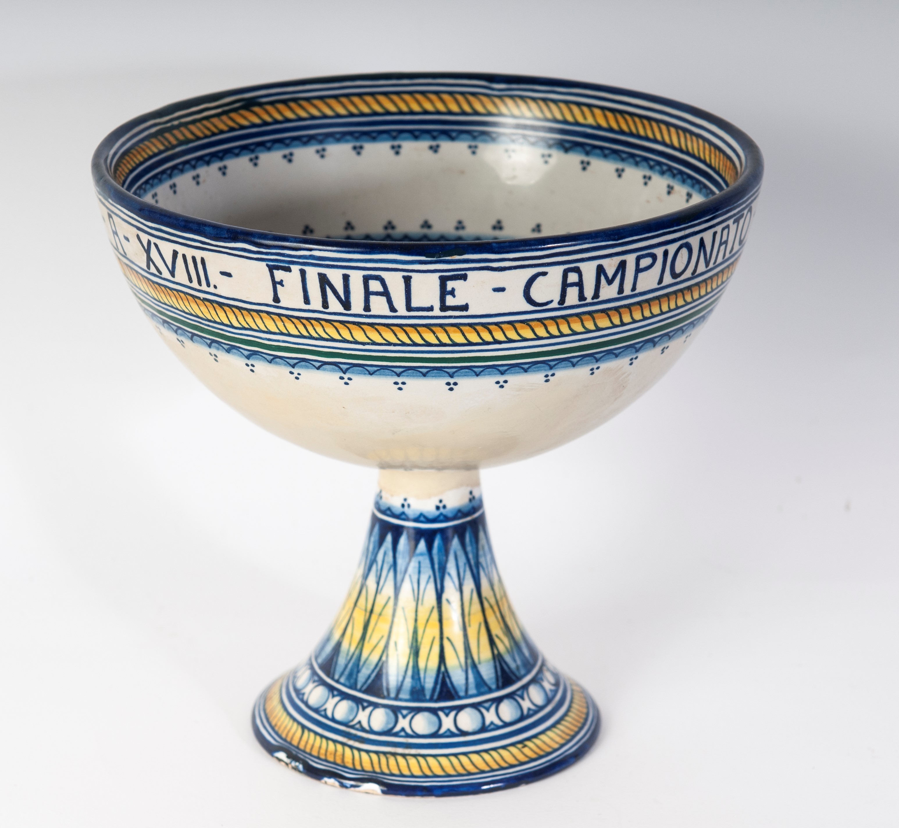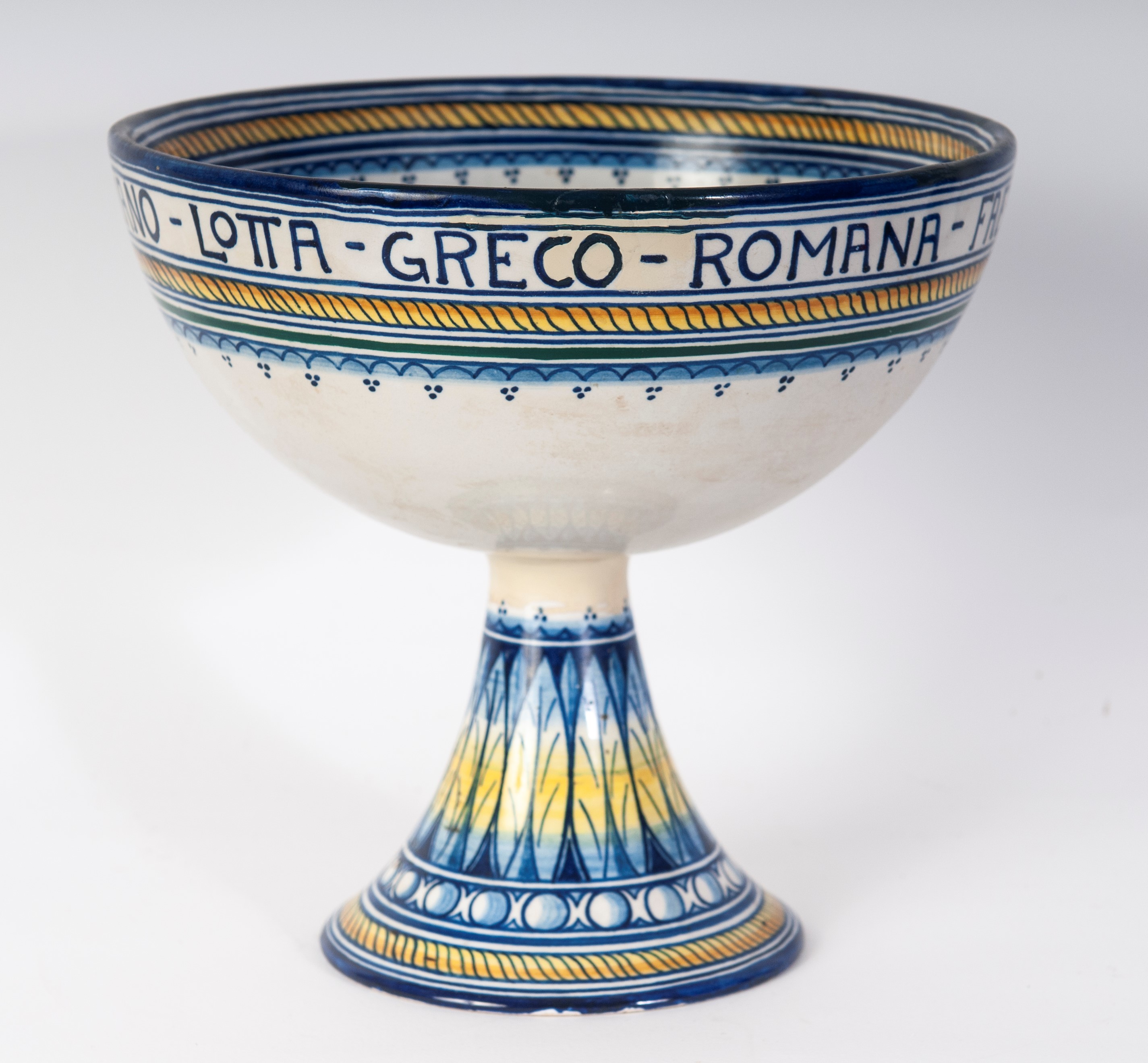 dal corpo a bacile e appoggio troncoconico, rastremato verso l'alto . Decoro con anelli olimpici e fascio Vittorio coronato, motivi geometrici in blu e cordonature in giallo. All'esterno lungo il margine superiore della coppa su fondo bianco entro riserve blu. Decoro del piede a palmette stilizzate finale campionato italiano di lotta greco/romana. Manifattura R. Gatti ,Faenza anno XVIII (1940) secolo.
