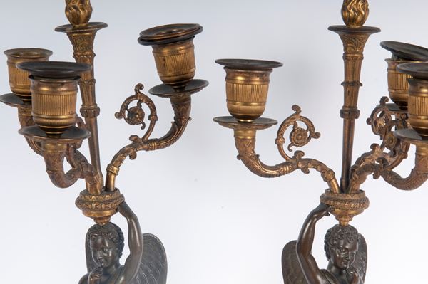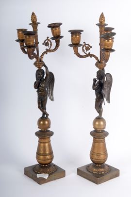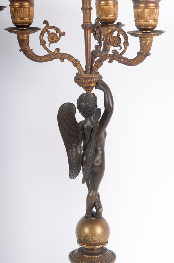 in bronzo ed ottone, composti da  fusto con angioletto poggiante su colonna stilizzata loricata a base quadrata. Sulla testa tre portacandele.