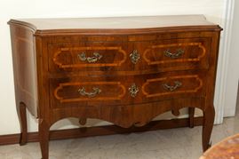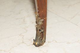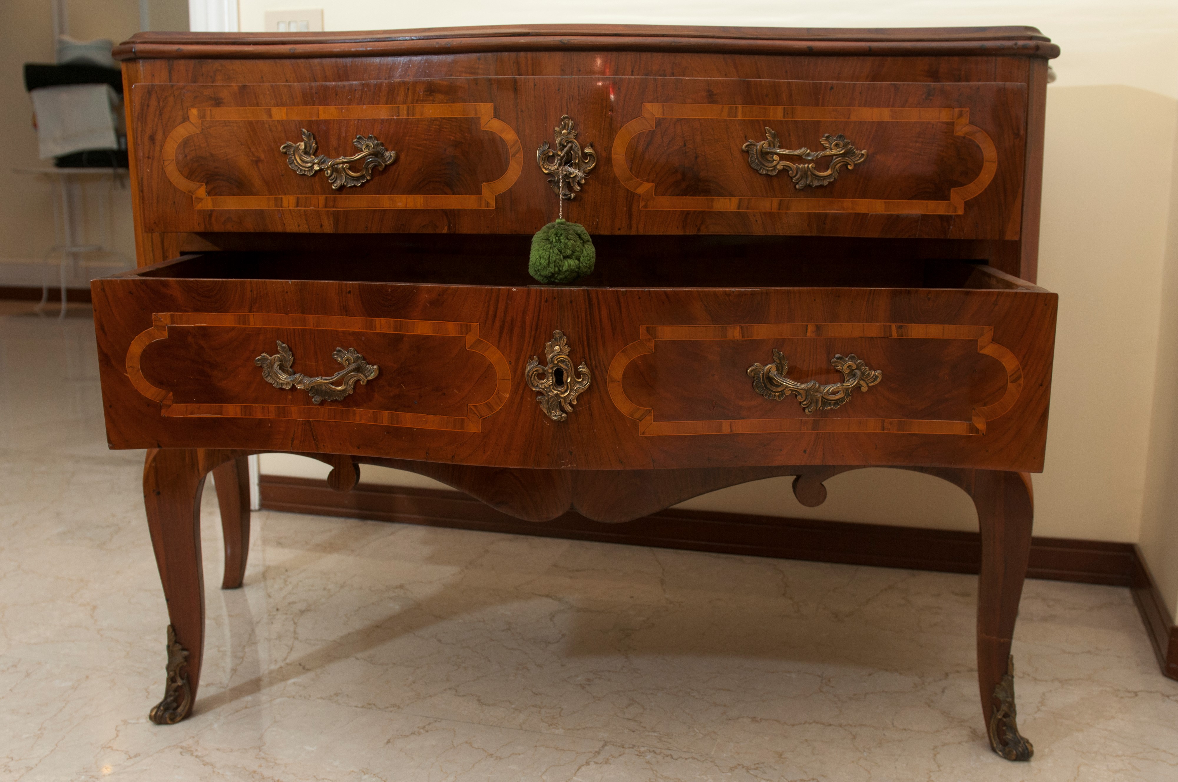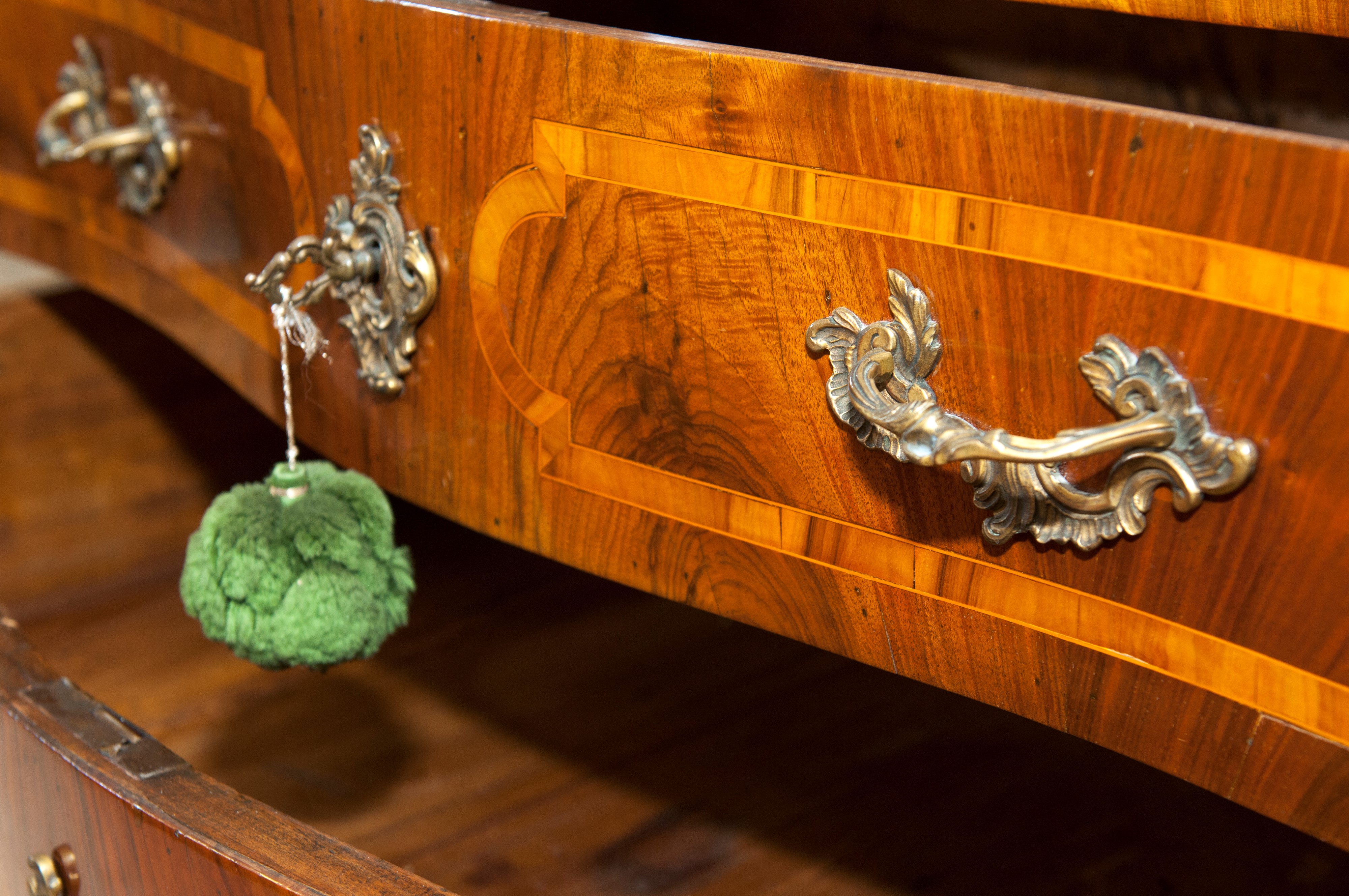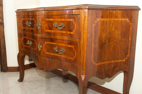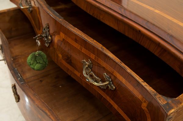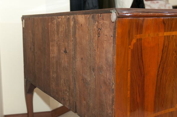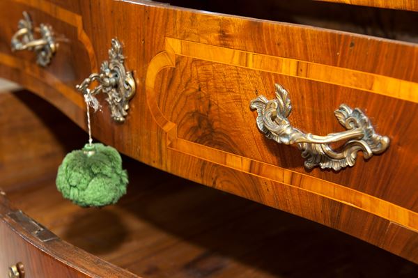 a due cassetti, fronte a balestra fianchi centinati e gambe a sciabola, riquadrature in legno di frutto sul fronte , fianchi e piano. Ferramenta in bronzo cesellato con calzari alle gambe anteriori.