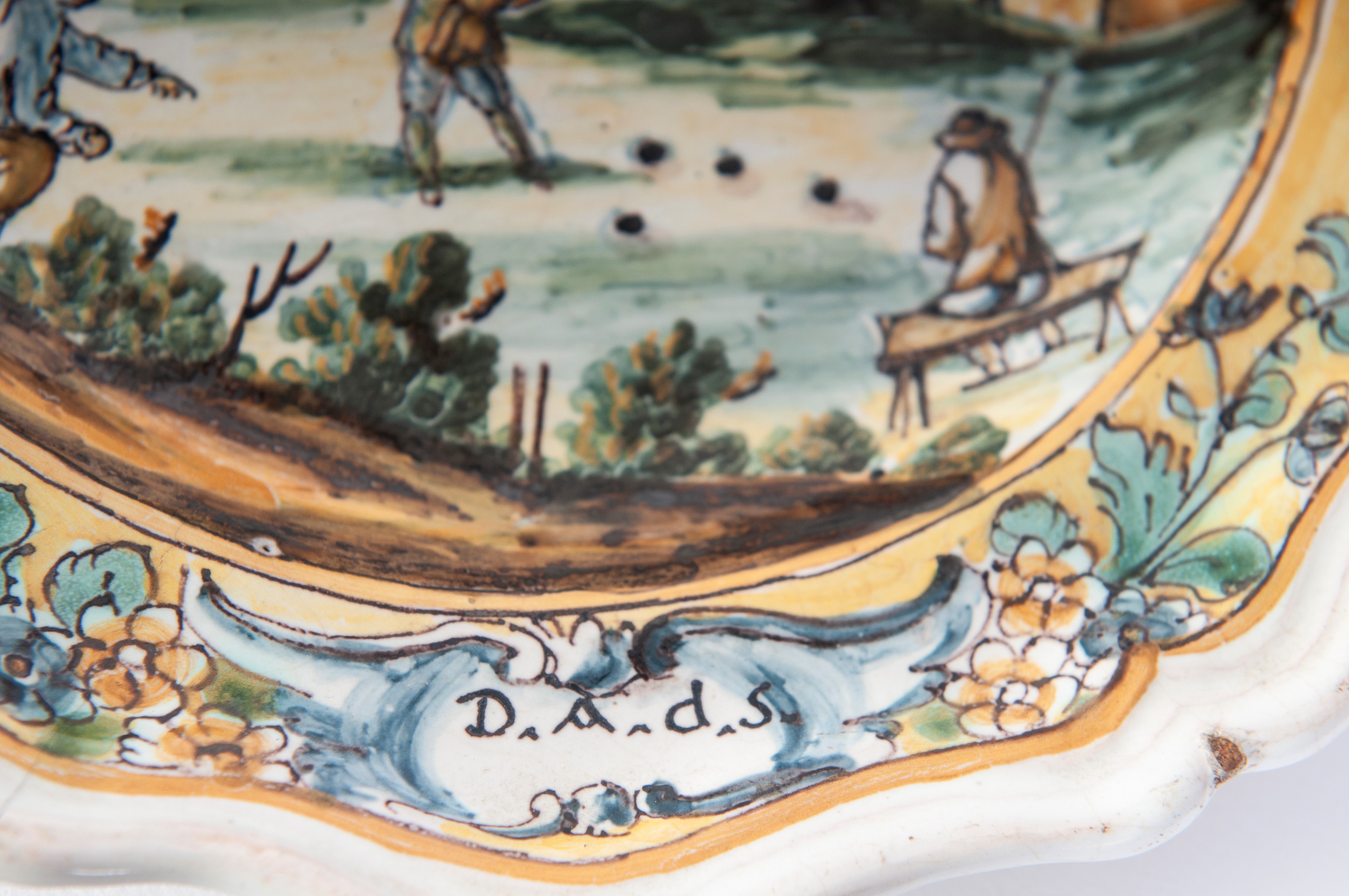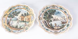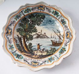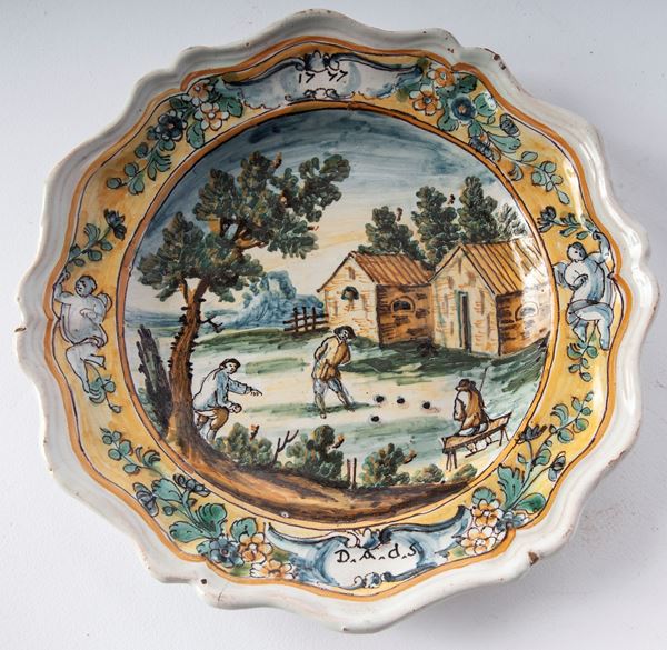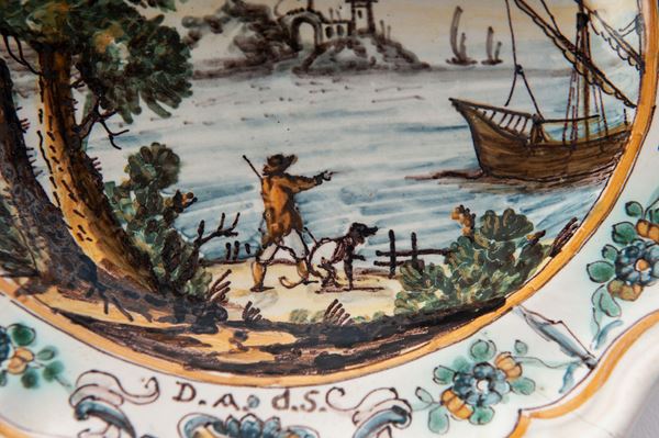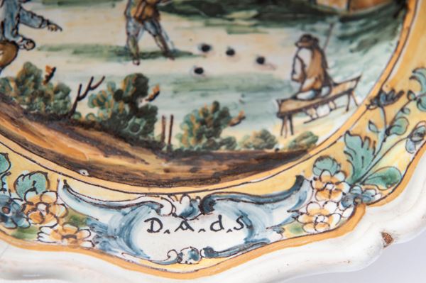 in ceramica a sei punte, dal bordo mistilineo con stretta tesa ,corto balza , ampio fondo. Al retro fondo liscio. Decoro con paesaggio e personaggi. Manifattura campana, seconda metà XVIII secolo