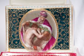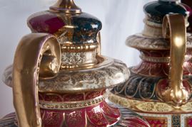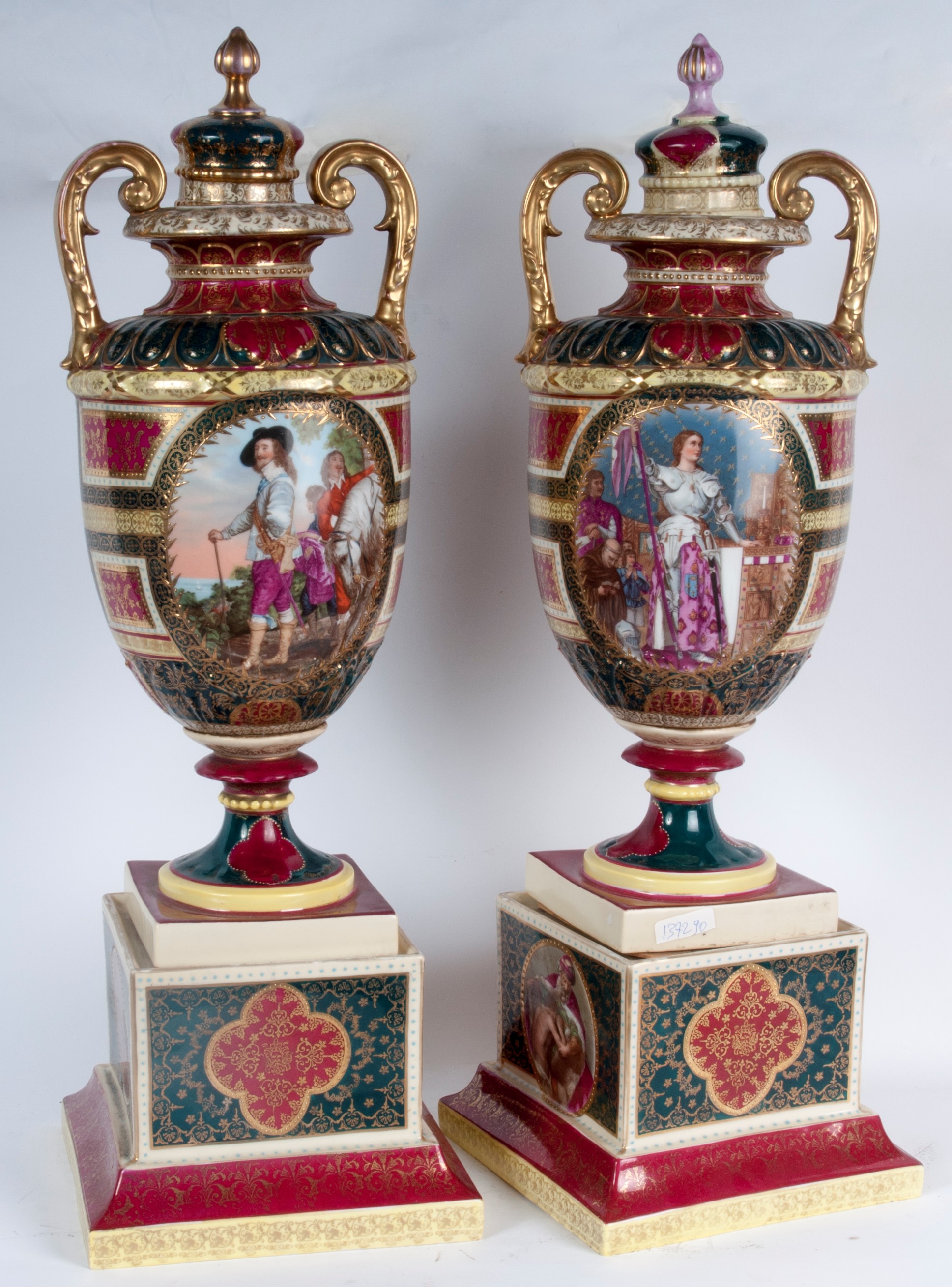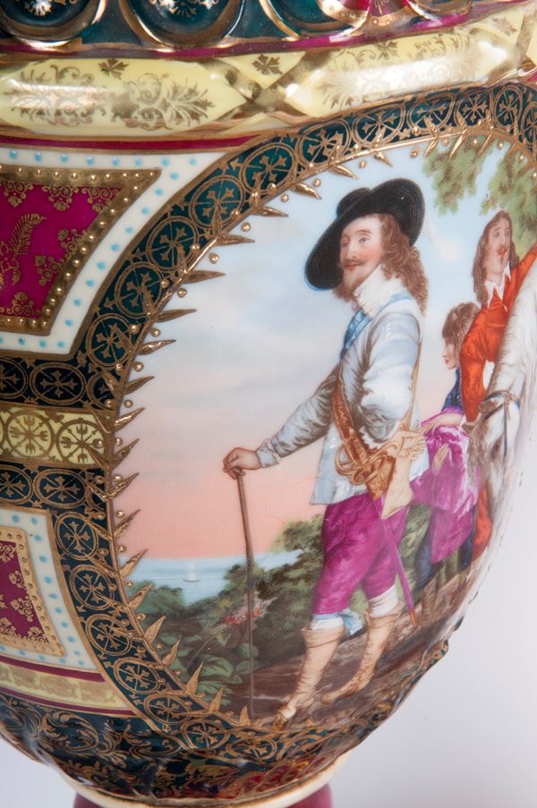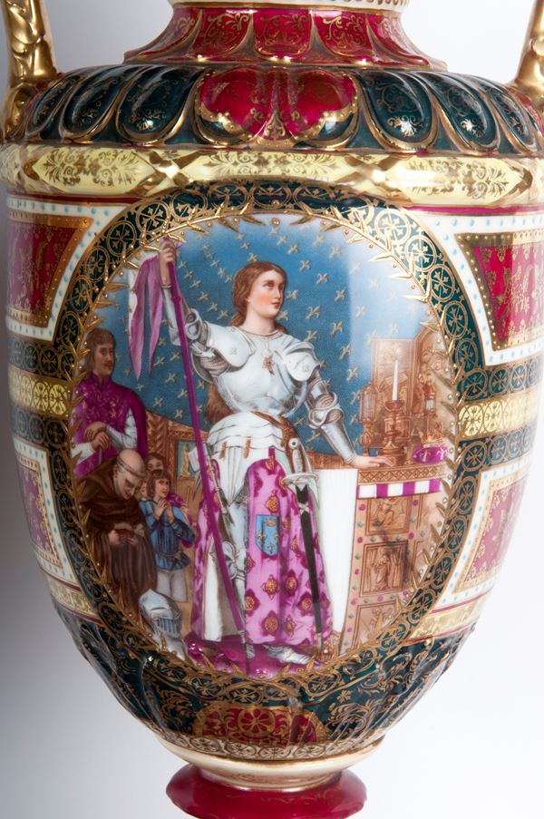 in porcellana policroma, costituiti da corpo a balaustro con coperchio montato su alta base quadrangolare. Anse a virgola. Decoro con Giovanna d'Arco e coppia di cavalieri entro riserva dorata. Finiture in oro zecchino. Manifattura di Vienna, fine XIX inizi XX secolo