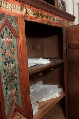 di forma rettangolare in legno di pioppo laccato con decori a motivi floreali. Iscrizione ad inchiostro sotto la cornice del cappello, decori con cornici in legno a motivi geometrici sul fronte della credenza. Interno a tre ripiani.