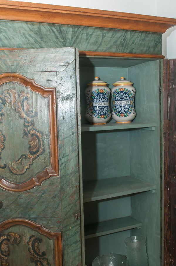 di forma rettangolare a due sportelli con riquadrature a cornici dorate e piedi a mensola. Decoro a roccailes sul fronte. All'interno tre ripiani.
