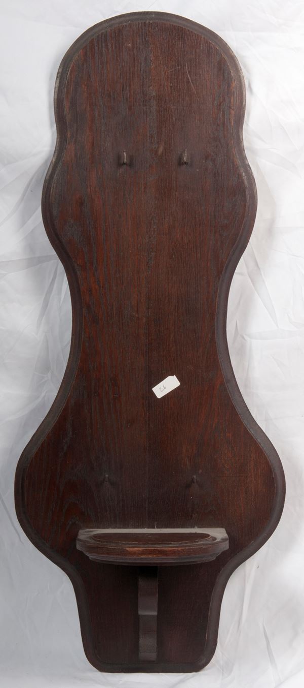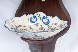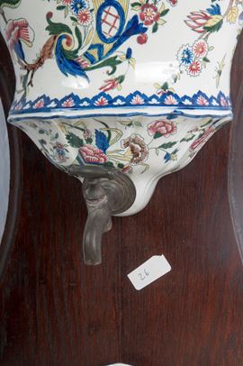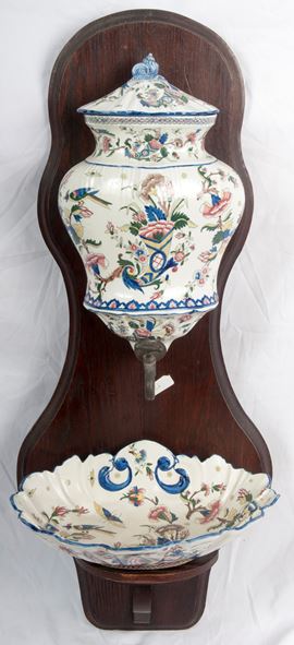 a decoro floreale su fondo bianco con serbatoio e bacile su appoggio in legno. Manifattura francese, prima metà XX secolo