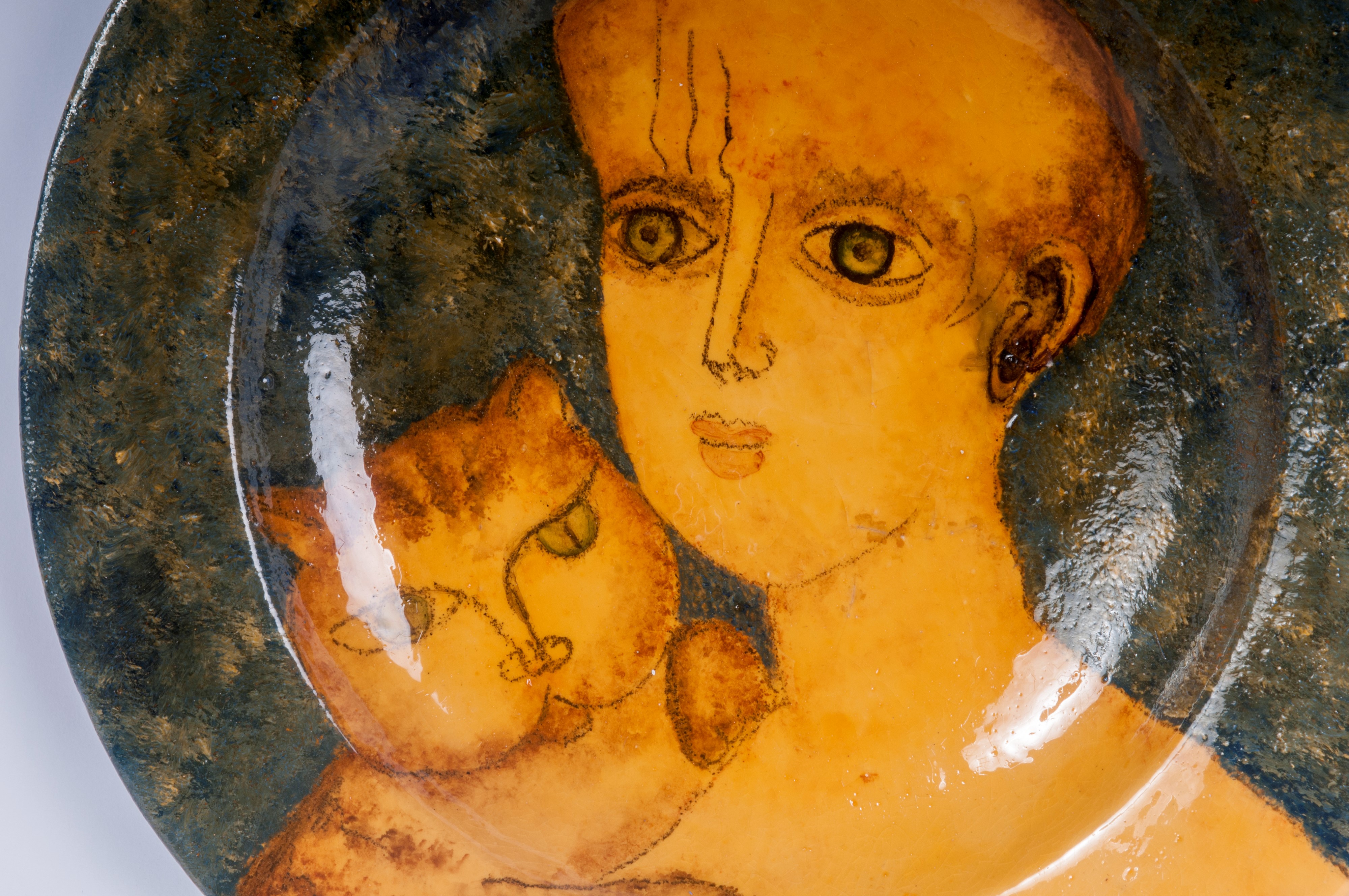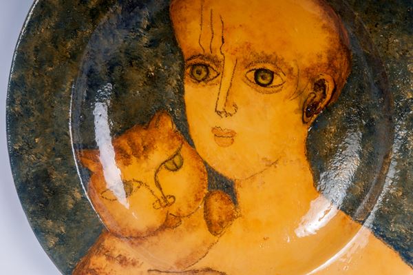 Decoro con volto di donna e gatto in ocra su fondo verde. Firmato al retro p.a. Manifattura G. Rossicone Milano