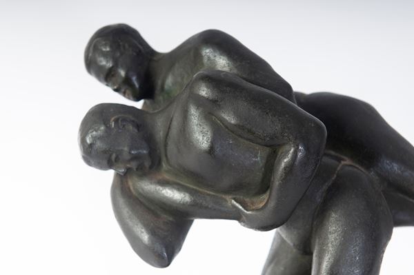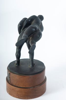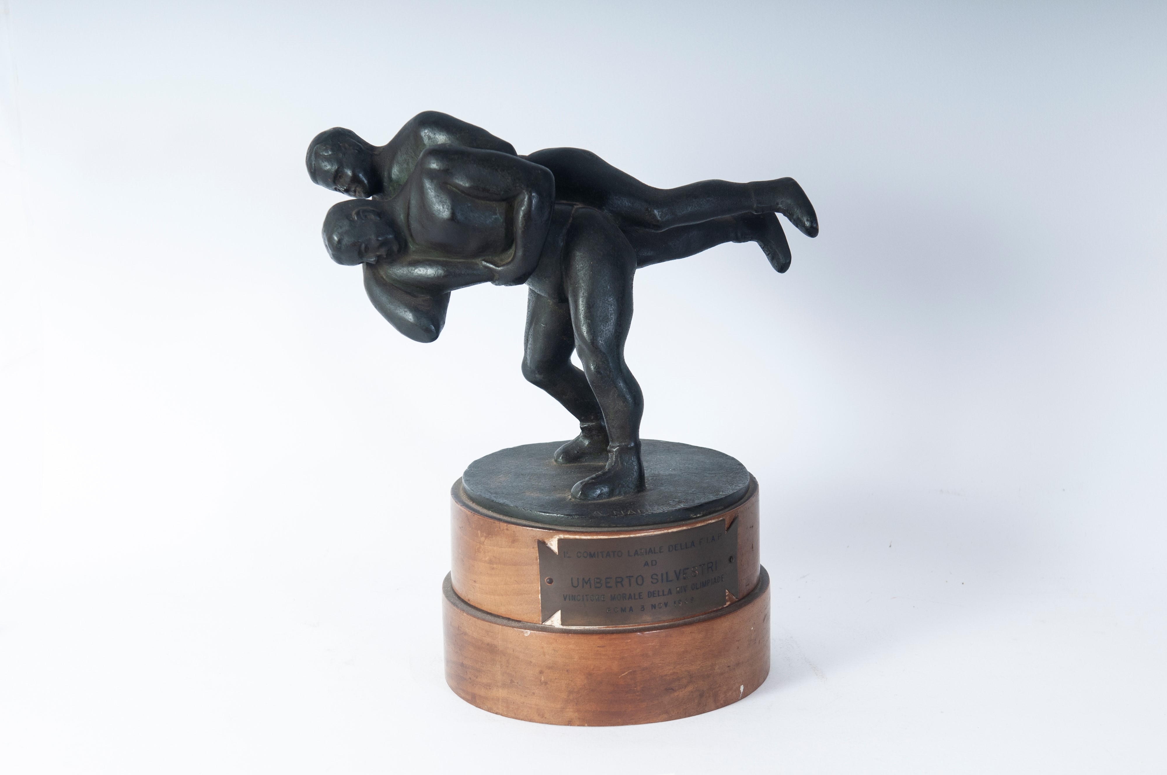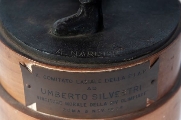 scultura in bronzo a patina bruna a tutto tondo su base in legno. con cartiglio dedicatorio, datato e firmato.