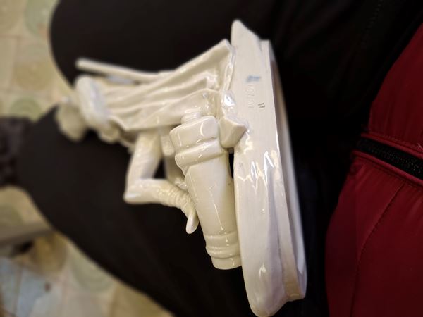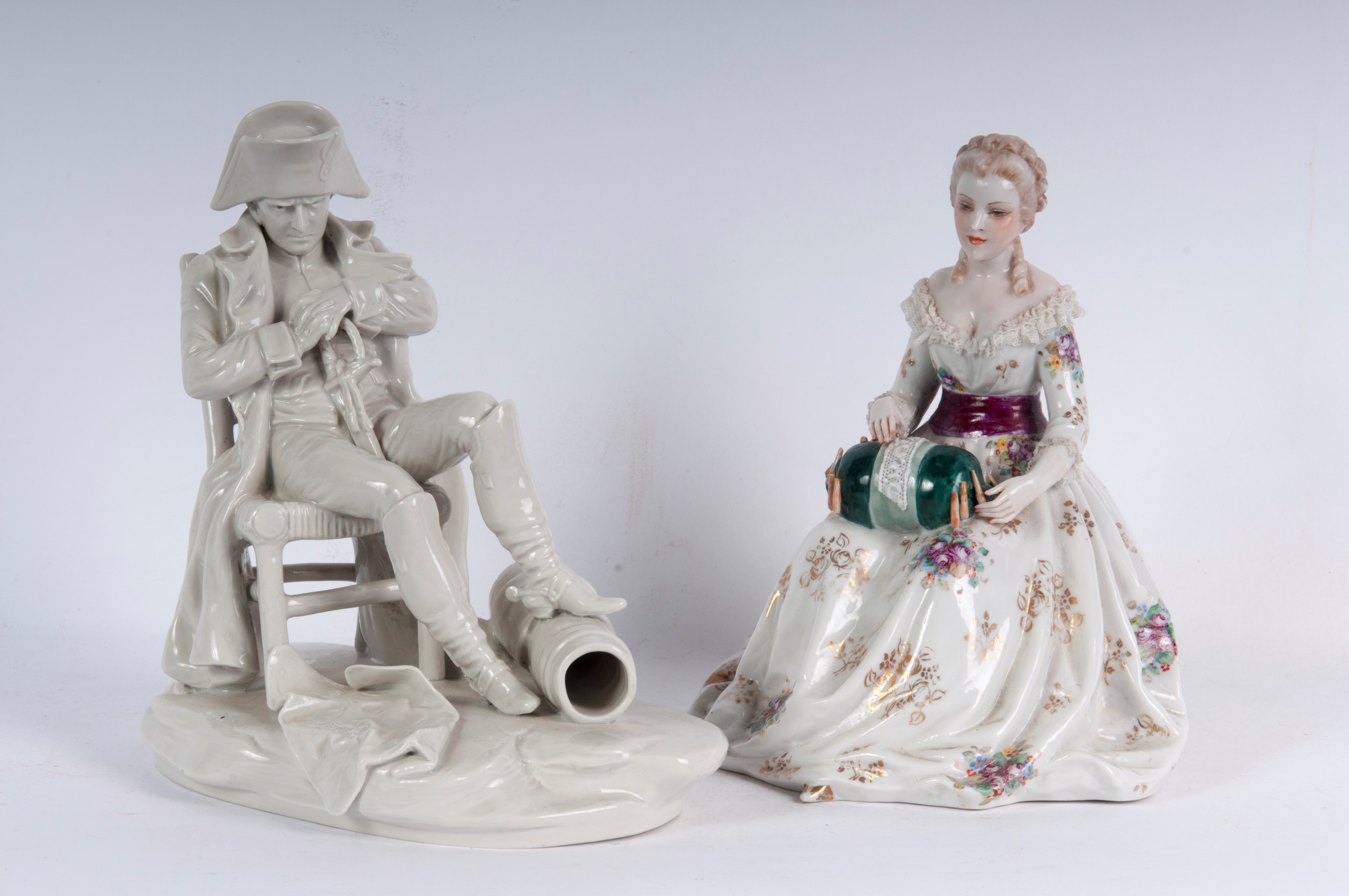 dama seduta che ricama 18 x 13 x 14 cm; Napoleone seduto 19 x 18 x 10 cm formatura a colaggio. Manifattura uno Ginori.
