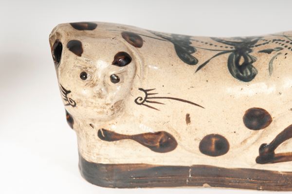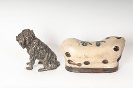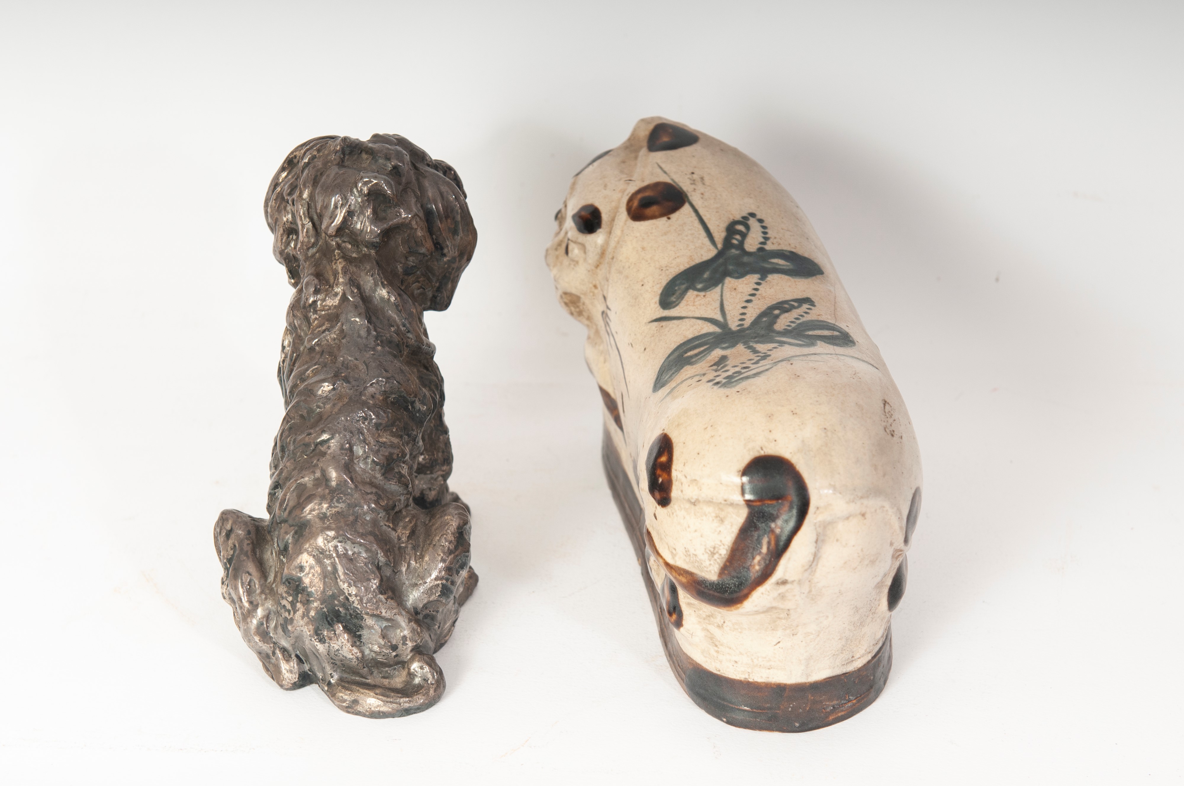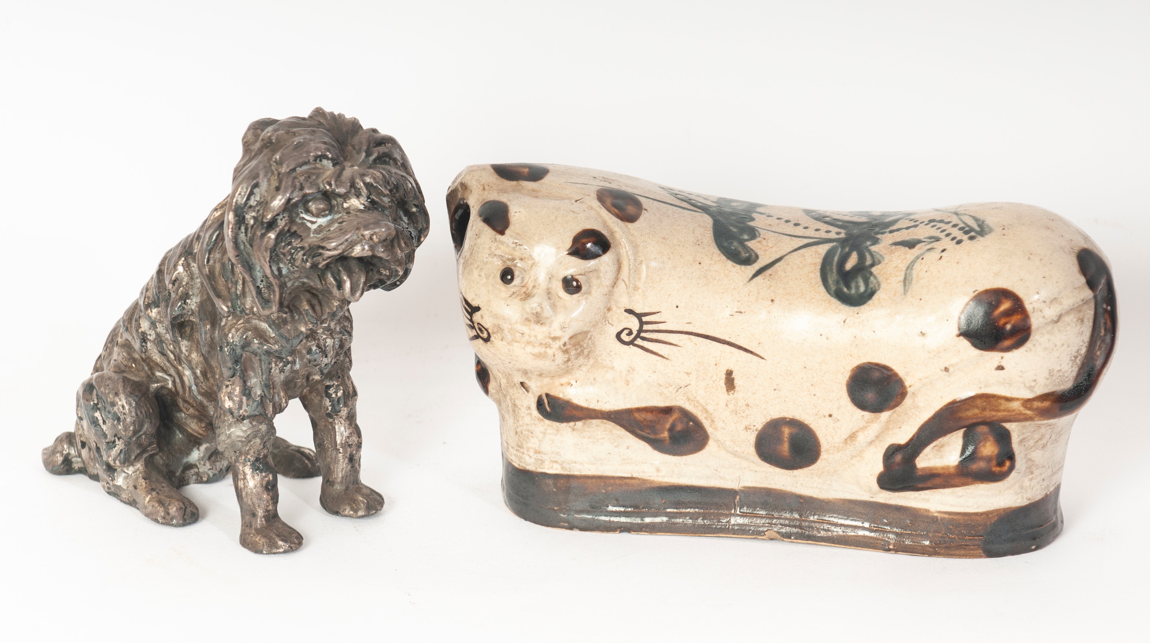 scalda mani in ceramica a forma di gatto color nocciola a taches marroni e cane in ceramica argentata.
