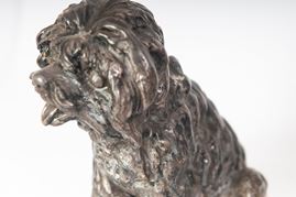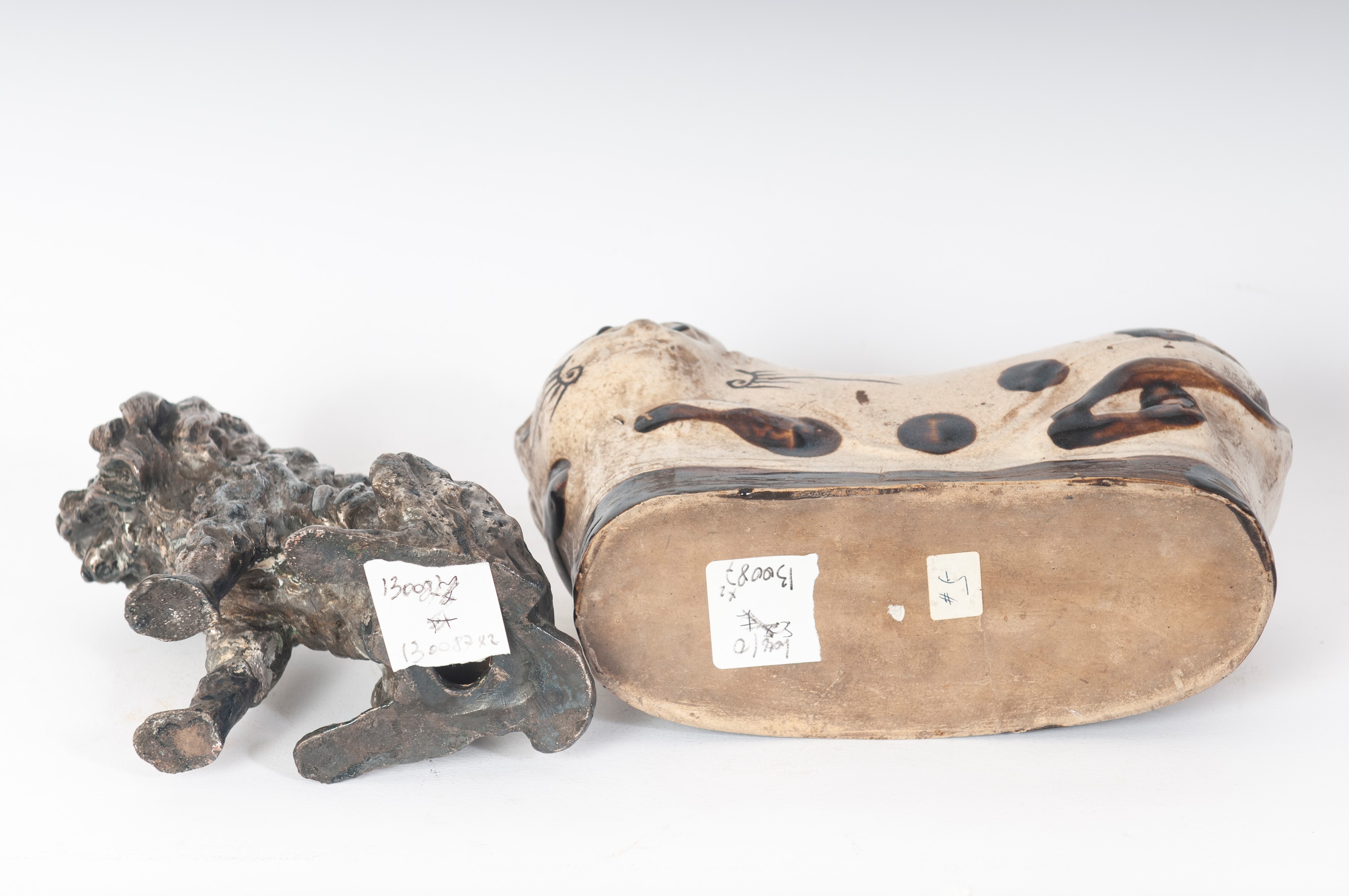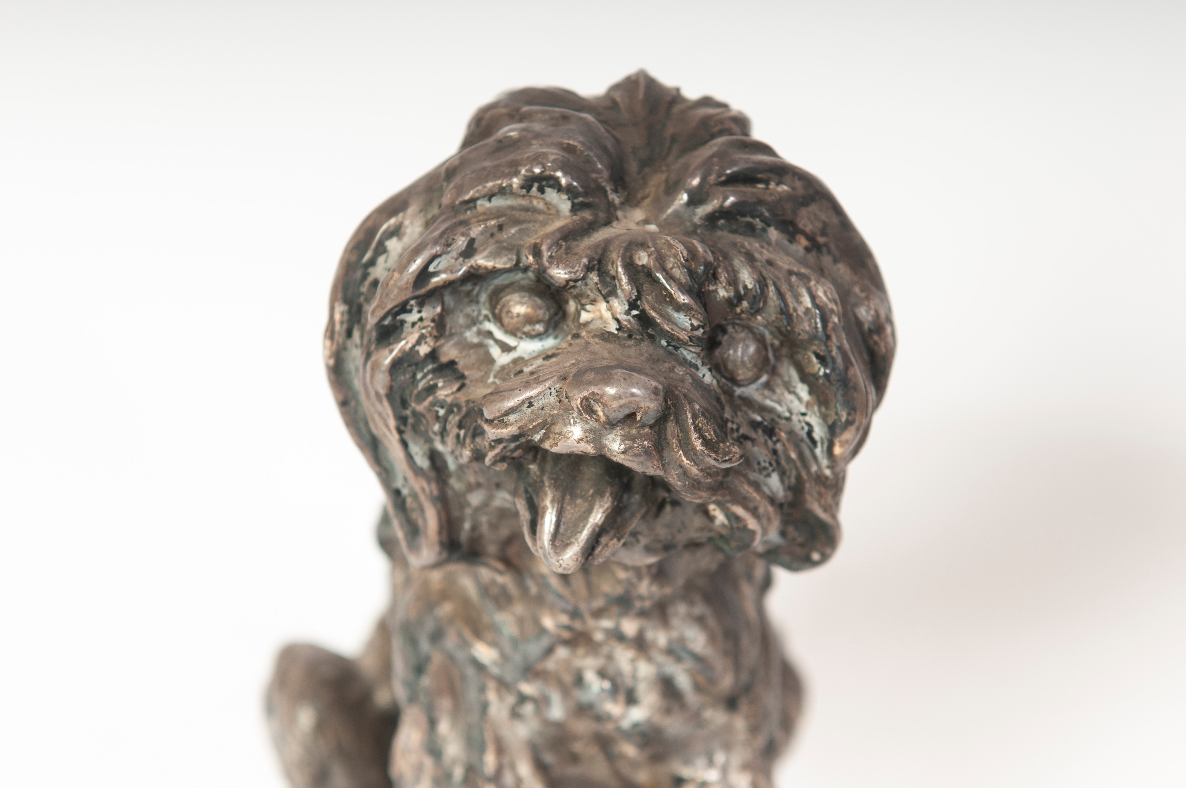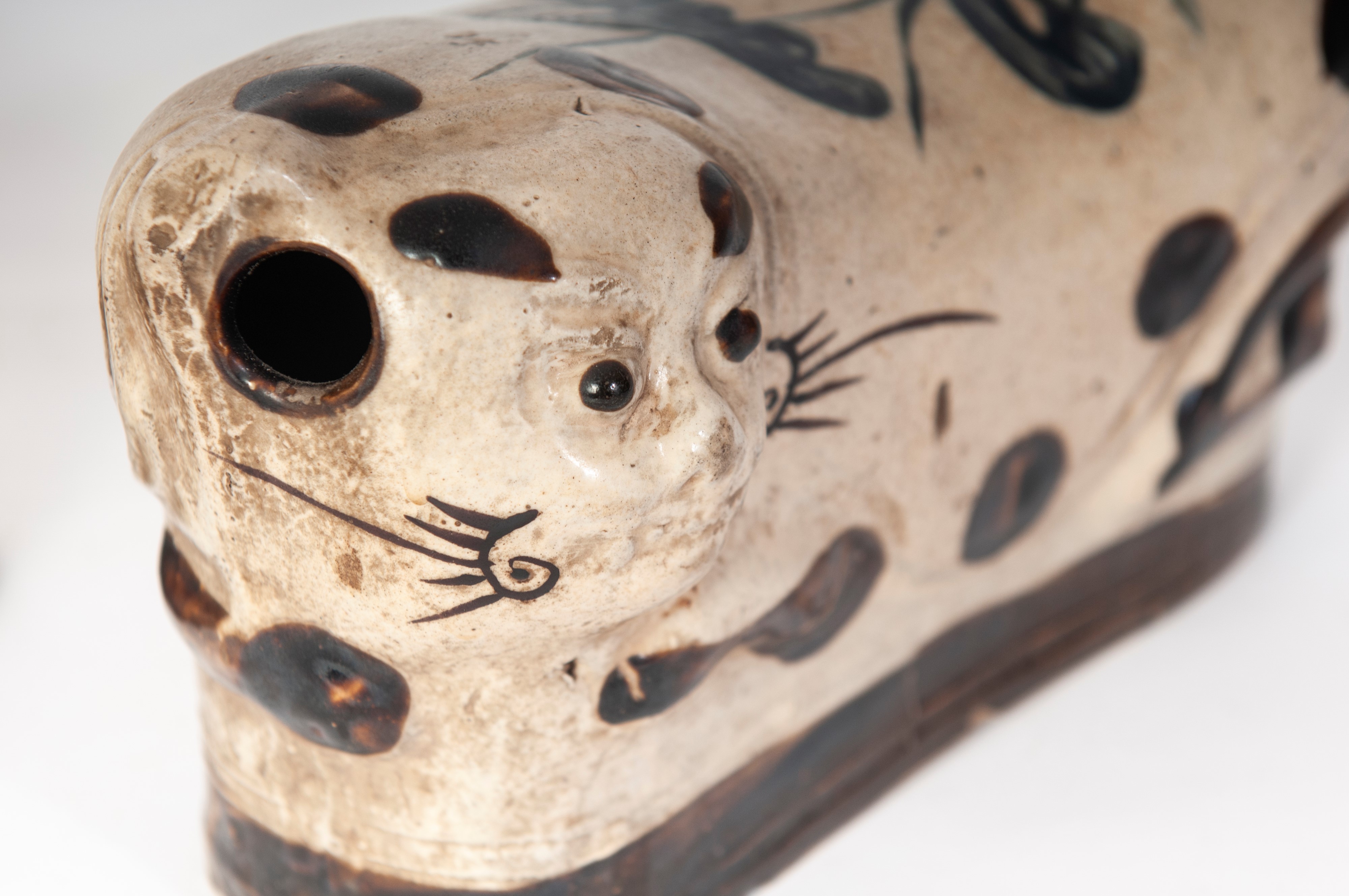 scalda mani in ceramica a forma di gatto color nocciola a taches marroni e cane in ceramica argentata.