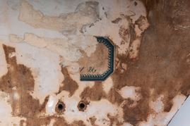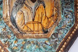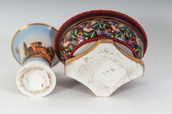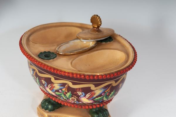 mattonella ottagonale policroma con raffigurazioni di Cristo 25,5 x 22 x 2 cm. Calamaio a tre vasche in porcellana policroma di forma ovale poggiante su quattro piedini zoomorfi con decoro a volatili su fondo bordeaux . Vasca centrale superiore con coperchio e finiture in oro zecchino 8 x 14,5 x 12. Vasetto a tromba in porcellana con decoro di paesaggio a tutto campo su fondo azzurrato 10,5 x 8,8 x 5,4 cm