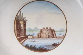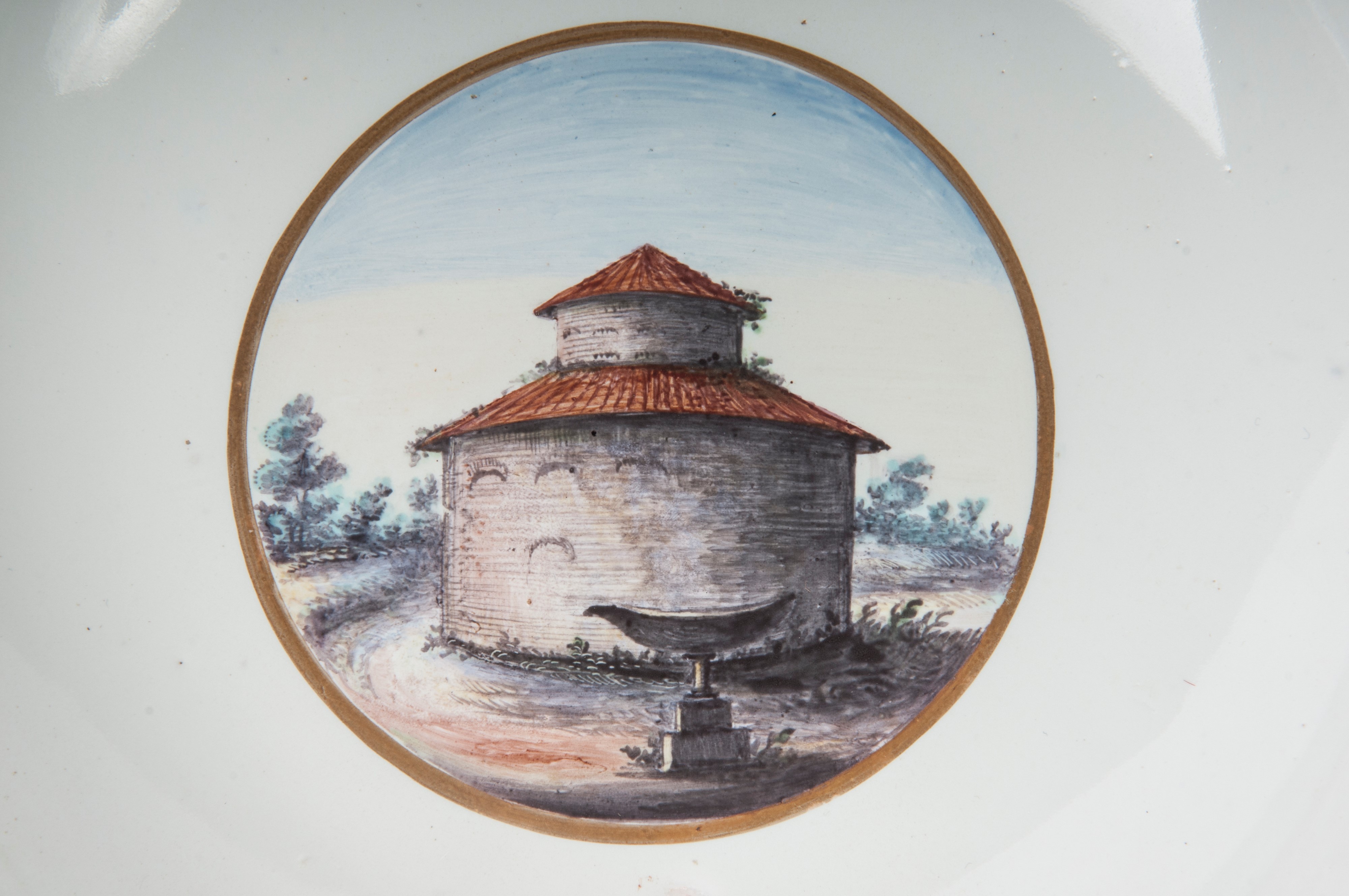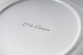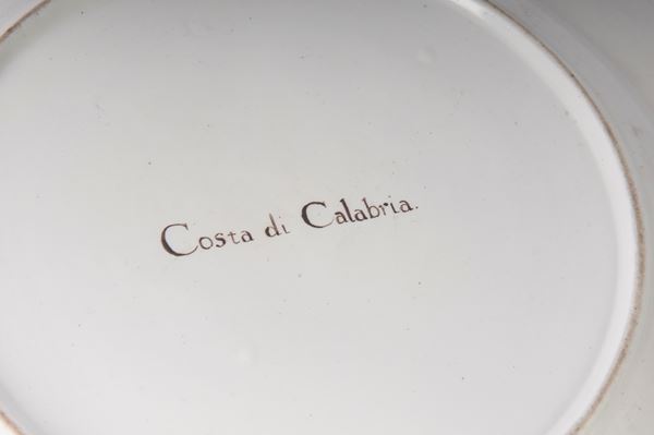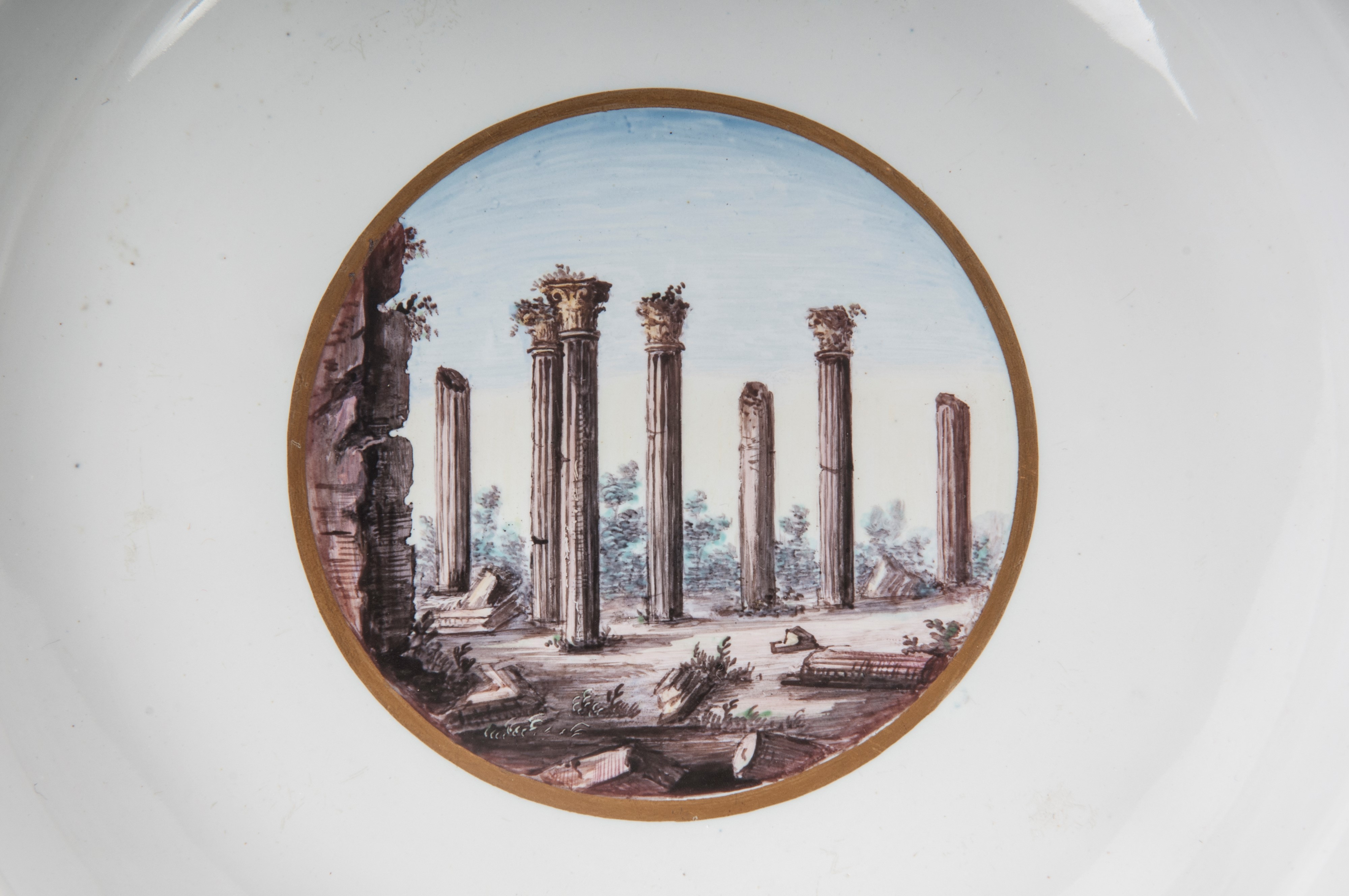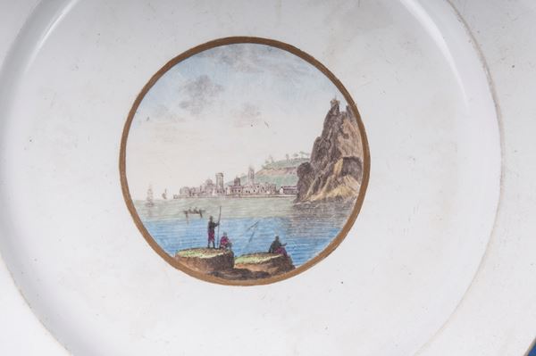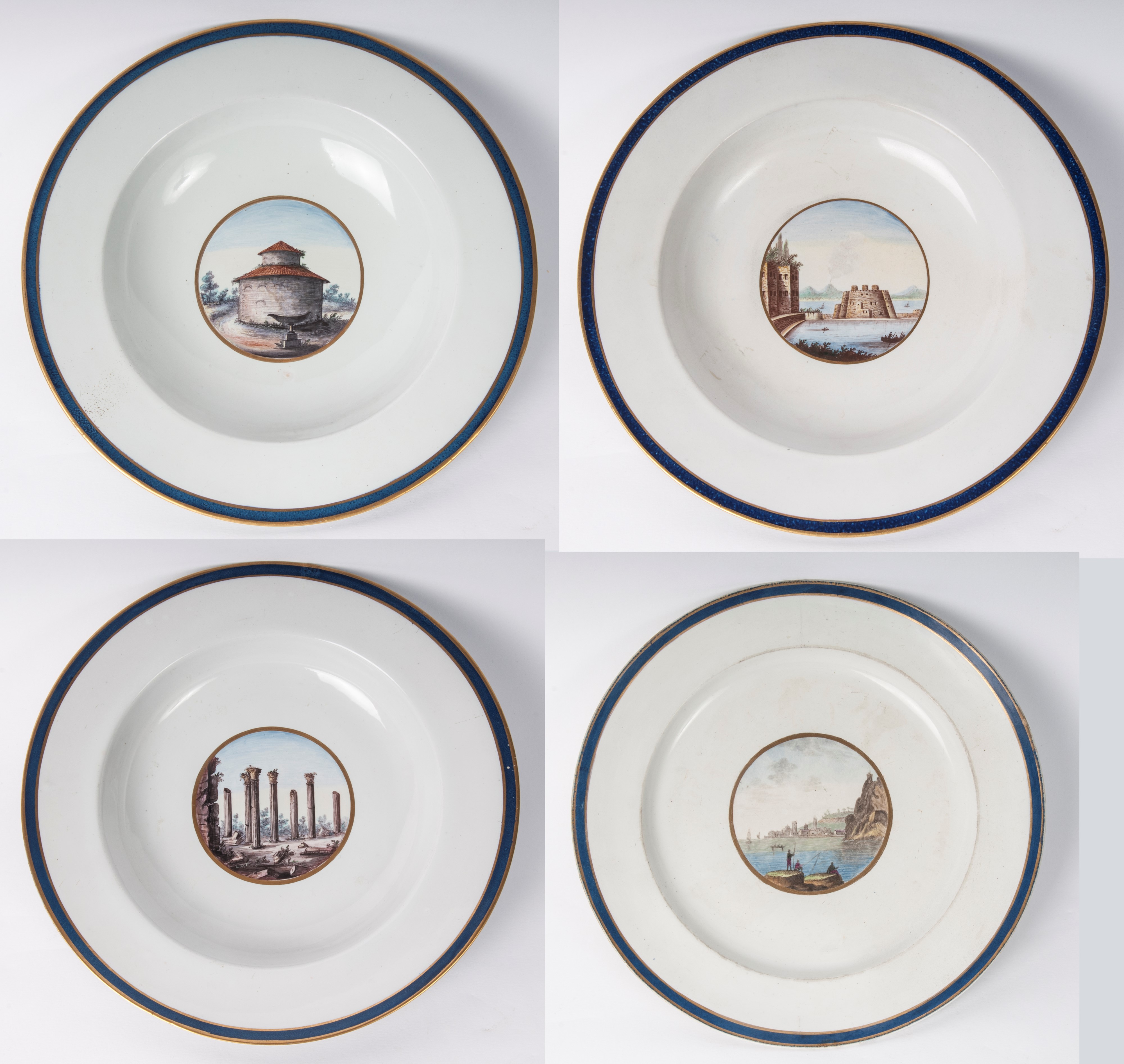 Ampia tesa con ripida balza e largo fondo, al retro appoggio ad anello con fondo leggermente ribassato. Decoro con veduta dei monumenti di Roma/Calabria e Napoli entro riserva dorata su fondo bianco. Bordo blu cobalto con doppia profilatura in oro zecchino.