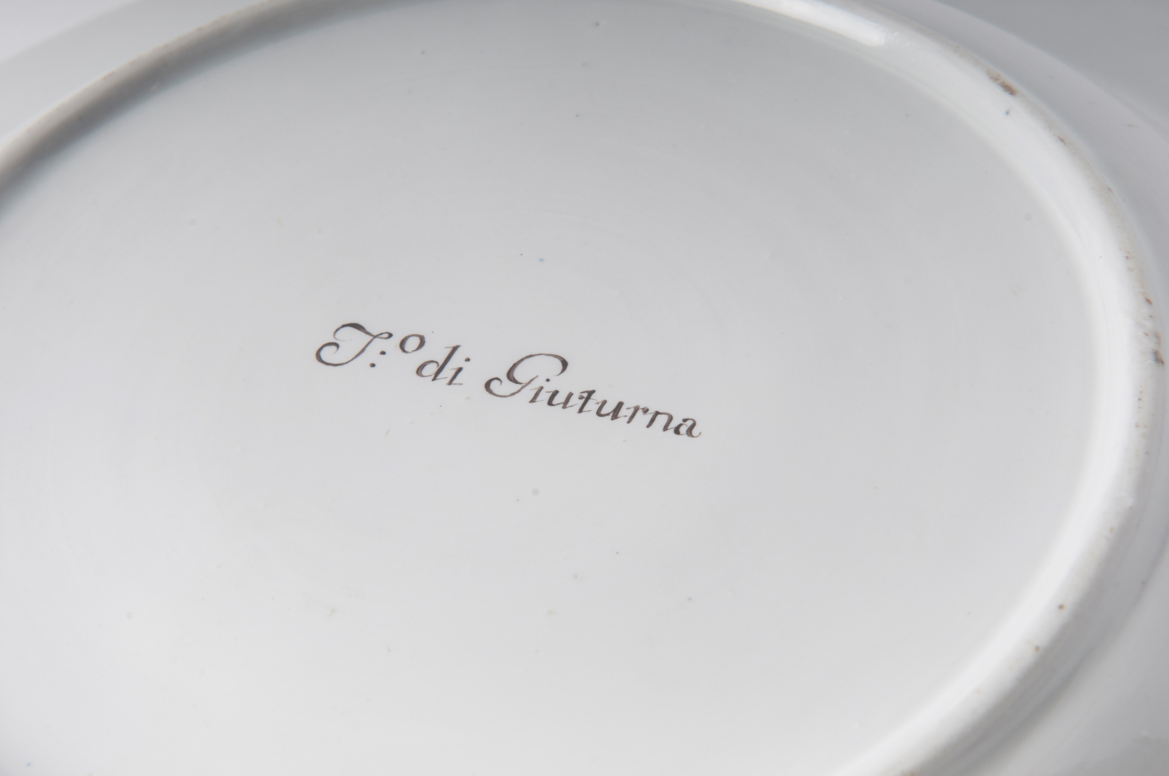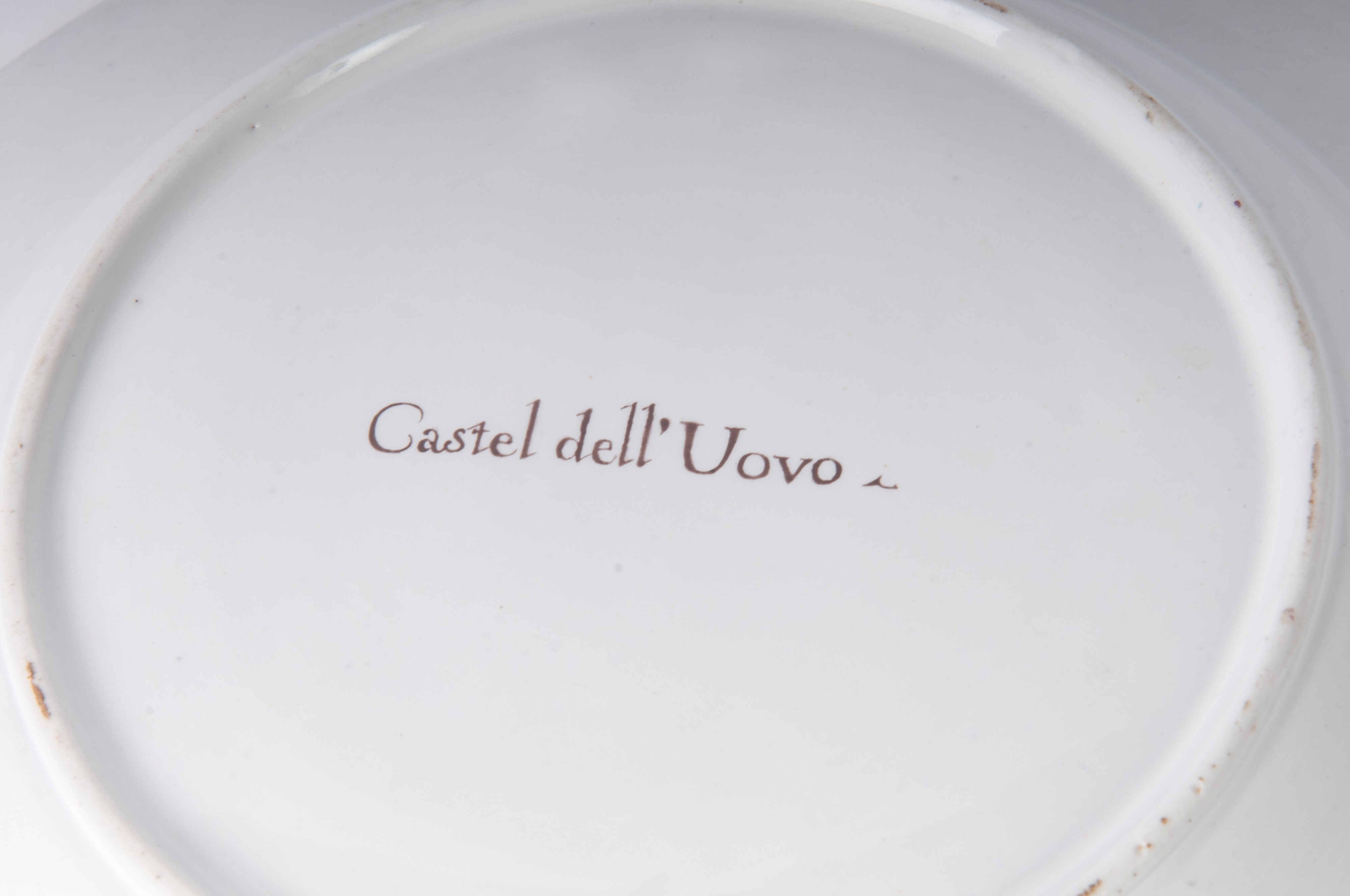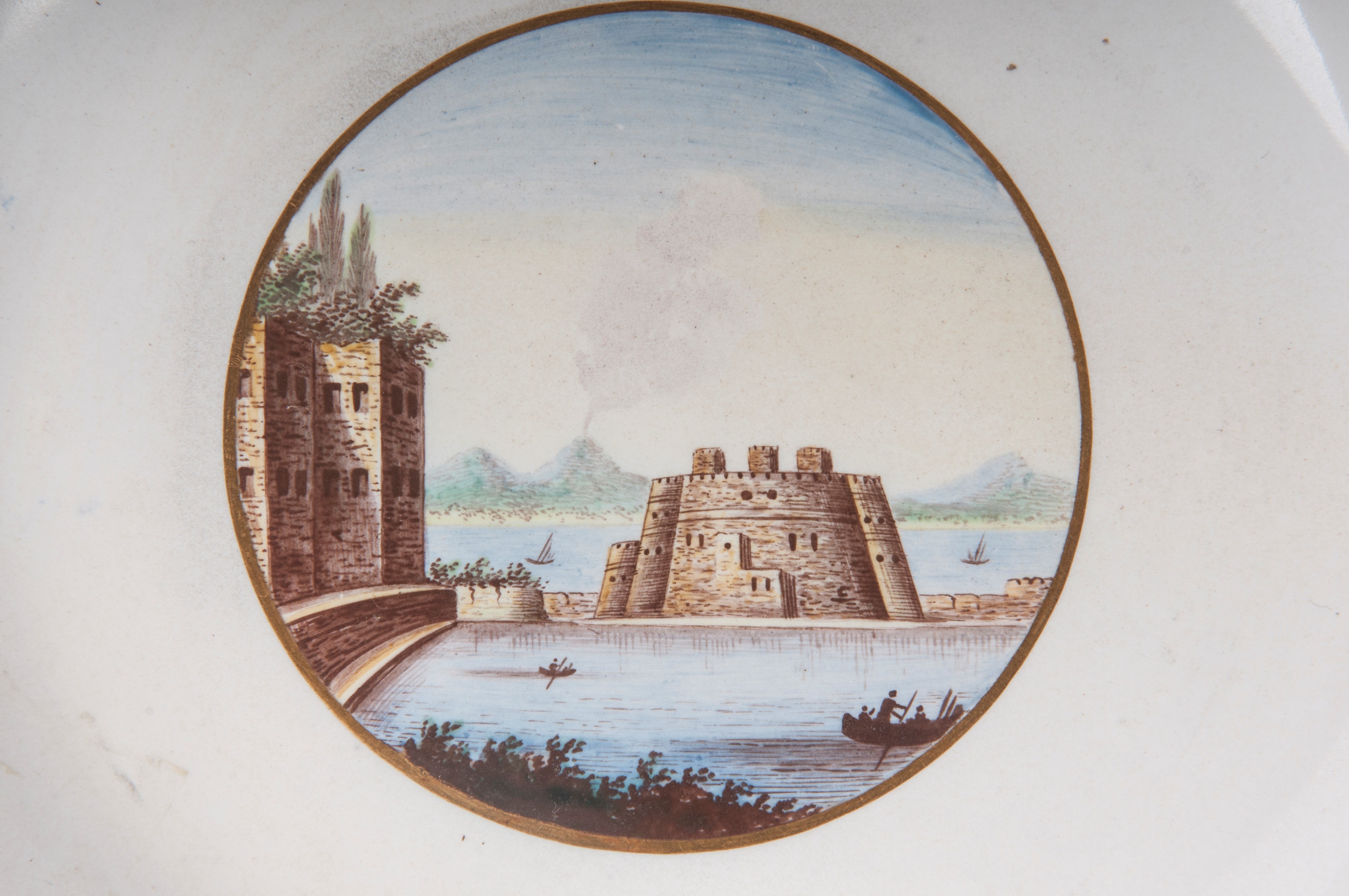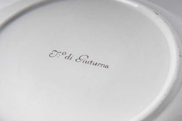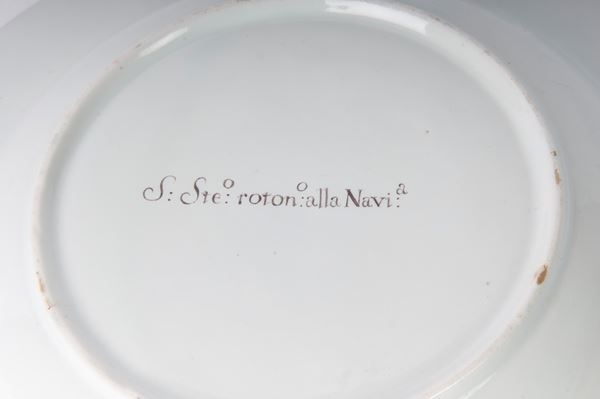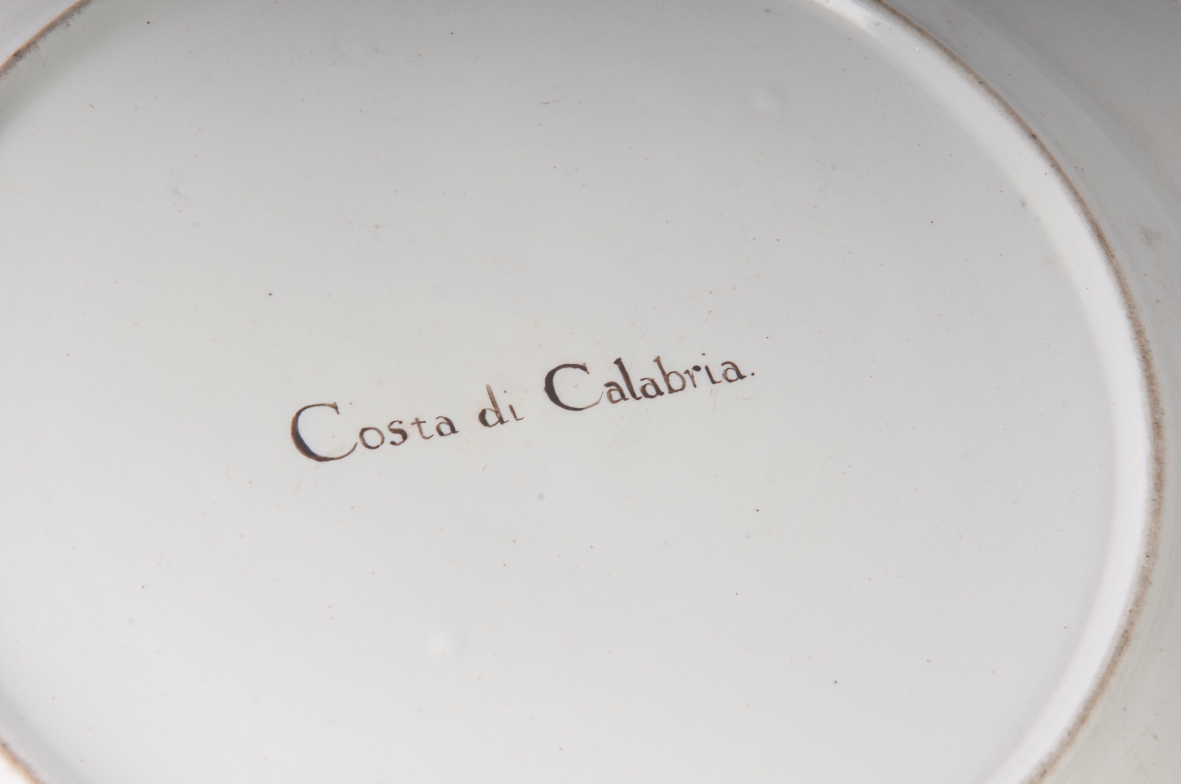 Ampia tesa con ripida balza e largo fondo, al retro appoggio ad anello con fondo leggermente ribassato. Decoro con veduta dei monumenti di Roma/Calabria e Napoli entro riserva dorata su fondo bianco. Bordo blu cobalto con doppia profilatura in oro zecchino.