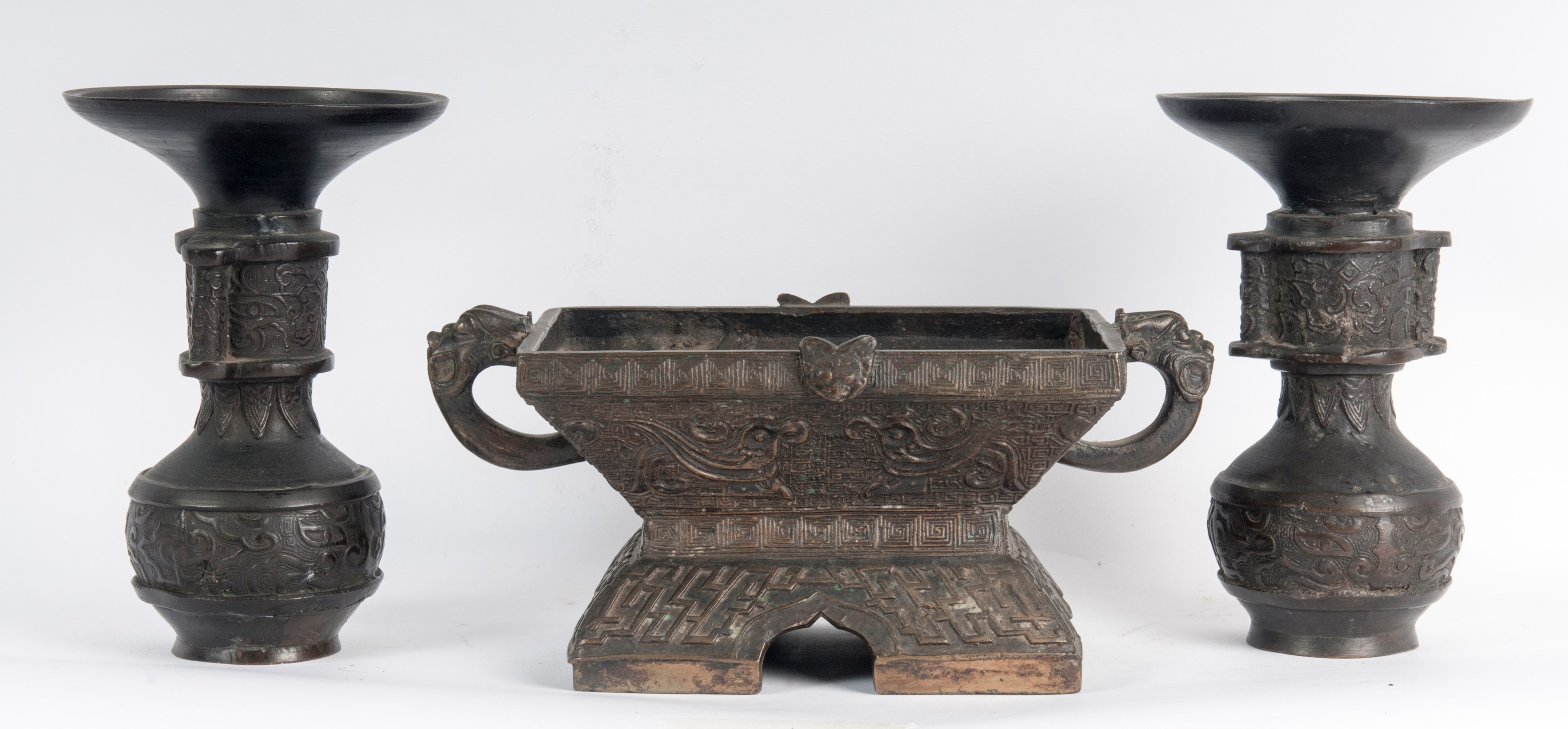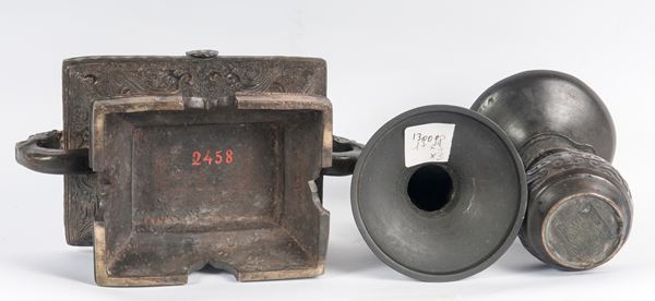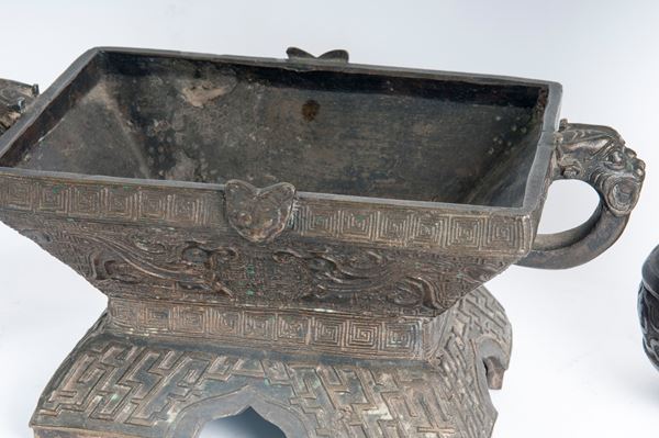 brucia incensi di forma rettangolare con anse a mascherone, corpo a vasca con decoro a rilievi geometrici e vegetali, base a quattro archi a sesto acuto 12,5 x 20,5 x 15,5 cm. Arte indo-cinese.