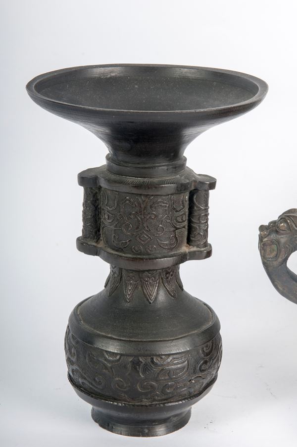 in bronzo: coppia di vasi a bulbo con nodo sul fusto e decoro a rilievo a motivi vegetali 20 x 13,5 x 6 cm;