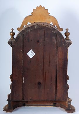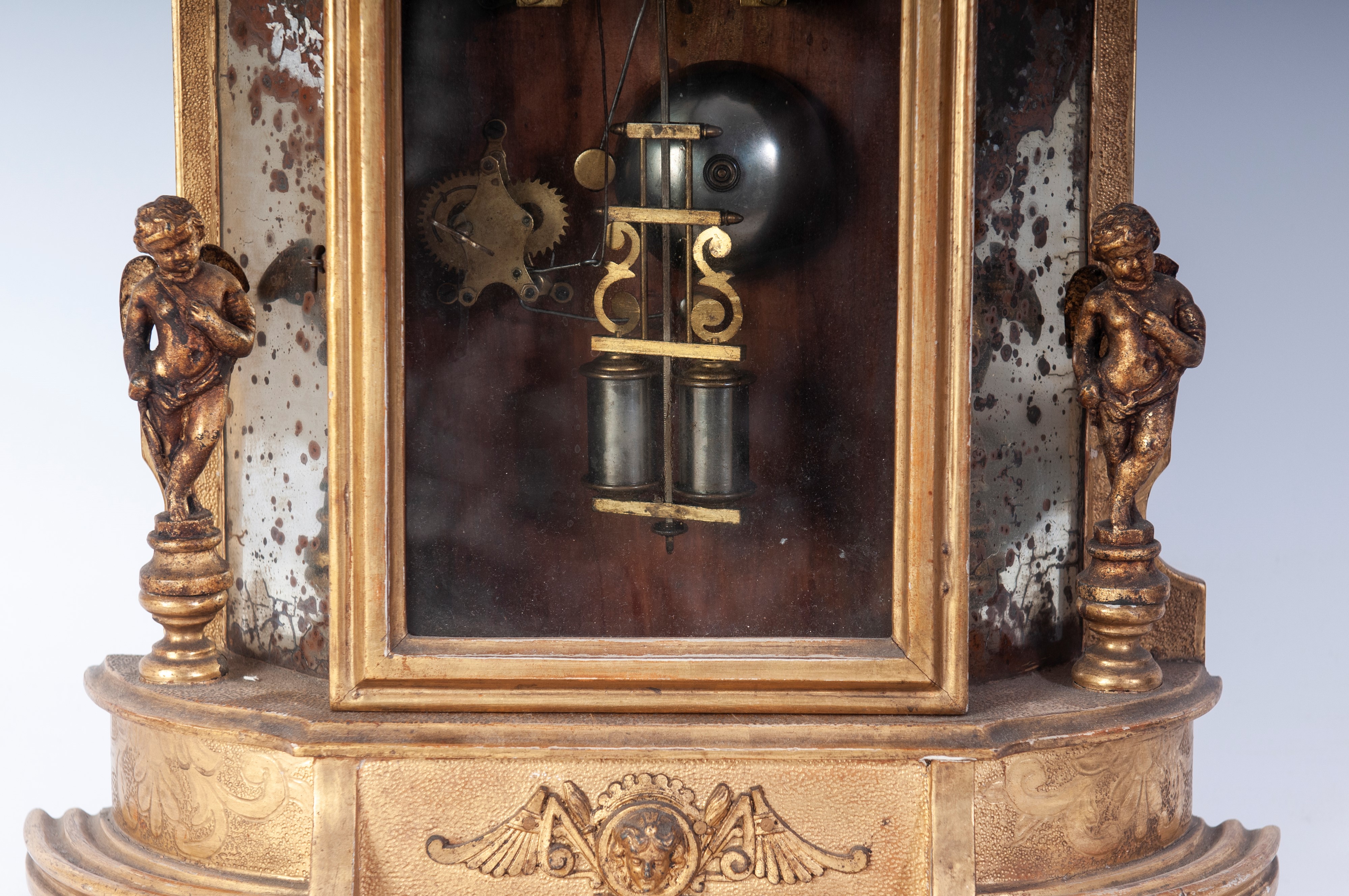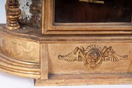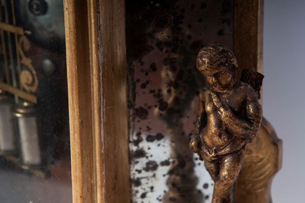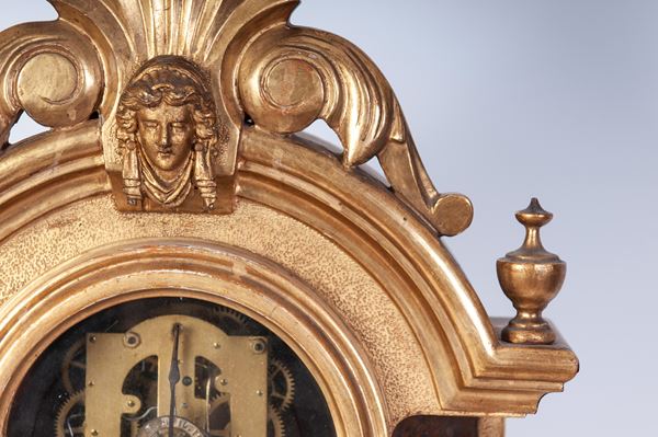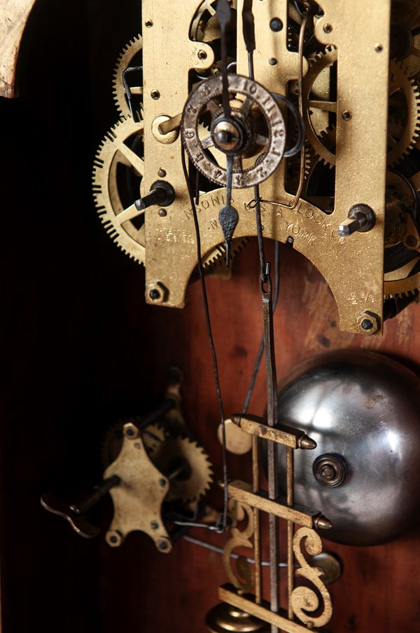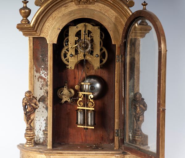 meccanismo a pendolo con distanziatore a fascia. Ripetizione dell'ore e delle mezz'ore. Cassa in legno dorata a bacheca con elementi decorativi a forma di putto in metallo dorato. Macchina non testata e firmata Ansonia clock e co
